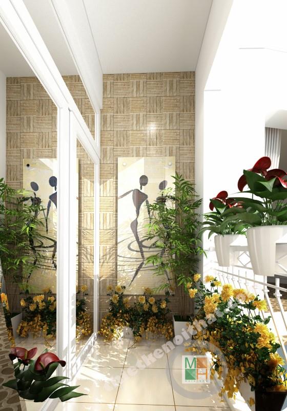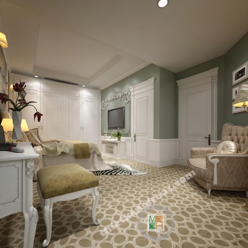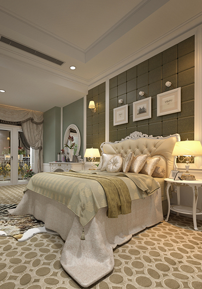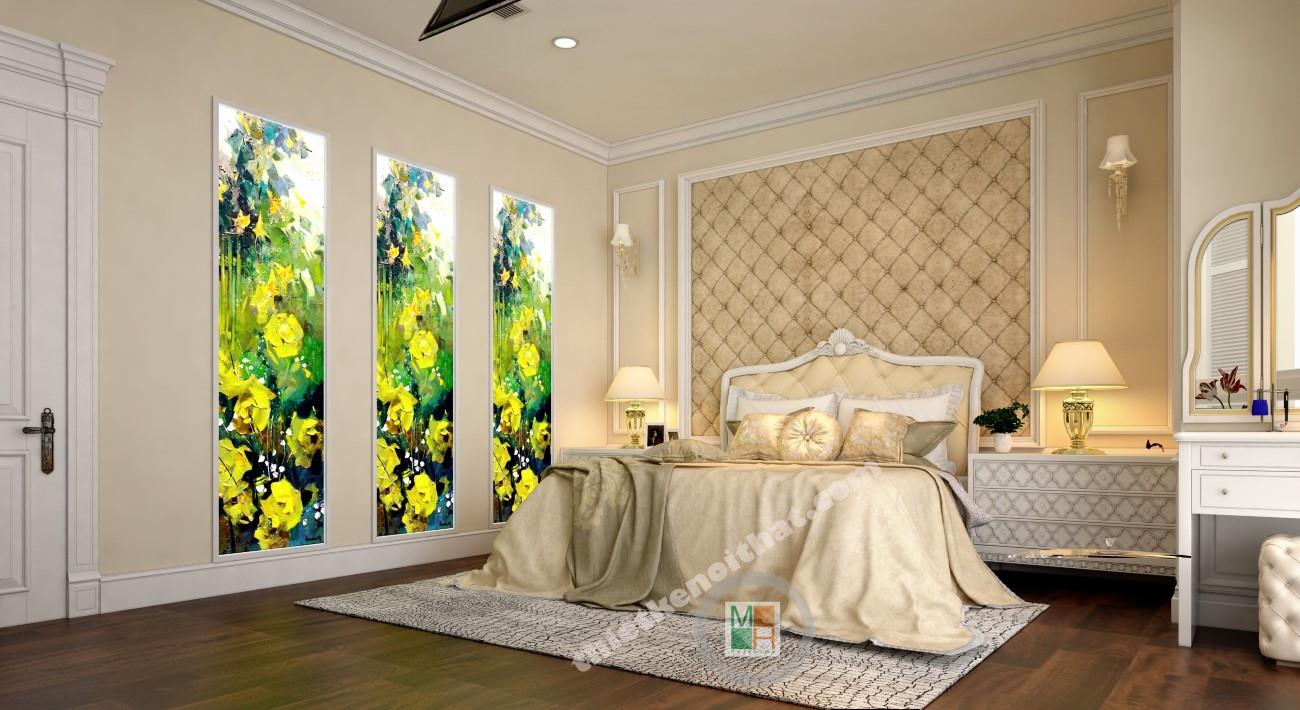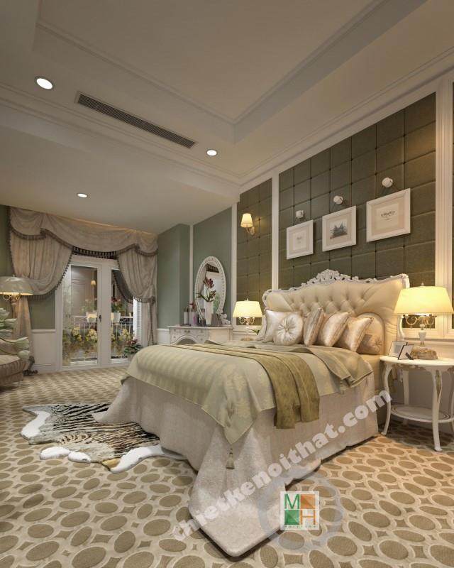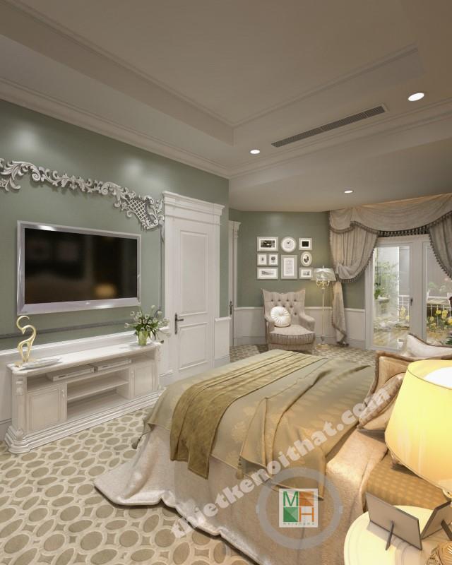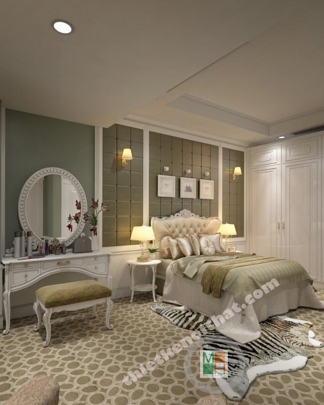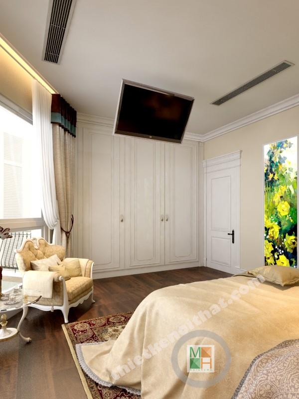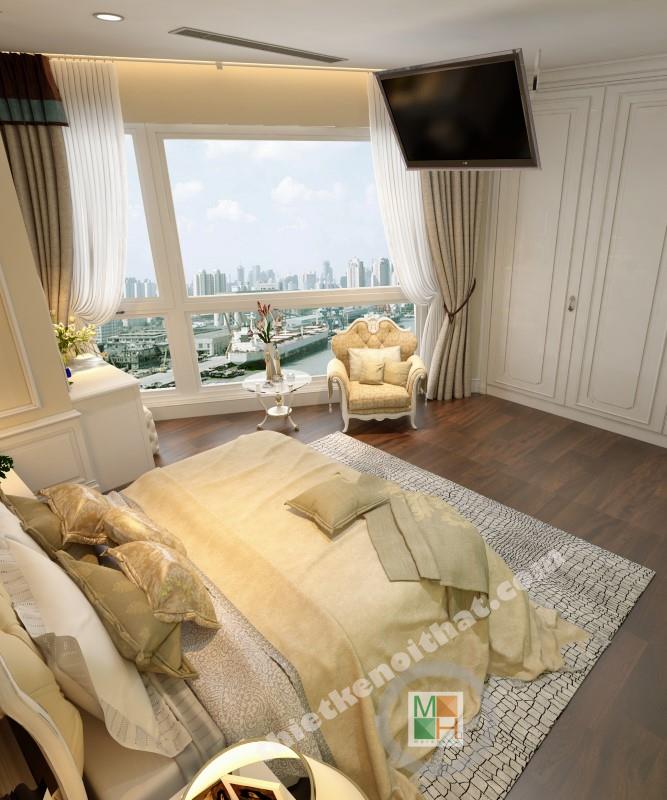 Phòng ngủ chính thể hiện được đẳng cấp với giường ngủ king size và những họa tiết trang trí đẹp mắt. Những ô đá màu ghi ở mảng tường đầu giường tạo chiều sâu cho không gian và làm nền để tôn lên các đồ dùng màu trắng. Bàn trang điểm với những đường cong mềm mại đem đến sự lãng mạn cho không gian phòng ngủ. Những đường viền hoa trang trí tường ở trên tivi vừa nhẹ nhàng lại đạt được tính thẩm mỹ cao. Bên cạnh cửa kính dẫn ra ngoài loggia có đặt một chiếc ghế tựa để gia chủ có thể ngồi uống café và ngắm cảnh bình minh mỗi ngày. Bên ngoài loggia có bố trí những chậu cây cảnh nhỏ để tạo thành một khu vườn mini, tốt cho sức khỏe và thêm sắc xanh cho căn hộ.