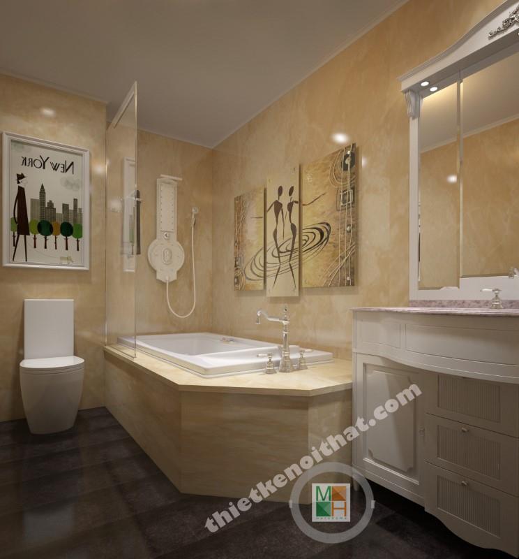 Phòng tắm được lát bằng đá marble sáng màu và sử dụng nội thất sứ màu trắng nên tạo được cảm giác sạch sẽ và rộng rãi. Bồn tắm nằm hiện đại đem đến những phút giây ngâm mình thoải mái sau ngày làm việc mệt mỏi.
