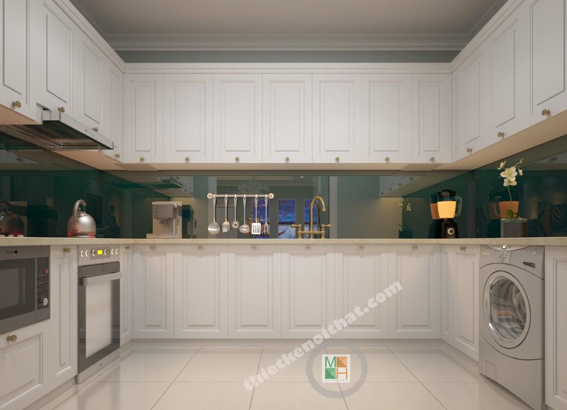 Căn bếp có diện tích nhỏ nhưng được bố trí thông minh để khộng mang lại cảm giác chật chội. Phần sàn lát gạch trắng để tách bạch rõ ràng với không gian phòng khách. Tủ bếp cũng được sơn trắng để căn bếp trông trang nhã và lịch sự hơn. Mảng tường ở giữa được ốp một lớp kính màu xanh để cân bằng lại màu sắc và tiện lợi hơn khi lau chùi, tẩy rửa. Các thiết bị nấu nướng hiện đại được sắp xếp âm vào trong tủ bếp để tạo sự gọn gàng, thoáng đãng cho căn phòng.