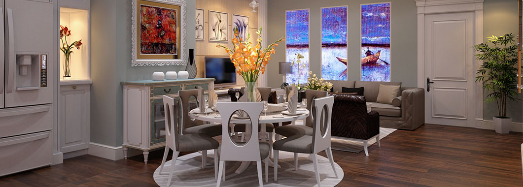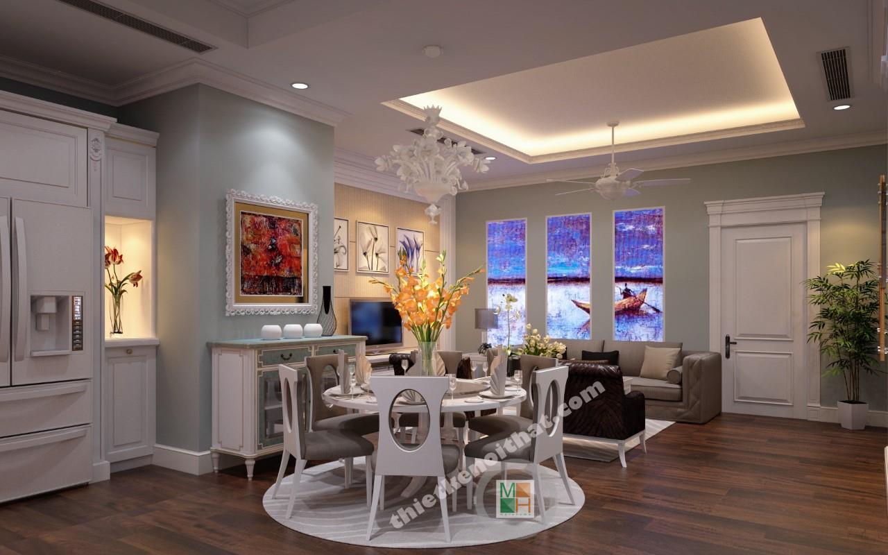 Bàn ăn được để cách phòng khách một khoảng vừa phải để tạo sự thông thoáng và dễ dàng di chuyển. Thảm ăn ở dưới bàn và ở phòng khách có hình dáng khác nhau là một cách phân vùng không gia hiệu quả. Bàn ăn dạng tròn khiến việc bố trí chỗ ngồi thuận tiện và cơ động hơn. Tủ đựng dụng cụ ăn uống được sát bức tường kế bên bàn để thuận tiện cho việc sử dụng, không phải di chuyển nhiều. Có thể trang trí thêm trên bàn bằng một lọ hoa nhỏ hay treo xung quanh khu vực đó những bức tranh màu sắc, tạo không khí vui vẻ.