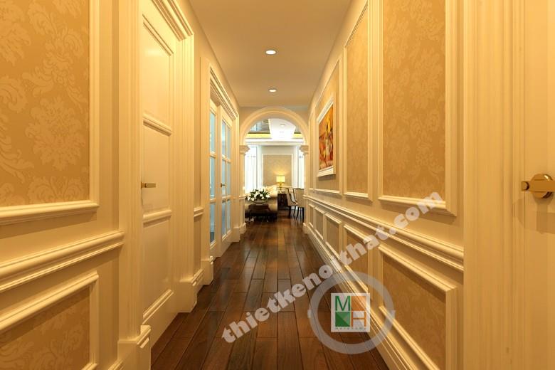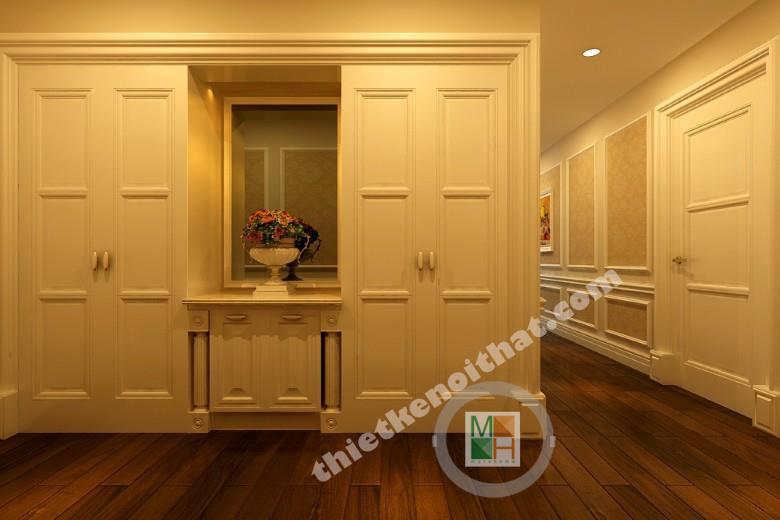 Khi nhận thiết kế chung cư cao cấp Royal của anh Thắng các kiến trúc sư của Morehome đã quyết định lựa chọn thiết kế nội thất căn hộ theo phong cách tân cổ điển, hiện đại và đẳng cấp. Tường sơn màu trắng được đan xen với những mảng giấy màu kem để làm giảm sắc độ lạnh và mang đến sự tinh tế trong trang trí. Các khoảng đệm trong nhà được bố trí đèn downlight thích hợp để khi di chuyển không bị cảm giác bó hẹp và đảm bảo đủ sáng. Từ cửa bước vào chúng ta có thể thấy tủ giày được bố trí ngăn nắp ở ven tường, đi kèm là diện gương lớn để chỉnh đốn trang phục trước khi ra khỏi nhà.