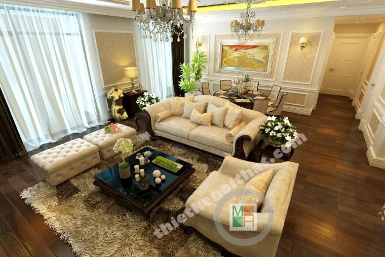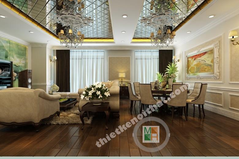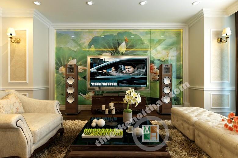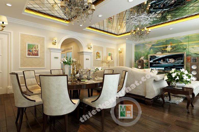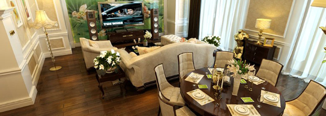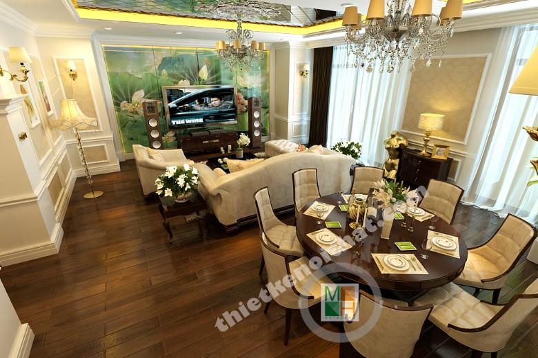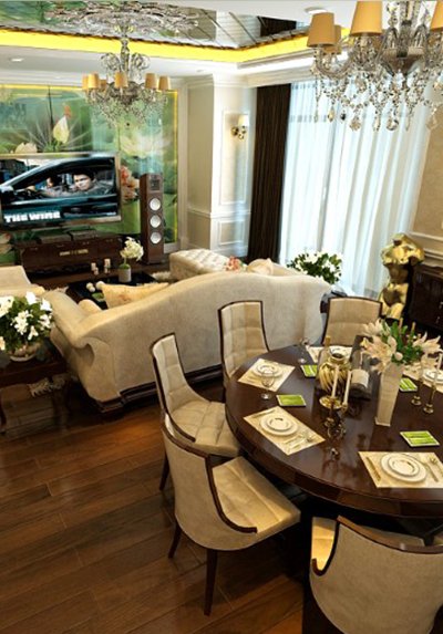 Phòng khách và phòng ăn được thiết kế liền kề để tạo một không gian sinh hoạt chung ấm cúng, thân mật giữa các thành viên trong gia đình. Bộ sofa màu trắng với những đường cong mềm mại đem đến sự mềm mại và sang trọng. Phía dưới là tấm thảm lông vừa có tác dụng kê chân lại giúp phân vùng không gian với bàn ăn một cách hiêu quả. Điểm nhấn của căn phòng nằm ở bức tranh tường phía sau tivi. Toàn bộ mảng tường được trang trí bởi bức tranh kính hình lá sen, đem sắc xanh của thiên nhiên vào cho không gian. Bàn ăn dạng tròn tạo cảm giác quây quần ấm áp cho bữa ăn gia đình. Ngoài ra việc lựa chọn bàn ăn như vậy khiến ta cơ động hơn trong việc bố trí chỗ ngồi. Màu sắc của những chiếc ghế ăn có sự tương đồng với sofa để tạo sự đồng bộ trong thiết kế. Hệ thống cửa kính bên hông phòng giúp không gian có thêm ánh sáng và tạo sự thong thoáng. Có thể trang trí thêm trên những bức tường trống một vài khung tranh nhỏ để tạo không khí vui vẻ, gần gũi.
