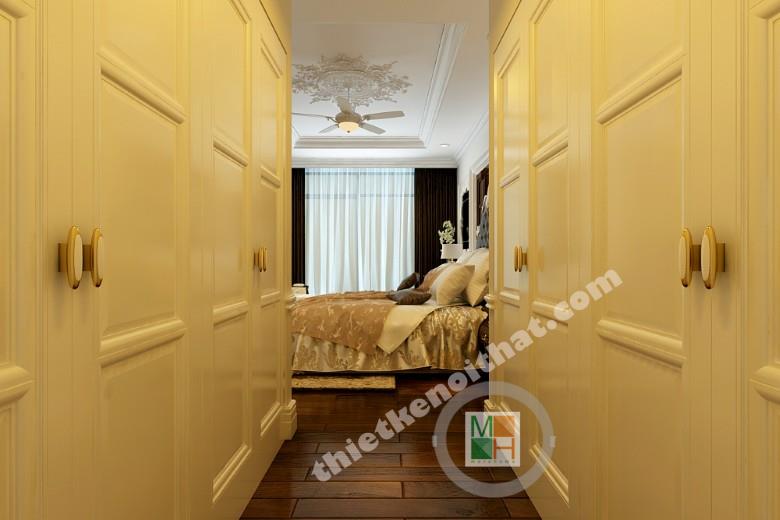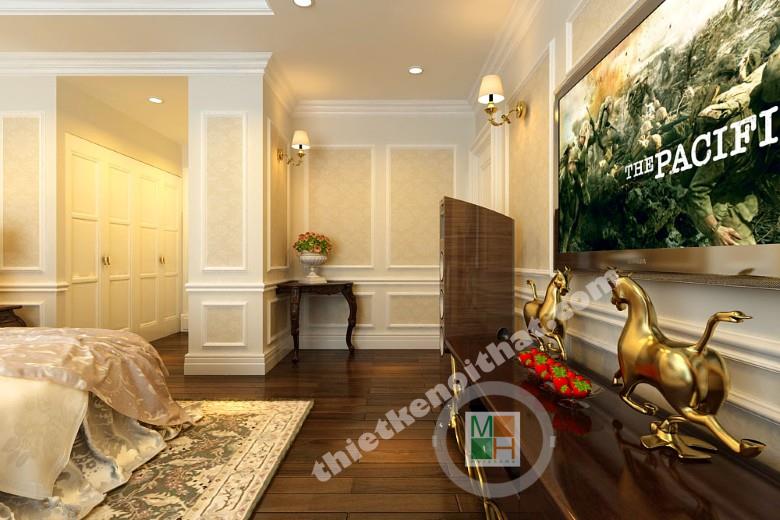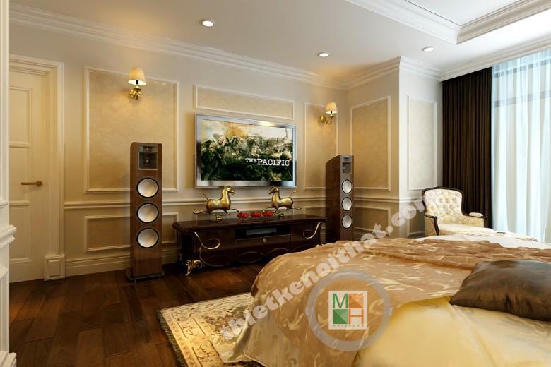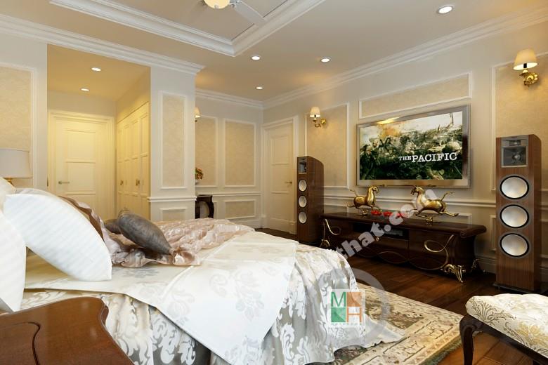 Phòng ngủ chính thể hiện được đẳng cấp sang trọng với giường ngủ king size và nội thất đẹp mắt. Bàn trang điểm và táp được đặt hai bên giường nhằm tập trung điểm nhìn vào chính giữa, tạo điểm nhấn. Diện gương lớn với những đường viền đầy tính nghệ thuật, đem đến sự lãng mạn cho không gian. Chiếc ghế kê sát cửa sổ là nơi lí tường để ngồi thưởng thức những ly trà nóng hay một tách café vào buổi sáng. Hệ thống tủ quần áo được sắp xếp âm vào hai bên tường cạnh cửa ra vào để tiết kiệm diện tích và tang không gian lưu trữ lên đáng kể.
