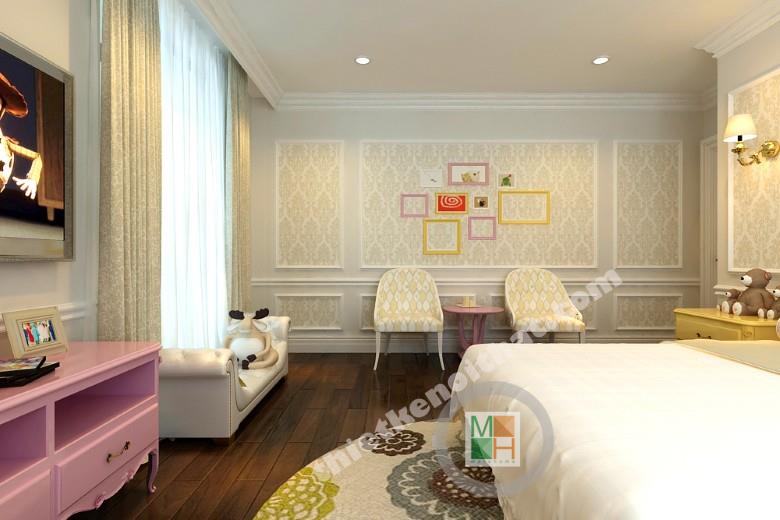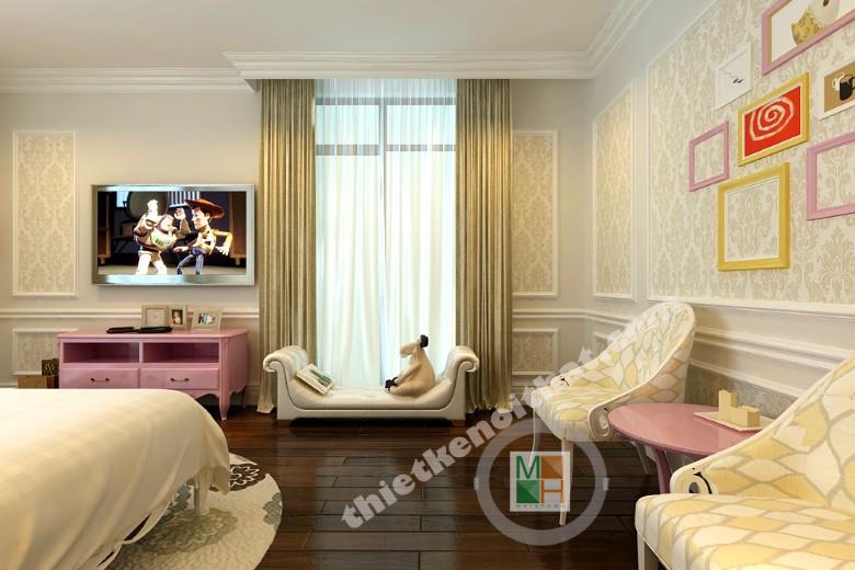 Phòng ngủ của con gái ngoài màu trắng chủ đạo còn được thêm vào những màu sắc ngộ nghĩnh và dễ thương. Chiếc kệ tivi màu hồng hay những chiếc táp vàng đầu giường là những điểm nhấn nhá thú vị, tạo không khí vui tươi và sinh động cho căn phòng. Dưới cửa sổ là một chiếc ghế dài để con có thể nằm ngả ngốn đọc những cuốn truyện, cuốn sách hay. Ánh sáng ngoài cửa sổ và từ đèn đảm bảo cho con một không vui chơi, học tập thoải mái nhất.