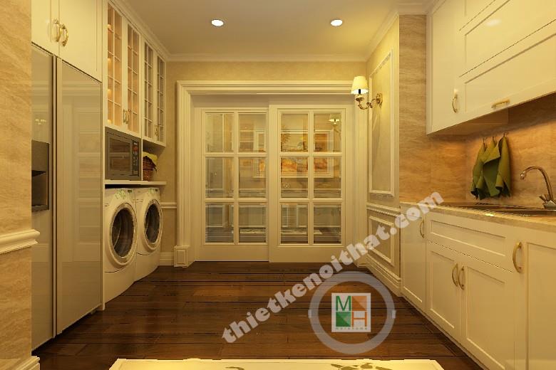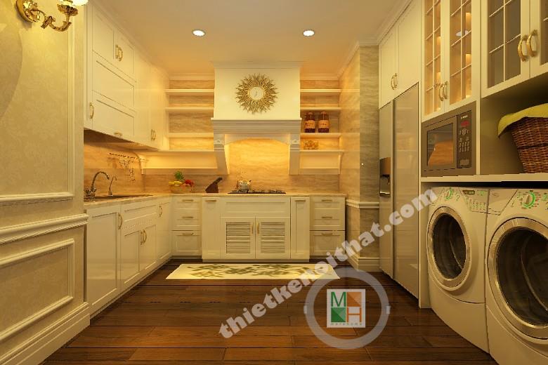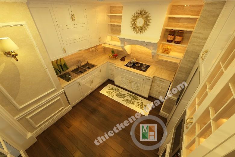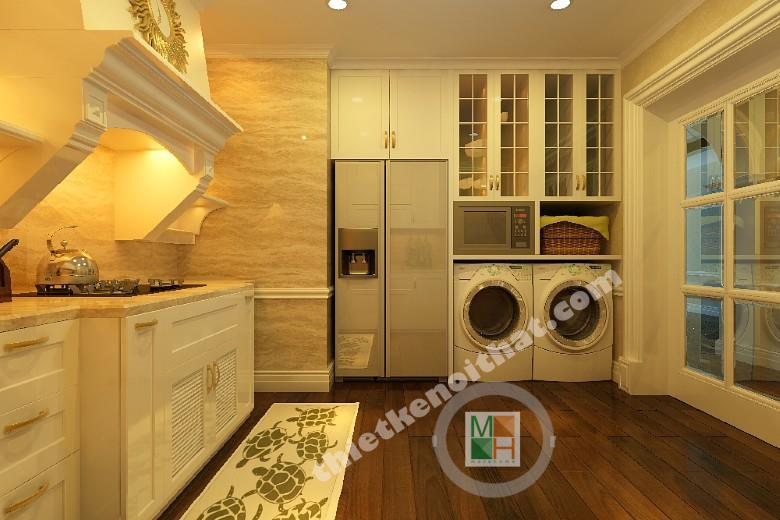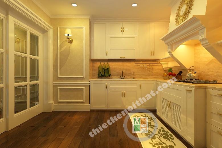 Gian phòng bếp không lớn nhưng đảm bảo đầy đủ tiện nghi và đầy tính thẩm mỹ cao. Toàn bộ tủ bếp được sơn trắng trang nhã khiến cho không gian trông sạch sẽ và thoáng đãng hơn. Đèn tường màu vàng và sàn nhà sẫm màu giúp căn phòng không bị đơn điệu mà không phá vỡ mảng màu trắng chủ đạo. Tủ bếp và các thiết bị nấu nướng được sắp xếp gọn gàng để không gây khó khăn khi di chuyển trong phòng. Hút mùi hiện đại dễ tạo ra sự lạc lõng trong tổng thể nội thất nên các kiến trúc sư đã khép léo thêm vào những đường nét và chi tiết cổ điển để đồng nhất với tủ đồ xung quanh. Cánh cửa ngăn với bên ngoài có những ô kính để không mang đến cảm giác chật chội khi ở bên trong. Đây chính là góc nhìn nghệ thuật trong mẫu thiết kế nội thất chung cư này