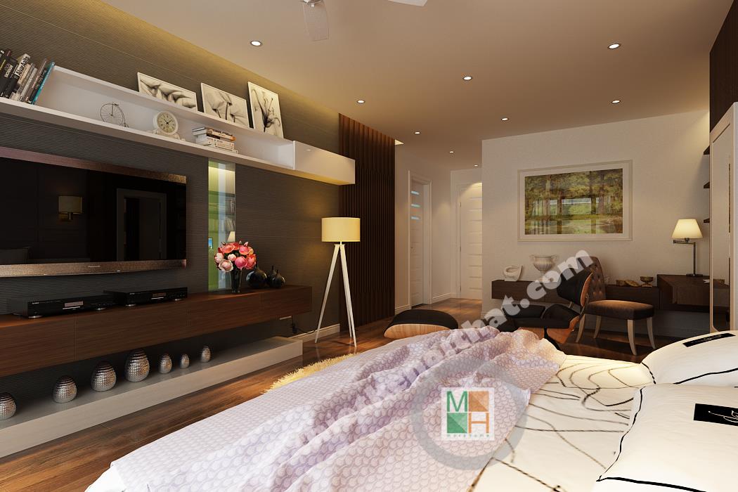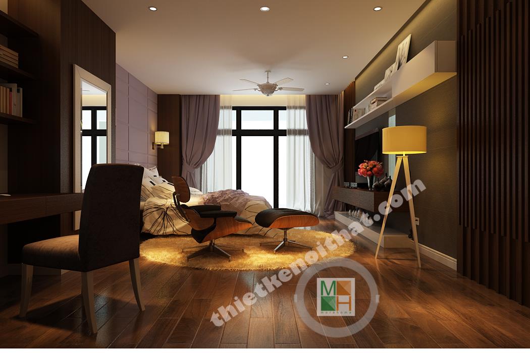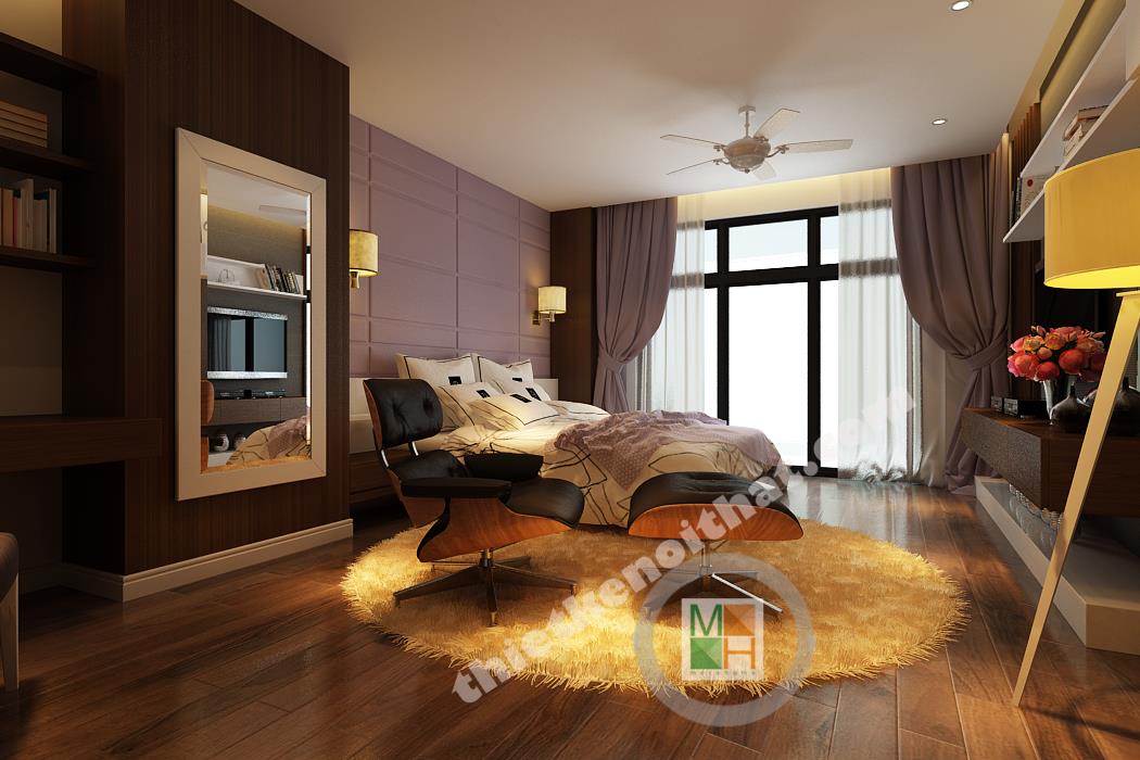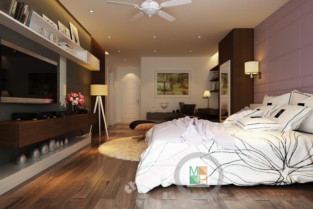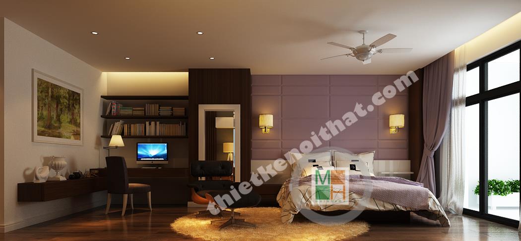Phòng ngủ chính có diện tích rộng nên nội thất được bố trí thoáng, tạo cảm giác thoải mái nhất cho gia chủ. Khu vực bàn làm việc bố trí nội thất đều là gỗ, từ kệ sách đến mảng tường treo gương bên cạnh, tạo cảm giác gần gũi, giảm bớt sự mệt mỏi. Mảng tường đầu giường được sơn tím để ăn nhập với màu rèm cửa và ga trải giường, tạo cảm giác lãng mạn, quyến rũ. Mảng tường treo tivi gồm nhiều tông màu tối ghép lại nên sự xuất hiện của chiếc kệ trắng làm mảng tường trông cá tính và độc đáo. Phòng ngủ này thực sự đặc biệt bởi căn buồng nhỏ để tủ quần áo và phụ kiện thời trang khác. Căn buồng được bố trí tủ đồ với hai màu nâu và trắng đan xen với rất nhiều ngăn tiện lợi, làm hài lòng những bà nội trợ có sở thích mua sắm quần áo.