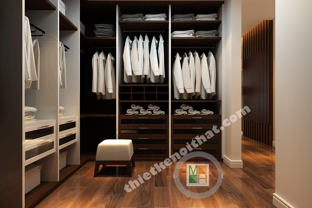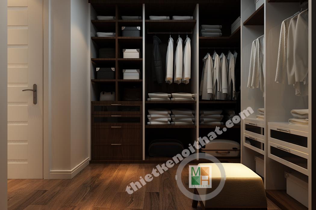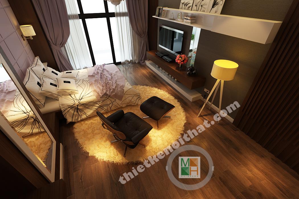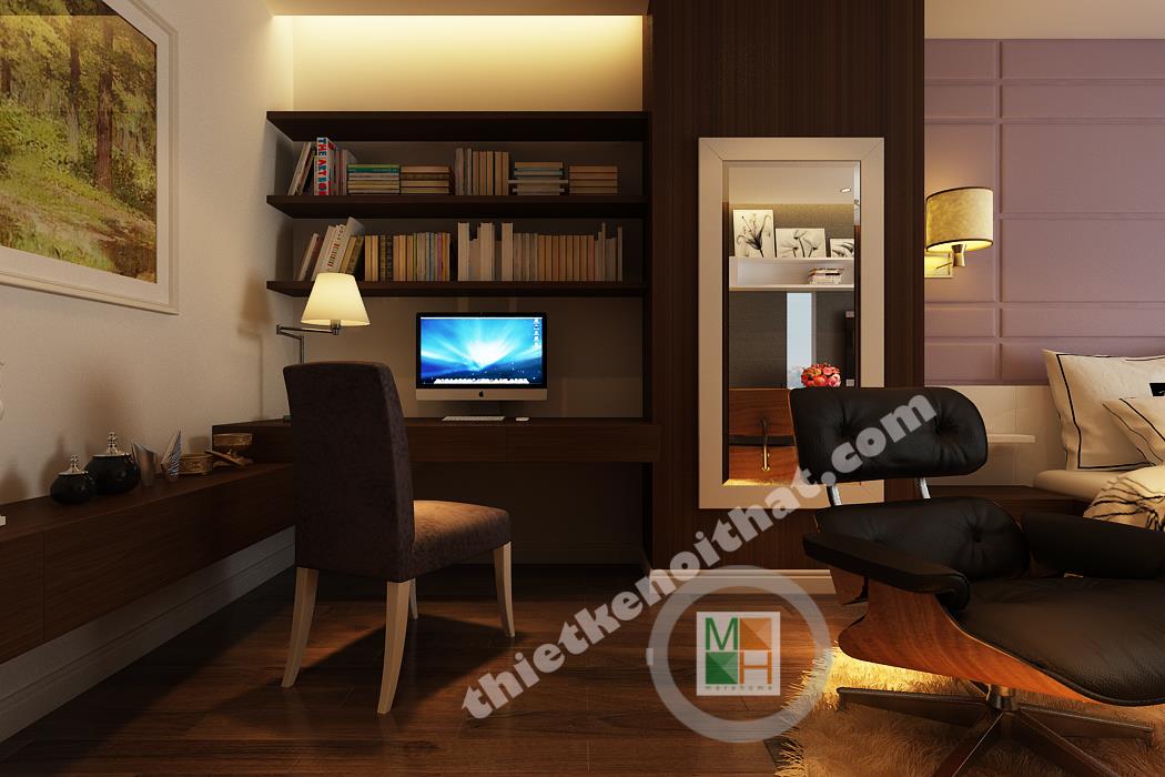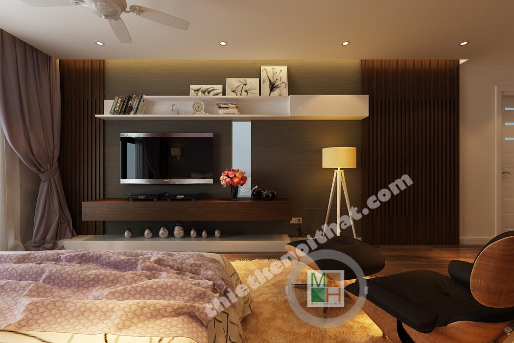 Phòng ngủ chính có diện tích rộng nên nội thất được bố trí thoáng, tạo cảm giác thoải mái nhất cho gia chủ. Khu vực bàn làm việc bố trí nội thất đều là gỗ, từ kệ sách đến mảng tường treo gương bên cạnh, tạo cảm giác gần gũi, giảm bớt sự mệt mỏi. Mảng tường đầu giường được sơn tím để ăn nhập với màu rèm cửa và ga trải giường, tạo cảm giác lãng mạn, quyến rũ. Mảng tường treo tivi gồm nhiều tông màu tối ghép lại nên sự xuất hiện của chiếc kệ trắng làm mảng tường trông cá tính và độc đáo. Phòng ngủ này thực sự đặc biệt bởi căn buồng nhỏ để tủ quần áo và phụ kiện thời trang khác. Căn buồng được bố trí tủ đồ với hai màu nâu và trắng đan xen với rất nhiều ngăn tiện lợi, làm hài lòng những bà nội trợ có sở thích mua sắm quần áo.