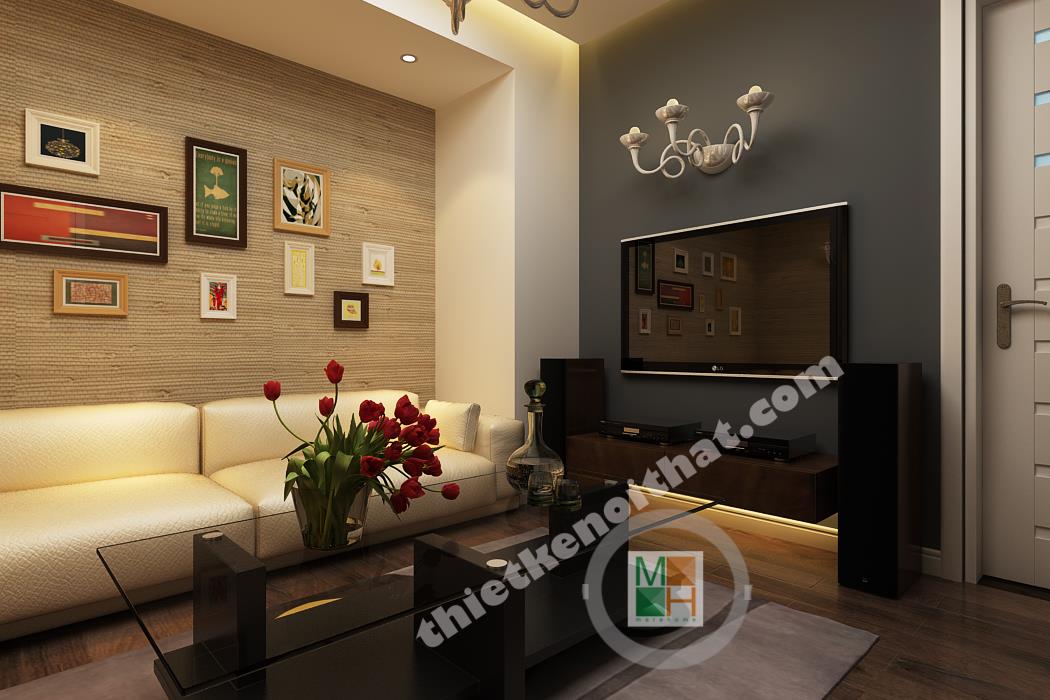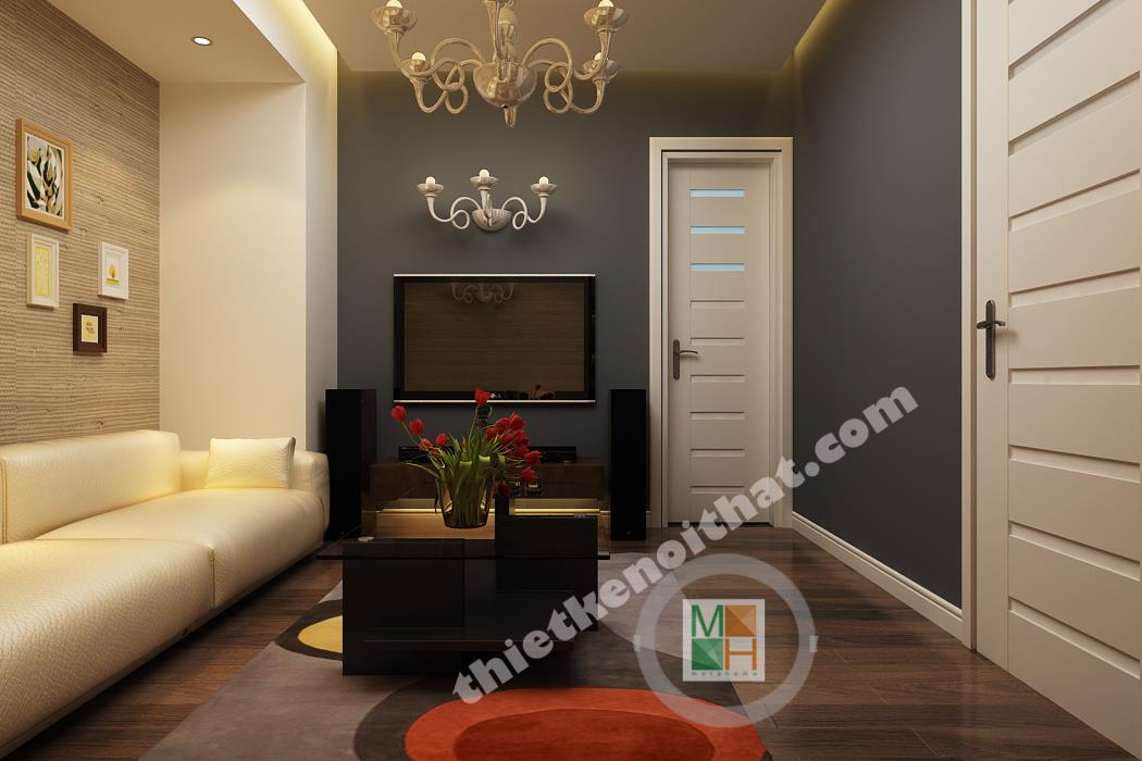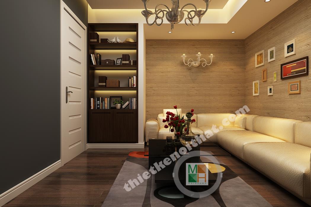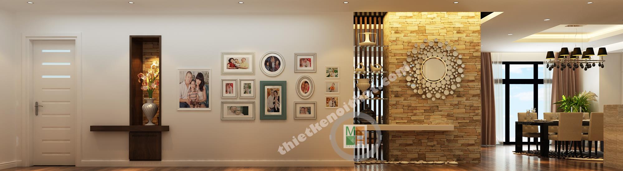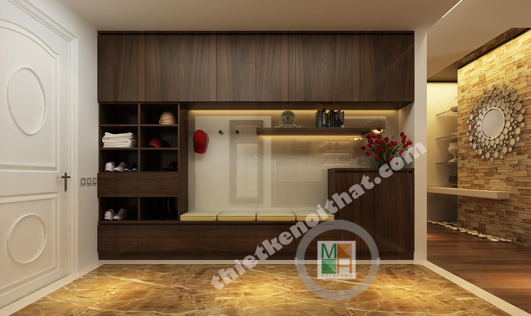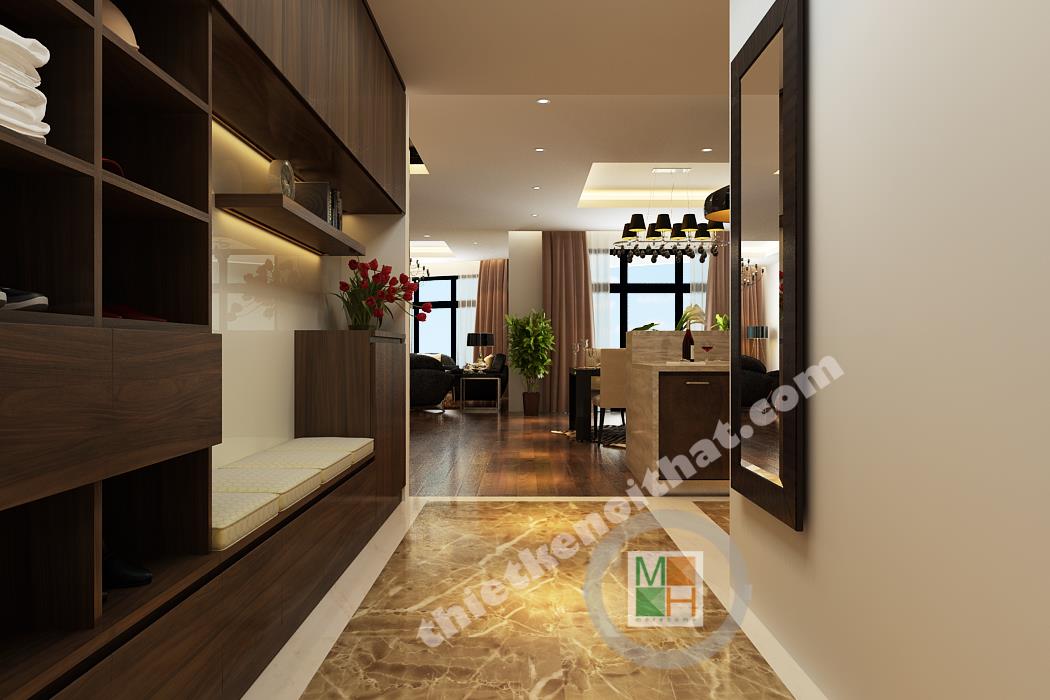 Sự kết hợp giữa gam màu trung tính và hai màu đen trắng làm cho căn hộ trở nên tinh tế và quyến rũ. Cạnh cửa ra vào của căn hộ có bố trí tủ giày gỗ âm tường đẹp mắt và được kết hợp chung với ghế đệm. Đi từ sảnh vào là bếp và bàn ăn được bố trí thành một khối gần nhau. Phần sàn từ sảnh vào bếp đều được lát đá bóng màu nâu bởi sàn gỗ dễ hỏng nếu như tiếp xúc nhiều với nước.