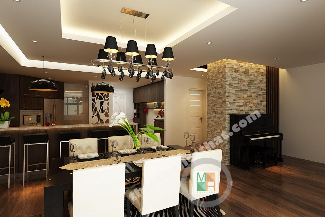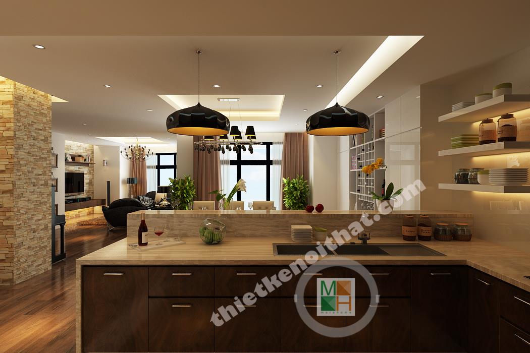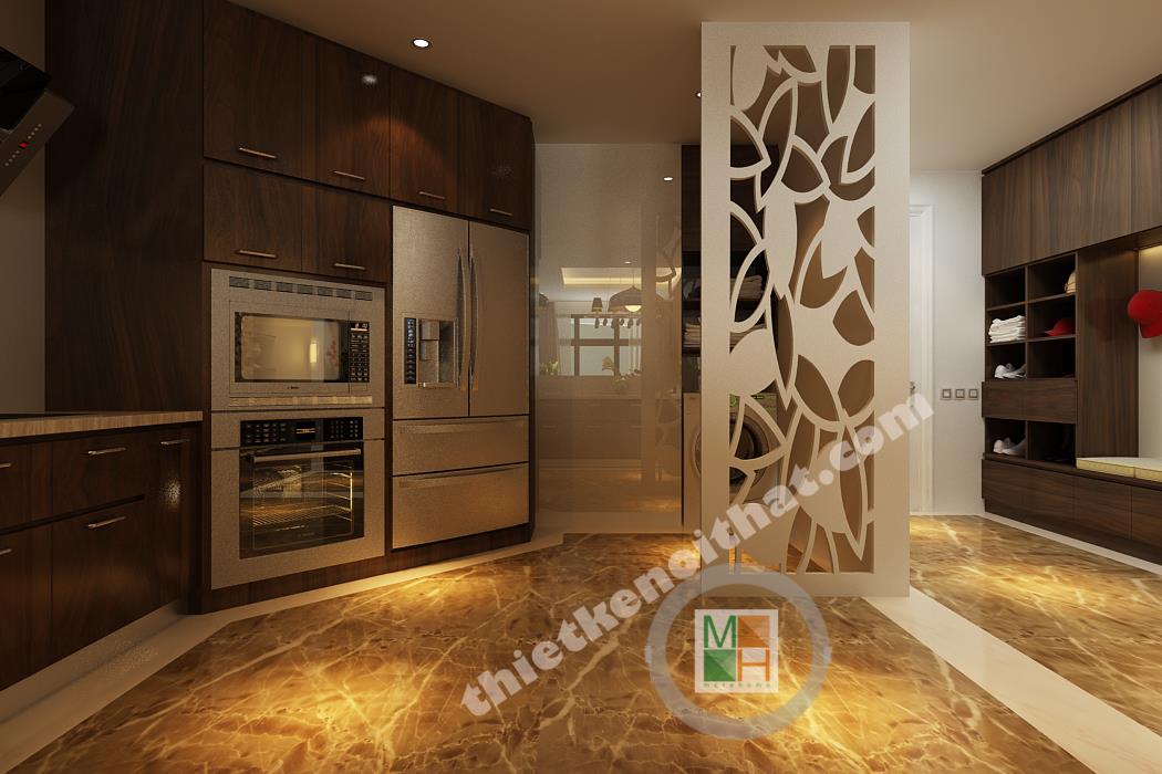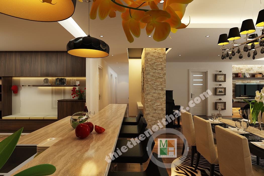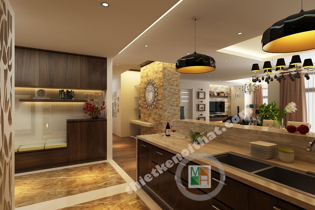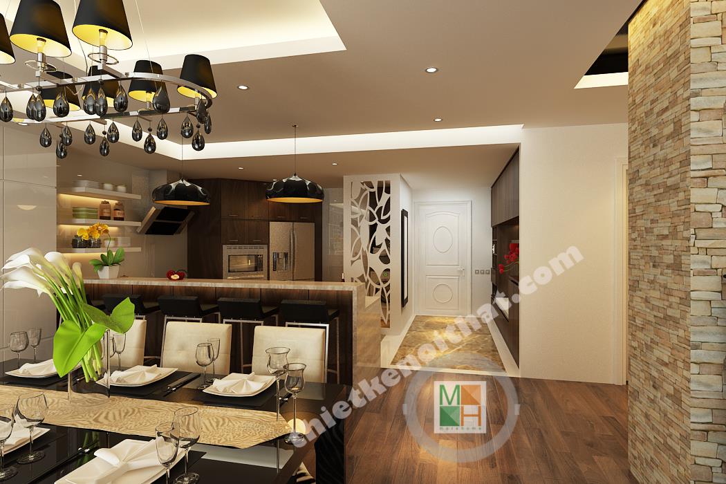 Bếp và bàn ăn được ngăn cách với nhau bằng một ngăn lửng nhỏ bằng gỗ lát đá ở trên. Ngăn lửng này được tận dụng làm quầy bar một bên, còn một bên đặt bồn rửa và tủ bếp tiện lợi. Bộ bàn ghế ăn làm bằng gỗ, có kiểu dáng đơn giản và màu sắc ăn nhập với tông màu chính của căn hộ. Điểm nhấn ở bàn ăn là chiếc đèn trùm độc đáo có khung làm bằng inox sáng, đem lại không khí đầm ấm cho không gian ở đây. Phòng bếp tuy không lớn nhưng được trang bị đầy đủ các thiết bị và vật dụng cần thiết nhất. Tủ lạnh, lò vi sóng, lò nướng đều được đặt âm tường để tiết kiệm diện tích và trông gọn gàng hơn. Hệ thống tủ bếp tiện lợi được làm bằng gỗ nâu thẫm lịch sự và tạo cảm giác gần gũi. Tường bao quanh bếp được lát bằng đá bóng để tiện cho việc lau chùi, dọn dẹp. Góc trong cùng của bếp đặt máy giặt và kệ đồ để khăn. Phần không gian này được đặt cách bếp một mảng tường nhỏ và được che từ bên ngoài bởi vách cnc để tránh tạo cảm giác hớ hênh và không liên quan đến không liên quan đến bếp.