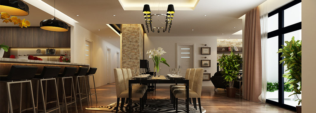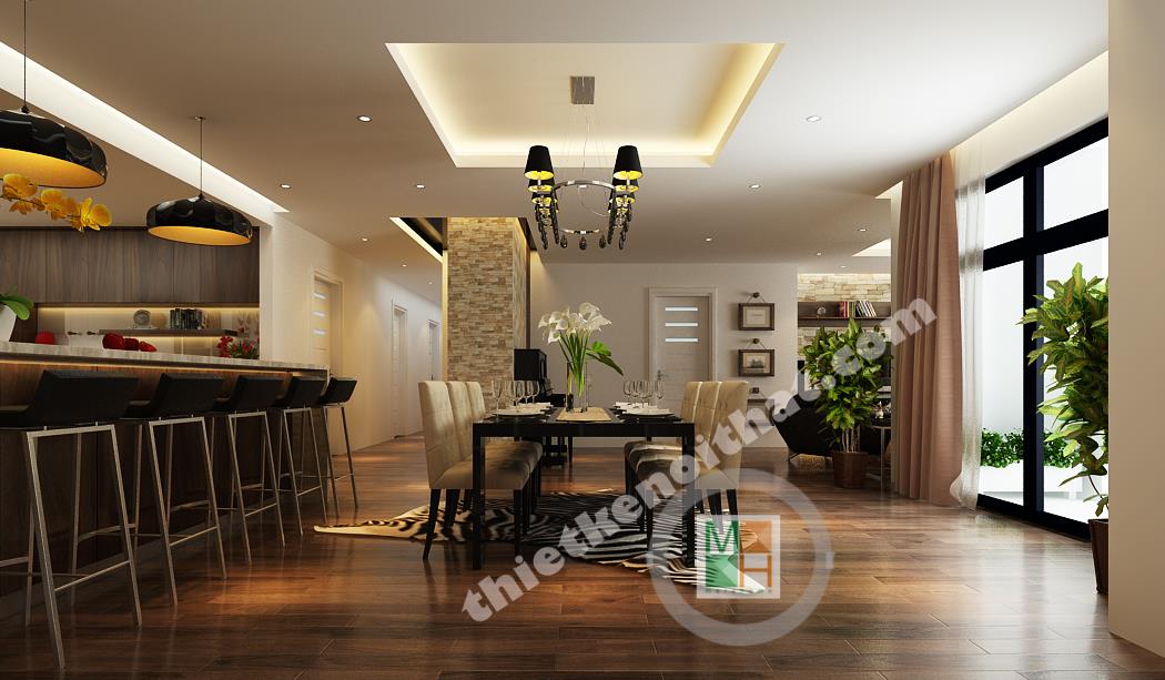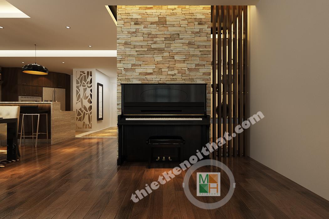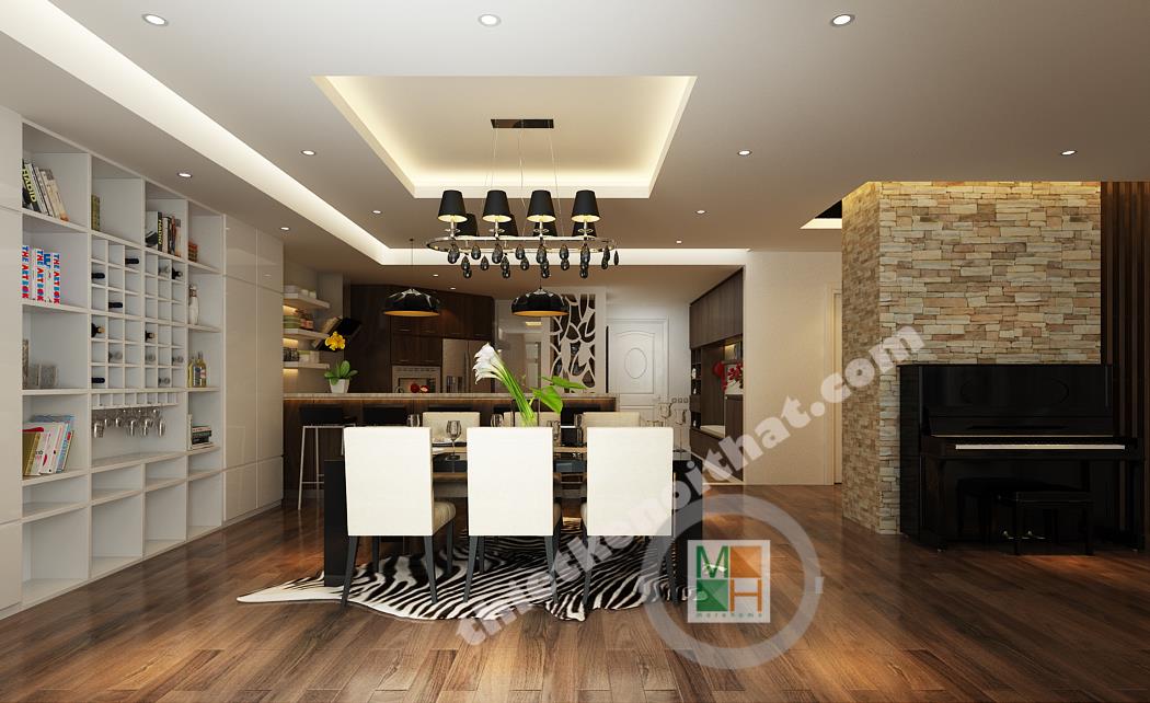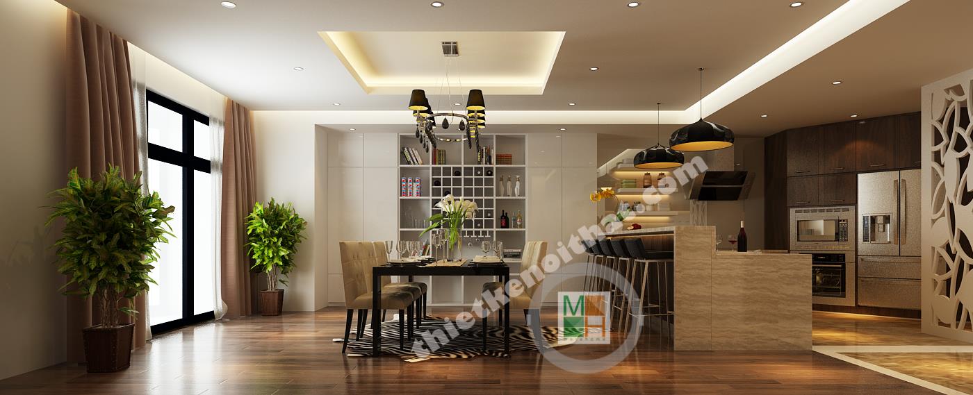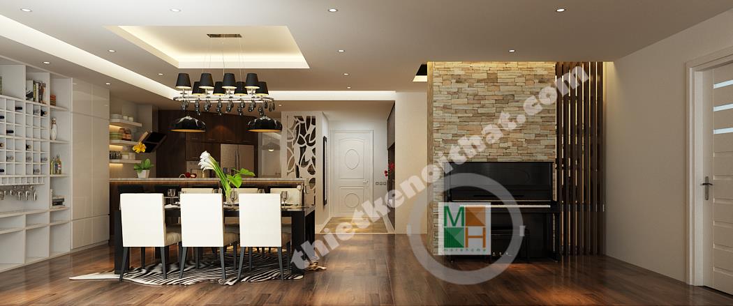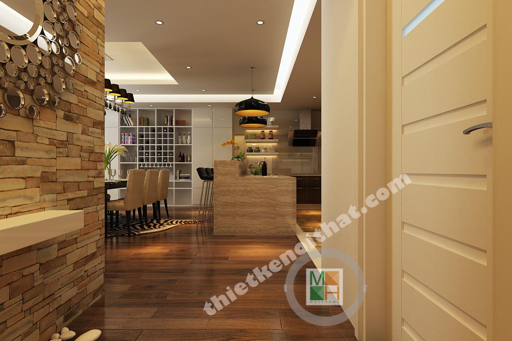 Bếp và bàn ăn được ngăn cách với nhau bằng một ngăn lửng nhỏ bằng gỗ lát đá ở trên. Ngăn lửng này được tận dụng làm quầy bar một bên, còn một bên đặt bồn rửa và tủ bếp tiện lợi. Bộ bàn ghế ăn làm bằng gỗ, có kiểu dáng đơn giản và màu sắc ăn nhập với tông màu chính của căn hộ. Điểm nhấn ở bàn ăn là chiếc đèn trùm độc đáo có khung làm bằng inox sáng, đem lại không khí đầm ấm cho không gian ở đây. Phòng bếp tuy không lớn nhưng được trang bị đầy đủ các thiết bị và vật dụng cần thiết nhất. Tủ lạnh, lò vi sóng, lò nướng đều được đặt âm tường để tiết kiệm diện tích và trông gọn gàng hơn. Hệ thống tủ bếp tiện lợi được làm bằng gỗ nâu thẫm lịch sự và tạo cảm giác gần gũi. Tường bao quanh bếp được lát bằng đá bóng để tiện cho việc lau chùi, dọn dẹp. Góc trong cùng của bếp đặt máy giặt và kệ đồ để khăn. Phần không gian này được đặt cách bếp một mảng tường nhỏ và được che từ bên ngoài bởi vách cnc để tránh tạo cảm giác hớ hênh và không liên quan đến không liên quan đến bếp.
