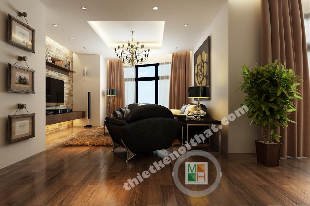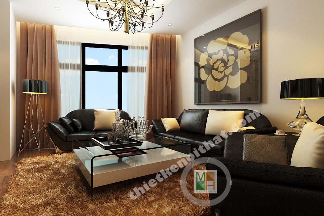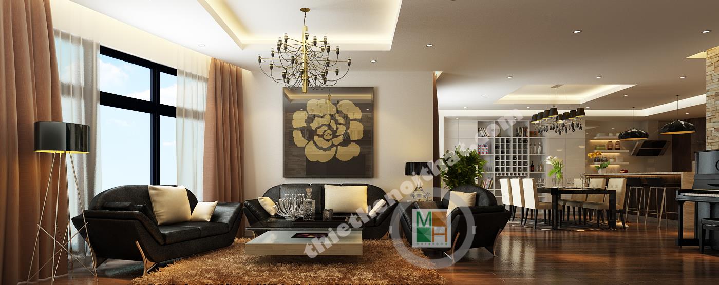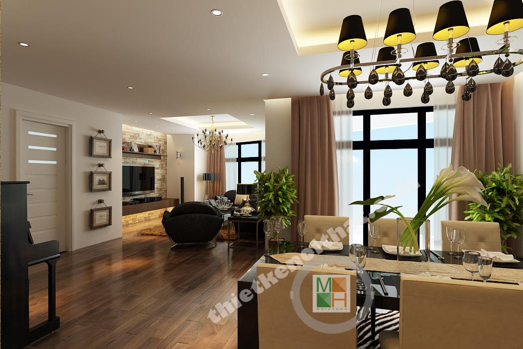 Phòng khách, bếp và bàn ăn được đặt gần nhau và đều có sự liên kết trong cách chọn và bài trí nội thất. Phòng khách của căn hộ nổi bật bởi cách sắp xếp gam màu đen để trang trí trên tông trắng chủ đạo. Bộ sofa bọc da đen đi kèm với chiếc bàn tiếp khách trắng và những chiếc gối nhỏ giúp căn phòng trở nên cân bằng và có chiều sâu. Những chi tiết nhỏ như đèn bàn, đèn đứng hay bức tranh lớn treo sau sofa cũng tạo ra sự liên kết hoàn toàn trong không gian. Mảng tường ốp gạch ở sau tivi cũng là một điểm nhấn cho không gian, kết hợp với những kệ đồ nhỏ gỗ nâu, tạo cảm giác cổ điển mà sang trọng. Mảng tường ở bên hông căn hộ được thay bằng những tấm kính trong suốt để toàn bộ khu vực sinh hoạt chung sáng và làm nổi bật đồ nội thất tối màu. Mảng tường trống bên cạnh phòng khách, gần bàn ăn, được trang trí bởi chiếc piano đen sang trọng và quý phái, thể hiện phần nào tính cách của gia chủ. Sảnh chính dẫn vào các phòng của căn hộ được trang trí bằng các kệ đồ âm tường và tranh ảnh gia đình, nhẹ nhàng mà ấm áp. Đặc biệt phần cột nhà đến tường ở sảnh bị trống một khoảng nên đươc lấp bằng bình phong sọc gỗ độc đáo và kết hợp kệ để đồ trang trí.