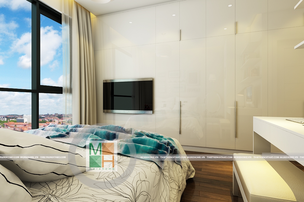 Thiết kế phòng ngủ chính thoáng đãng và tràn ngập ánh sáng tự nhiên nhờ có hệ thống kính chịu lực được lắp đặt thay thế cho bức tường cứng nhắc. Phía đầu giường có thể trang trí thêm bằng những bức tranh, bức hình thể hiện hạnh phúc gia đình. Bàn trang điểm và táp được bố trí đối xứng hai bên đầu giường nhằm tập trung điểm nhìn vào khu vực chính giữa căn phòng. Bàn làm việc và giá sách được kê sát tường, liền mạch trong hình khối để tạo cảm giác chắc chắn và an toàn khi sử dụng. Hệ thống tủ quần áo được thiết kế âm tường nhằm tiết kiệm diện tích và tăng thêm không gian lưu trữ bên trong.