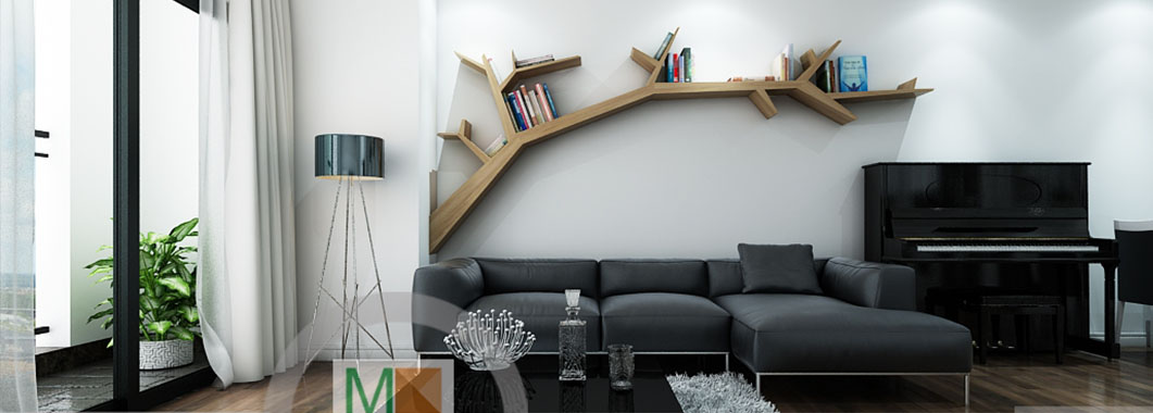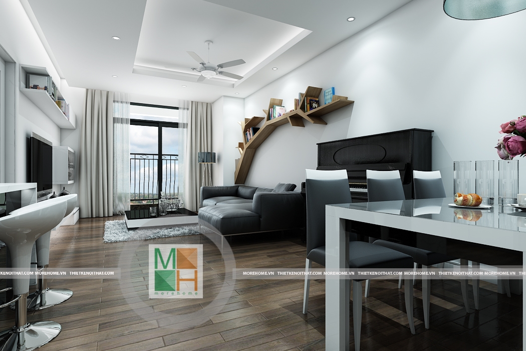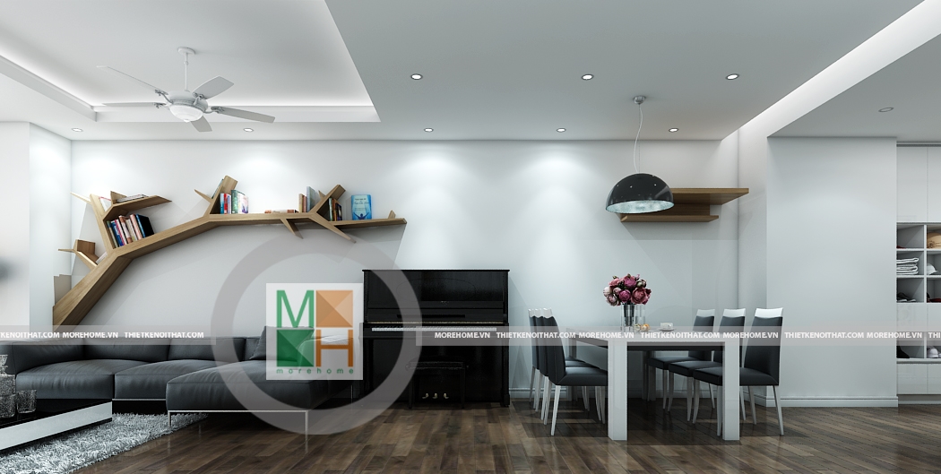 Phòng khách không cầu kì nhưng bù lại cách bài trí lại đem đến không khí ấm cúng, thân thiện. Sofa hình chữ L có kiểu dáng chắc chắn, tạo không gian rộng và thoáng hơn. Giá sách lắp phía trên sofa được làm cách điệu thành hình một nhánh cây nhằm đem thiên nhiên gần gũi hơn với gia đình bạn. Người ngồi ở sofa có thể giải phóng tầm nhìn ra ngoài khoảng không thoáng đãng ngoài ban công, tạo cảm giác thư giãn. Ánh sáng tự nhiên gián tiếp trải vào chan hòa cho toàn bộ không gian liên hoàn khách, bếp, ăn thêm sức sống. Chiếc piano đặt giữa bàn ăn và sofa như một chiếc cầu nối mang tính nghệ thuật.