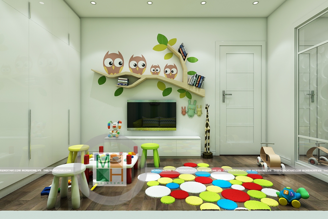 Phòng ngủ của con sử dụng những nội thất và màu sắc bắt mắt, ngộ nghĩnh nhằm phù hợp với lứa tuổi của trẻ. Màu xanh của giấy dán tường và chiếc ghế dài tạo điểm nhấn sinh động cho căn phòng. Giá sách của bé cũng được làm cách điệu thành hình nhánh cây giống như phòng khách nhưng có đường nét thanh thoát hơn và được bổ sung thêm hình vẽ đáng yêu phía trên.