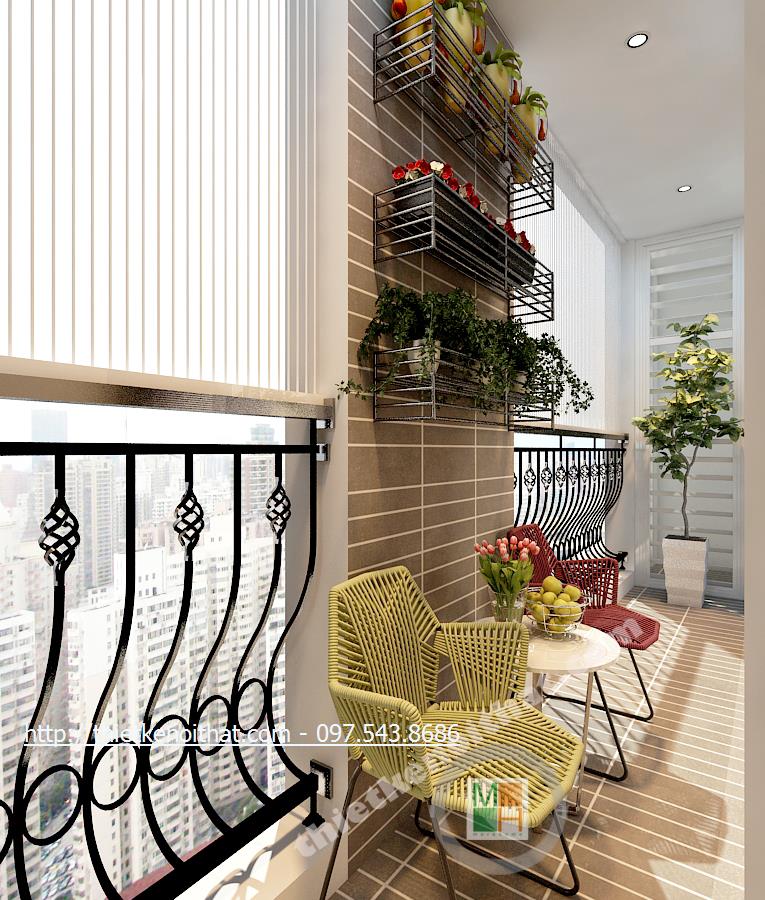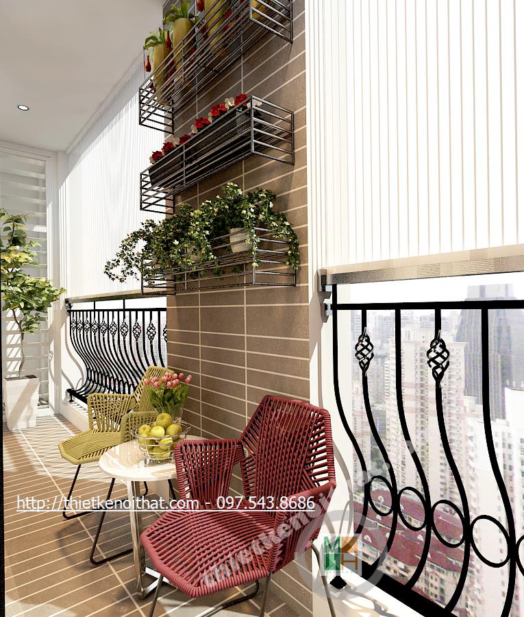 Như trên đã nói phong cách thiết kế chung cư Royal City nhà chị Bích có sự bắt mắt và lãng mạn bởi sự hiện diện của hệ thống cây xanh. Và vì thế bạn có thể thấy trong bất cứ căn phòng nào cũng có 1 chậu hoa hoặc lẵng hoa. Đặc biệt, gia chủ còn thiết kế 1 không gian thật lãng mạn, tràn ngập cây xanh ở khu vực ban công. Tại đây, ngoài sự hiện diện của chậu cây xanh là những lẵng hoa nhỏ được trồng trên giá và gắn trực tiếp vào tường, vừa tiết kiệm diện tích mà lại rất bắt mắt. Với mục đích biến nơi đây thành nơi thư giãn và có thể uống trà, đọc sách, thậm chí là tiếp khách, tán gẫu với bạn bè,… gia chủ đã bố trí ở khu vực ban công này bộ bàn ghế với chiếc bàn nhỏ xinh ở giữa và 2 chiếc ghế bành có kiểu dáng lạ mắt 2 bên. Bước chân vào khu vực này, đảm bảo bạn sẽ thấy thích.