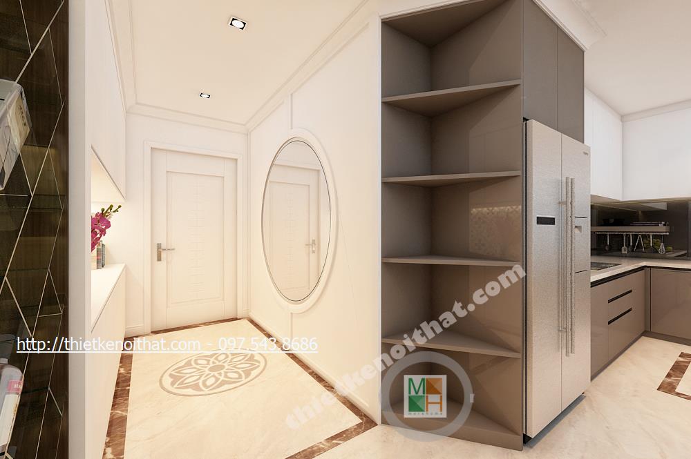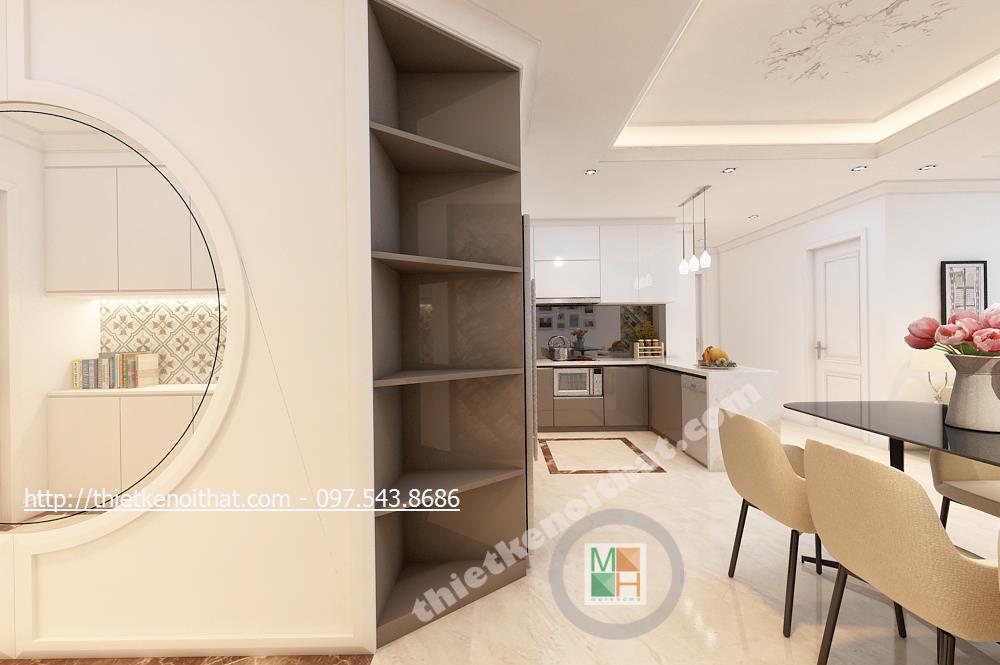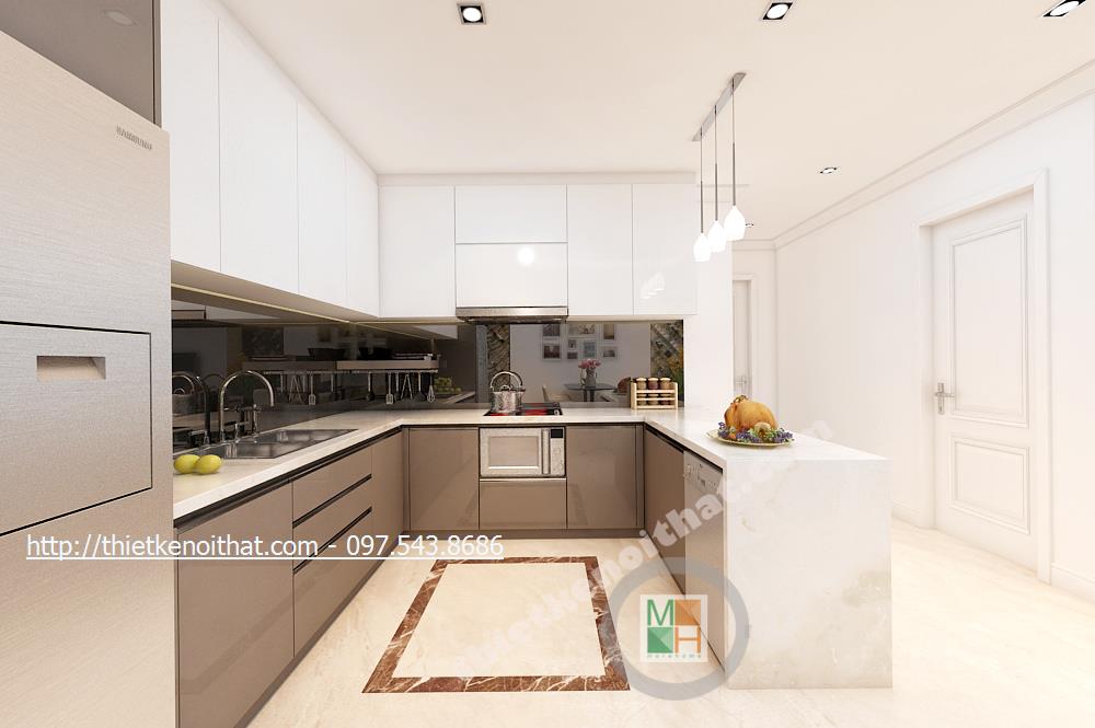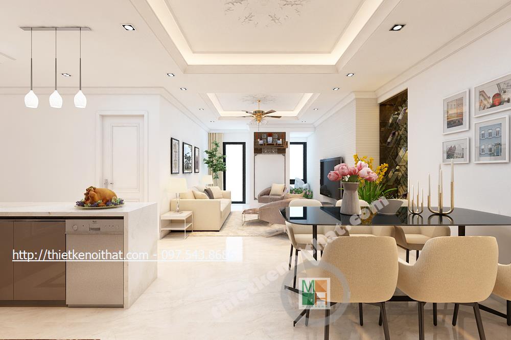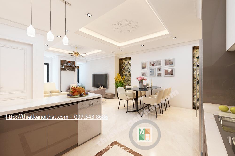 Liền kề ngay phòng khách là phòng ăn và khu vực nấu nướng. Phòng ăn được trang trí rất gọn gàng với, sáng sủa với những chiếc ghế màu trắng và bàn ăn ốp kính màu đen. Kín ốp bàn màu đen được làm từ chất liệu kính cường lực tạo nên sự chắc chắn, bền vững và nét đẹp hiện đại cho không gian. Bên cạnh đó, một chậu hoa nhỏ ở góc phòng cùng với lọ hoa nhỏ trên bàn ăn góp phần tạo nên sự lãng mạn, khiến những giây phút sum họp gia đình thêm ấm cúng. Ngay cạnh phòng ăn là phòng bếp – nơi thỏa sức trổ tài của các bà nội trợ. Không gian này có sự hiện diện của tủ bếp Laminate ở dưới và tủ bếp trên Acrylic. Trong đó, tủ bếp Acrylic màu trắng sáng bóng thích hợp lắp đặt ở trên để đảm bảo sự sạch sẽ, khó bắt bụi và dính bẩn hơn so với tủ bếp Laminate màu tối hơn được đặt ở dưới.