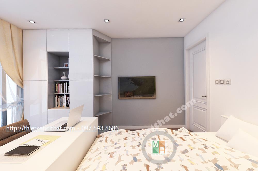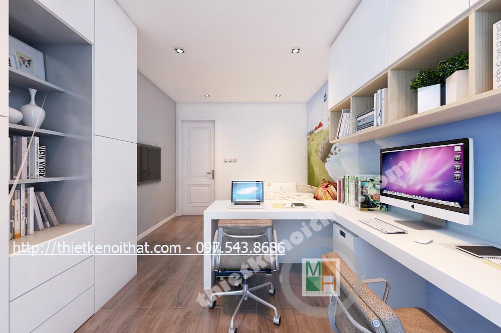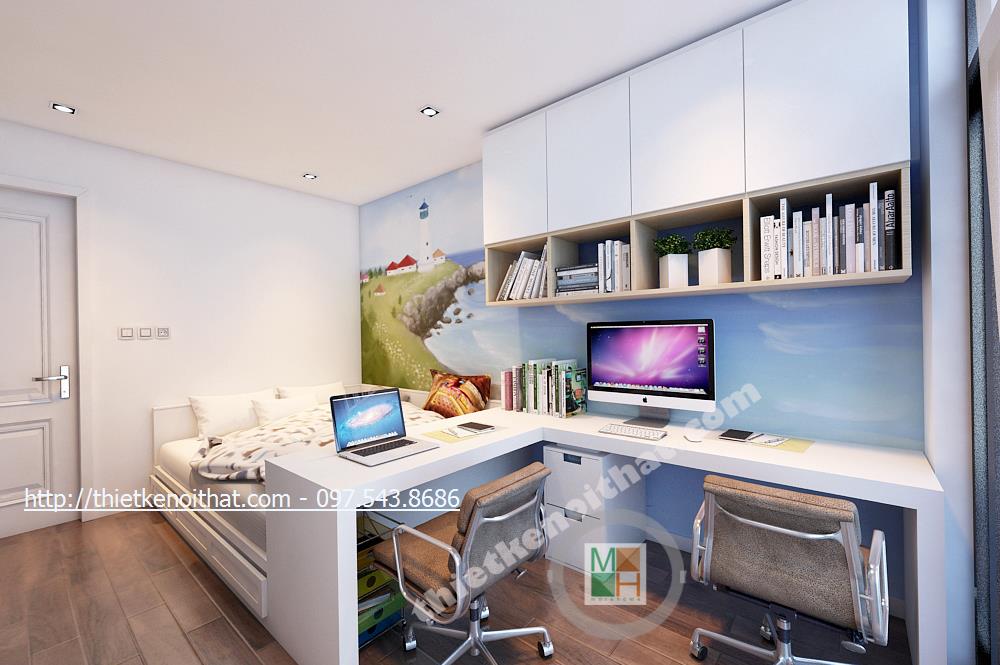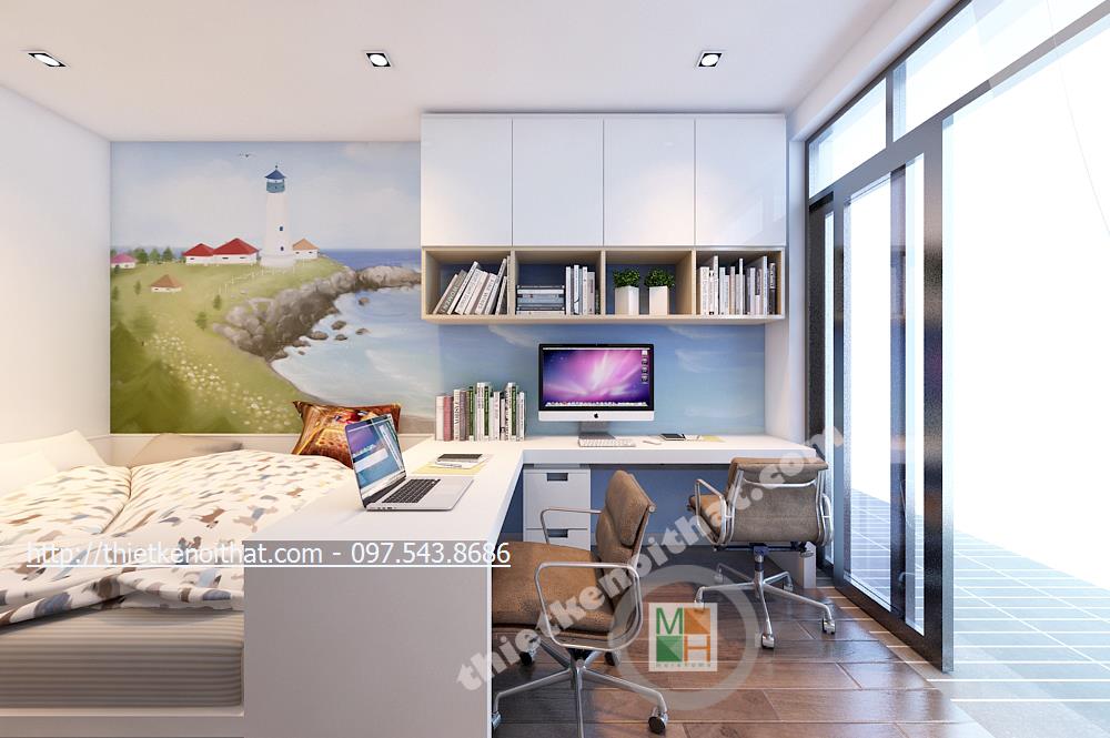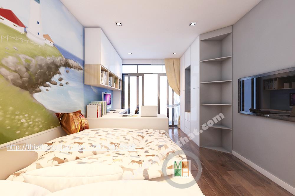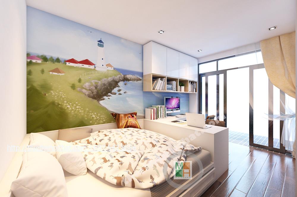 Phòng ngủ của con cái khá rộng và được thiết kế khá độc đáo với những khoảng lồi, thụt rất lạ mắt nhằm tạo ra sự mới lạ và phục vụ cho nhu cầu sinh hoạt của con.Vì là căn phòng dành cho cả 2 con nên có 2 bàn học và 1 chiếc giá sách khá lớn được thiết kế như chiếc tủ, kệ đựng đồ với nhiều ô ngăn để có thể chứa được nhiều sách vở và đồ dùng cá nhân, đồ lưu niệm khác. Đặc biệt ấn tượng trong căn phòng này còn là 1 bức tranh dán tường 3d hình phong cảnh với chiều sâu, tạo nhiều liên tưởng cho người xem.