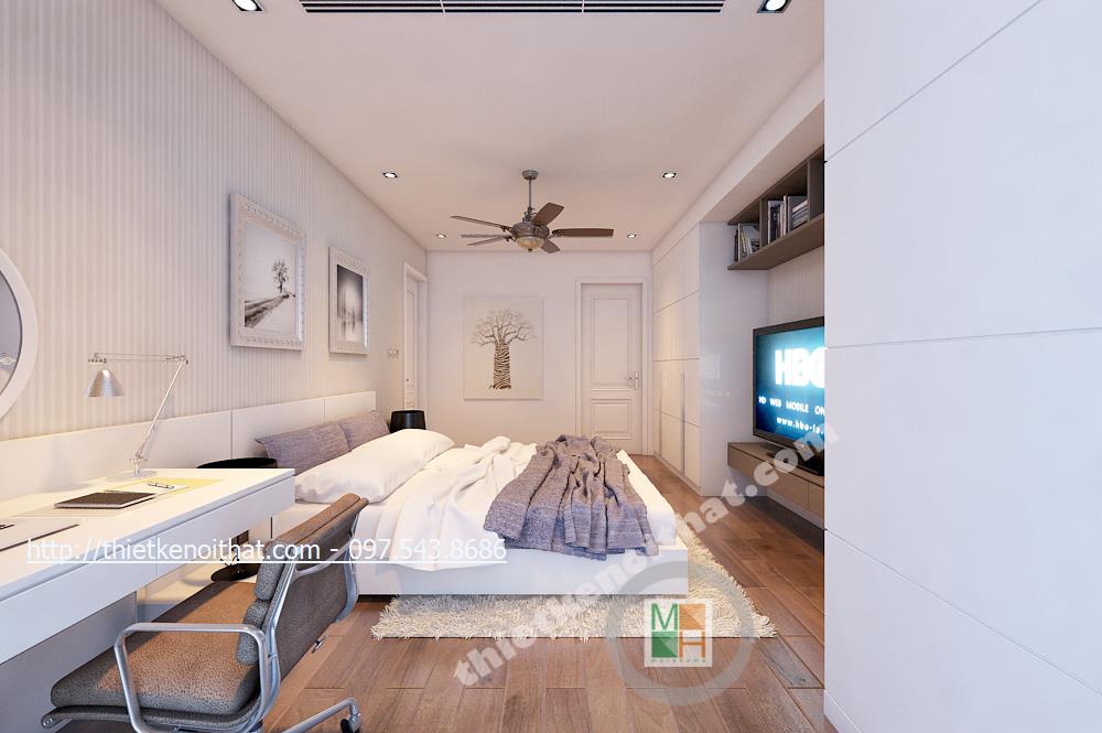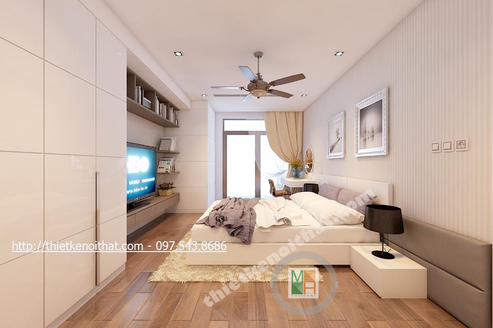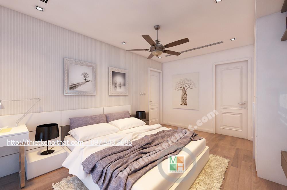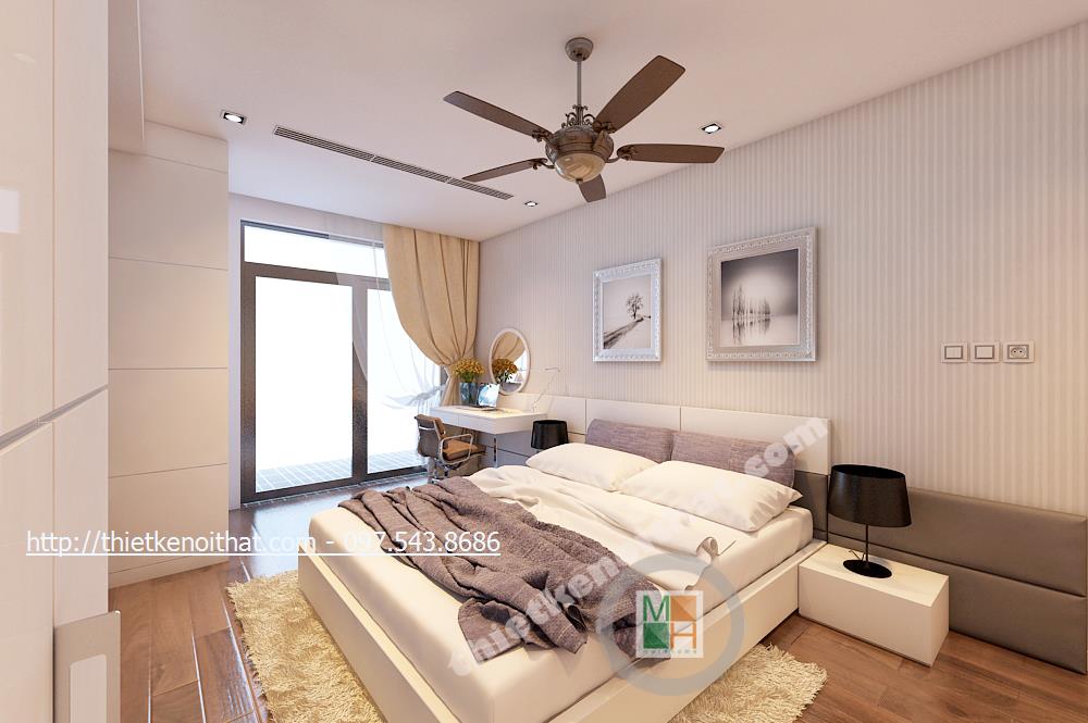 Thiết kế nội thất phòng ngủ của bố mẹ nổi bật trên tông màu trắng của tường nhà, đệm giường kết hợp với sàn gỗ màu nâu nhạt. Chiếc bàn trang điểm với chiếc gương soi nhỏ xinh, 1 lọ hoa cùng 2 bức tranh trang nhã khiến căn phòng có sự lãng mạn, dễ chịu hơn rất nhiều. Ngăn cách phòng ngủ với thế giới bên ngoài là cánh cửa kính, tạo độ sáng và mở rộng tầm nhìn cho không gian để từ đó gia chủ có thể thoải mái nhìn ra bên ngoài dù ở trong phòng. Nếu không thích độ sáng này, gia chủ có thể kéo chiếc rèm che lại. Thật là tiện dụng.