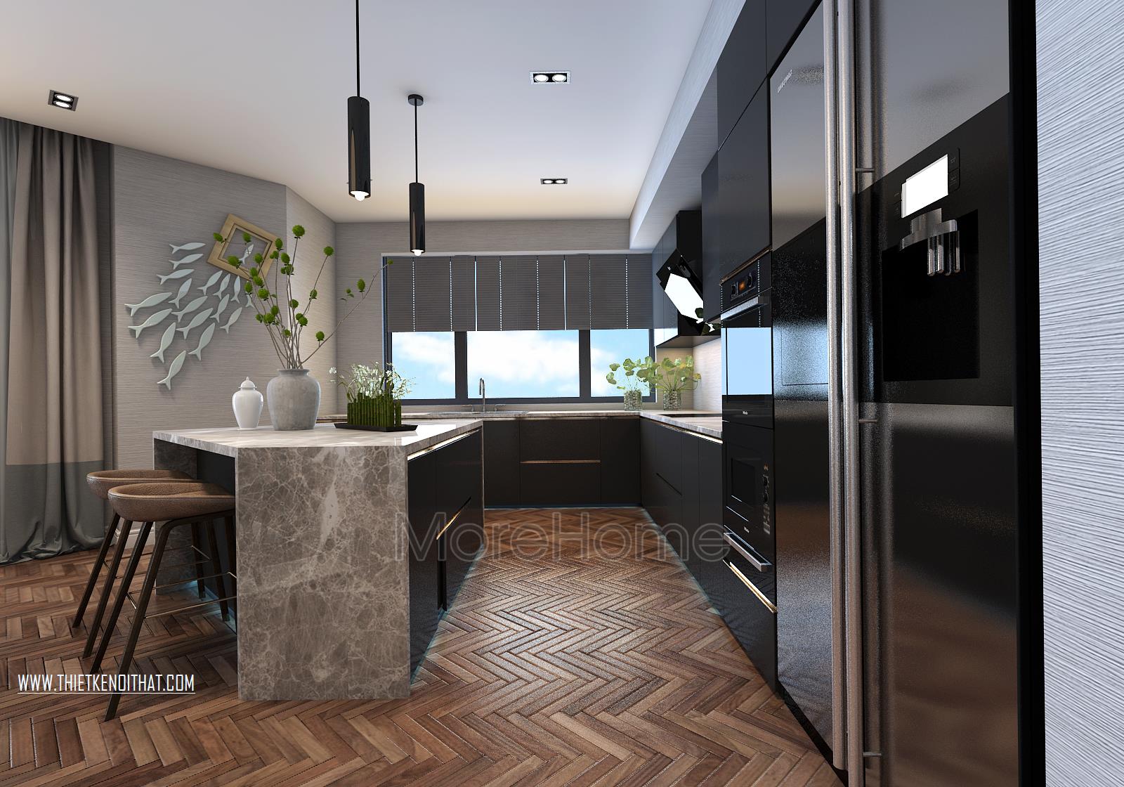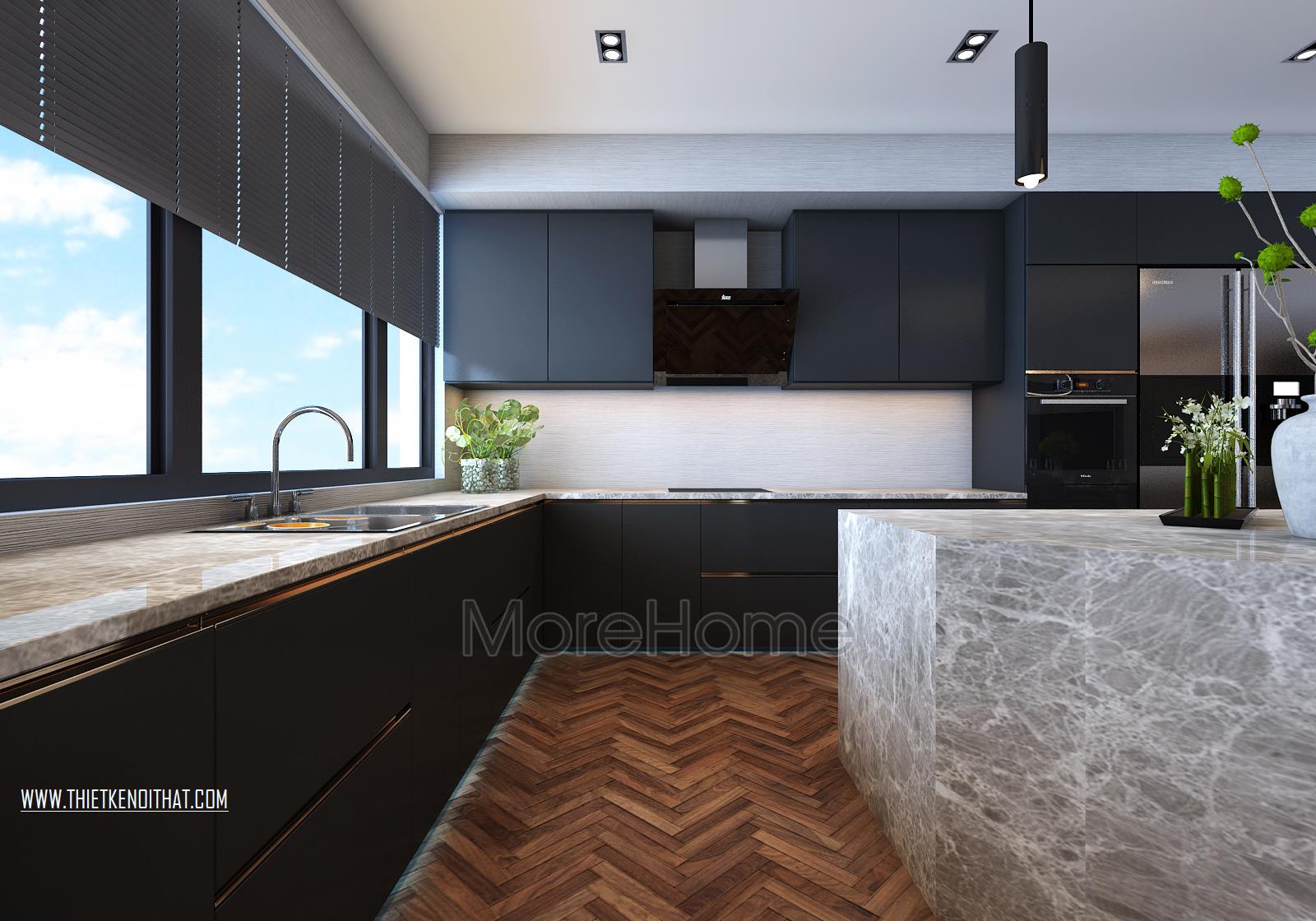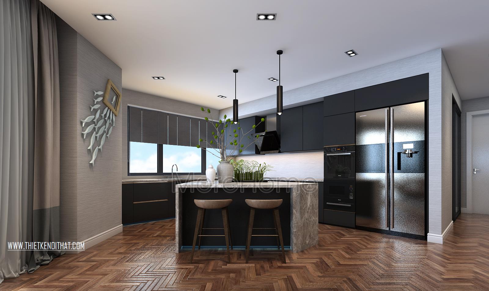 Thiết kế bếp hiện đại khéo léo tận dụng không gian góp của căn hộ, kiến trúc sư đã xử lý một cách khéo léo để không làm mất đi sự hài hòa và độ phẳng trong thiết kế. Tone màu ghi xám và đen được sử dụng giúp mang đến sự hài hòa và cân bằng cho các thiết kế tối và trầm, ánh kim loại cũng chính là một xu hướng thiết kế được ưa chuộng trong năm nay. Không gian thiết kế xanh cũng được kiến trúc sư khéo léo sắp đặt giúp không gian trở nên thân thiện và tươi mát hơn.