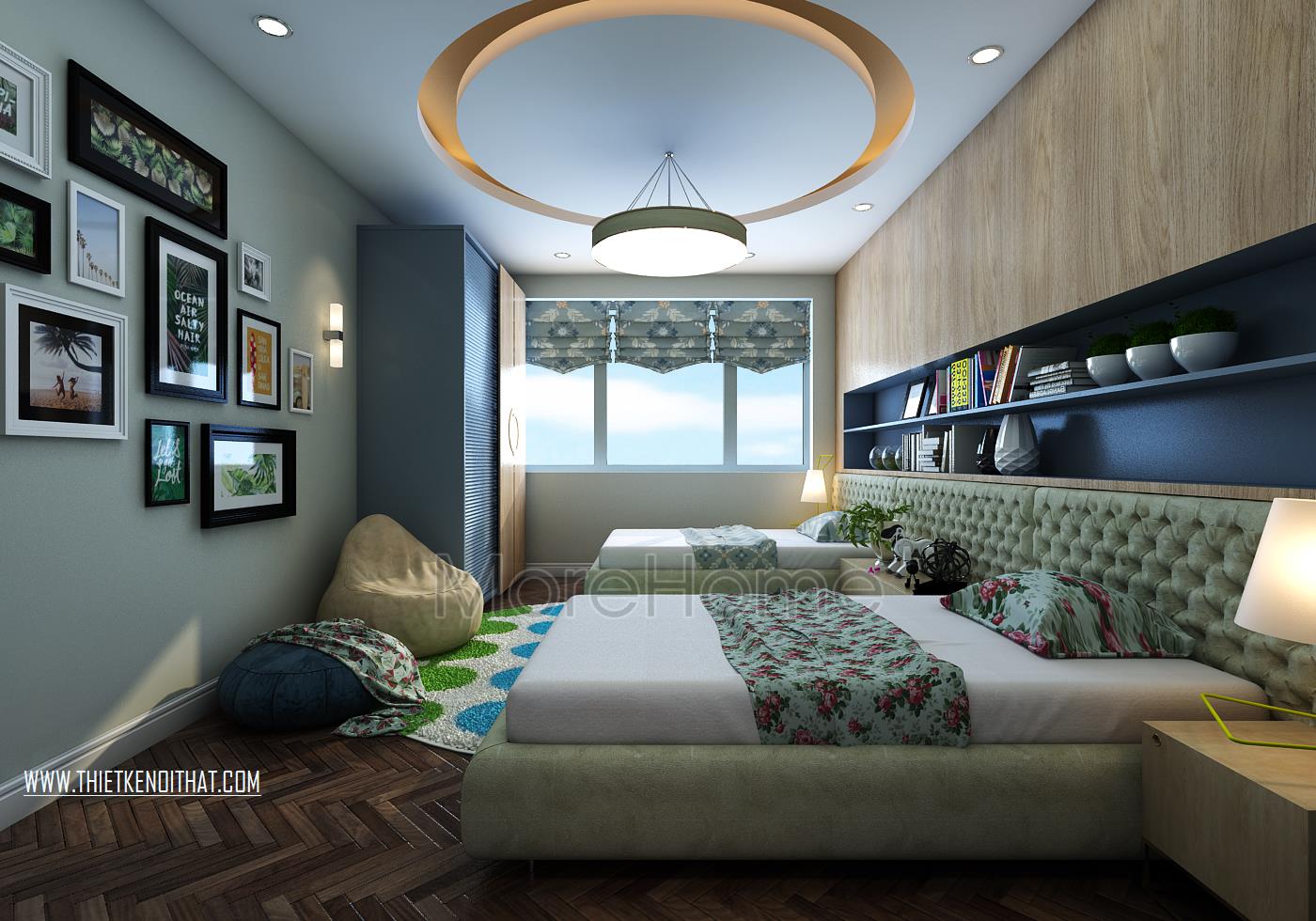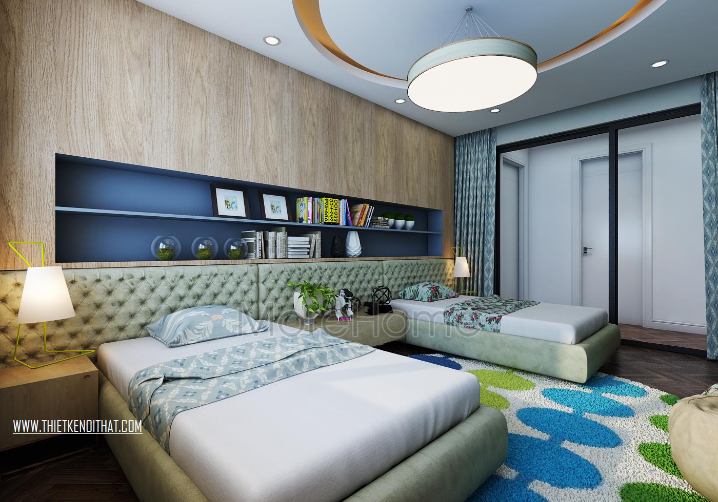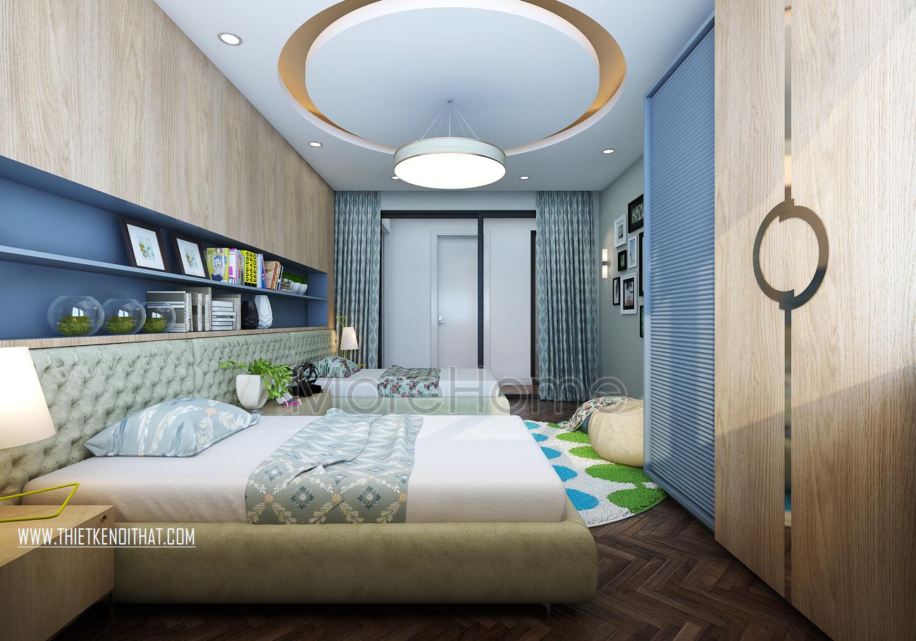 Tiếp đến là thiết kế nội thất phòng ngủ Master phong cách hiện đại. Tone màu ghi sáng và nâu veneer trầm được sử dụng tạo độ cân bằng cho không gian. Thiết kế nhà vệ sinh ngăn cách bởi tường kính cường lực là một trong những dụng ý của tác giả giúp mang đến cảm giác cơi nới về mặt diện tích và giúp tạo ấn tượng sâu sắc về một không gian cách tân sáng tạo. Bên cạnh đó, thiết kế tủ quần sao đa tầng nhiều ngăn với thiết kế không cánh tạo độ mở và tiện lợi hơn cho gia chủ. Điểm cuối cùng đem lại nét đẹp cho căn phòng chính là sự kết hợp hài hòa của ánh sáng, vẻ đẹp ánh sáng được phản chiếu nhẹ nhàng qua từng khung cửa và mang lại hứng khởi cho các thành viên trong gia đình.
