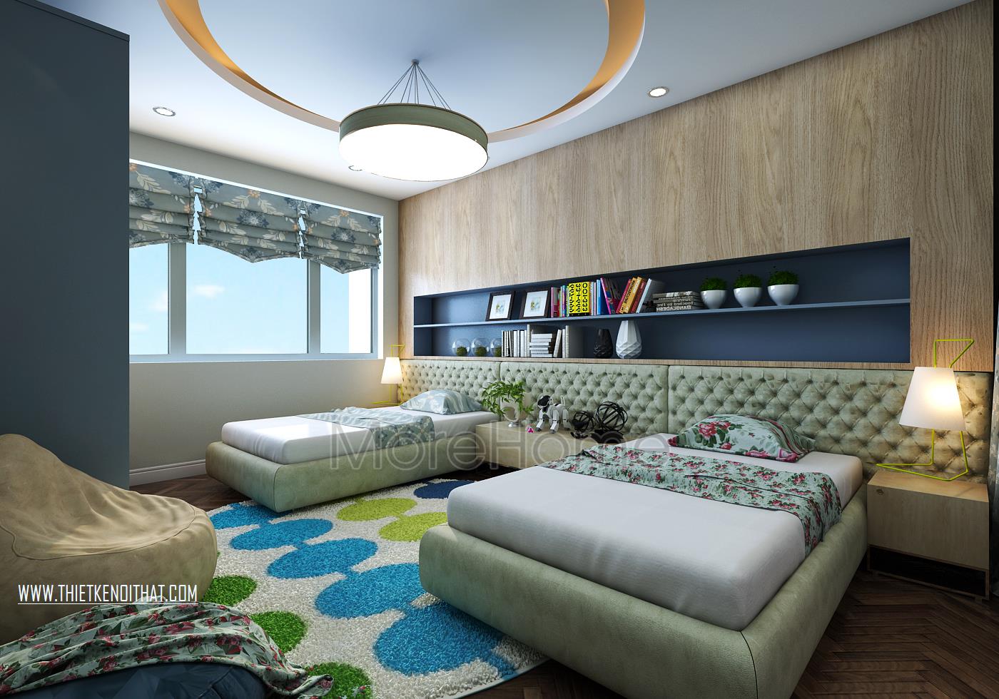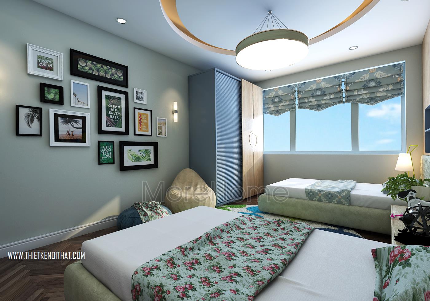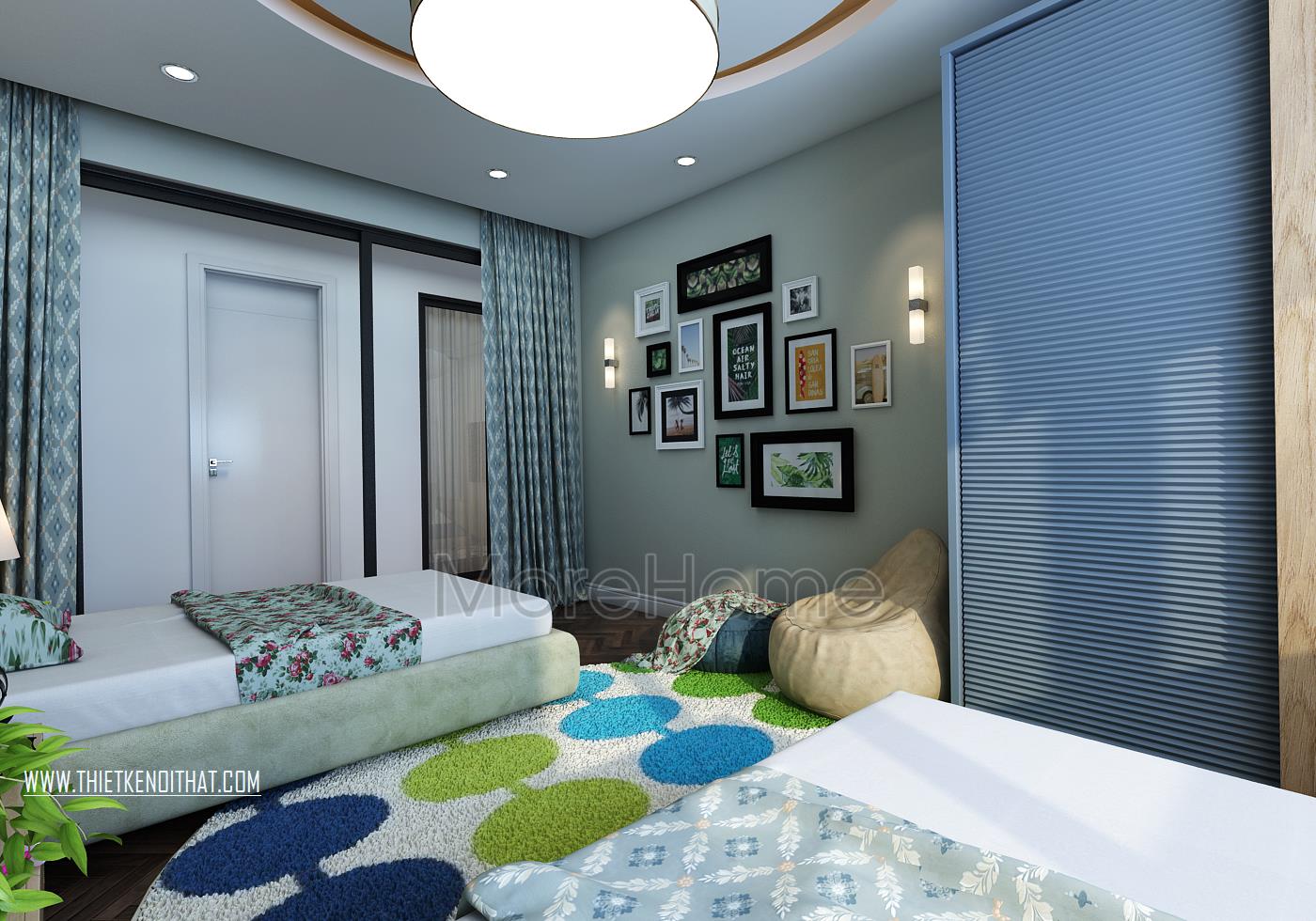 Tiếp đến là thiết kế nội thất phòng ngủ Master phong cách hiện đại. Tone màu ghi sáng và nâu veneer trầm được sử dụng tạo độ cân bằng cho không gian. Thiết kế nhà vệ sinh ngăn cách bởi tường kính cường lực là một trong những dụng ý của tác giả giúp mang đến cảm giác cơi nới về mặt diện tích và giúp tạo ấn tượng sâu sắc về một không gian cách tân sáng tạo. Bên cạnh đó, thiết kế tủ quần sao đa tầng nhiều ngăn với thiết kế không cánh tạo độ mở và tiện lợi hơn cho gia chủ. Điểm cuối cùng đem lại nét đẹp cho căn phòng chính là sự kết hợp hài hòa của ánh sáng, vẻ đẹp ánh sáng được phản chiếu nhẹ nhàng qua từng khung cửa và mang lại hứng khởi cho các thành viên trong gia đình.
