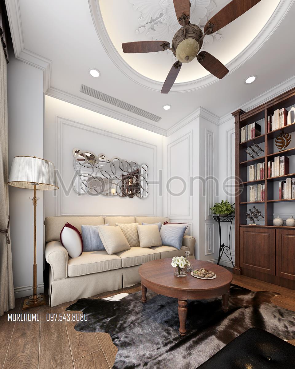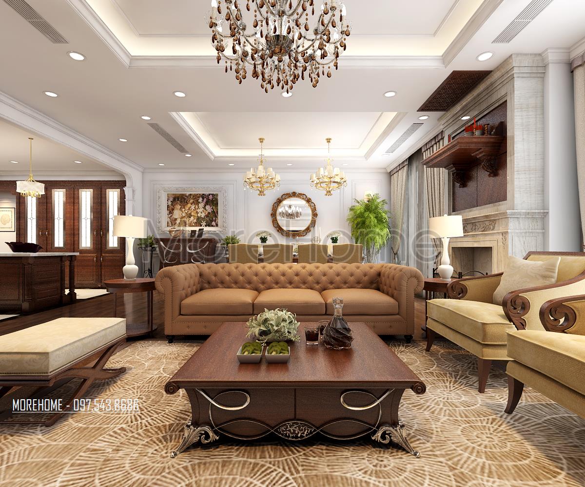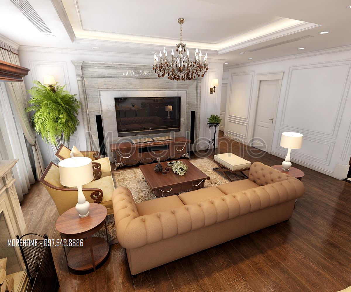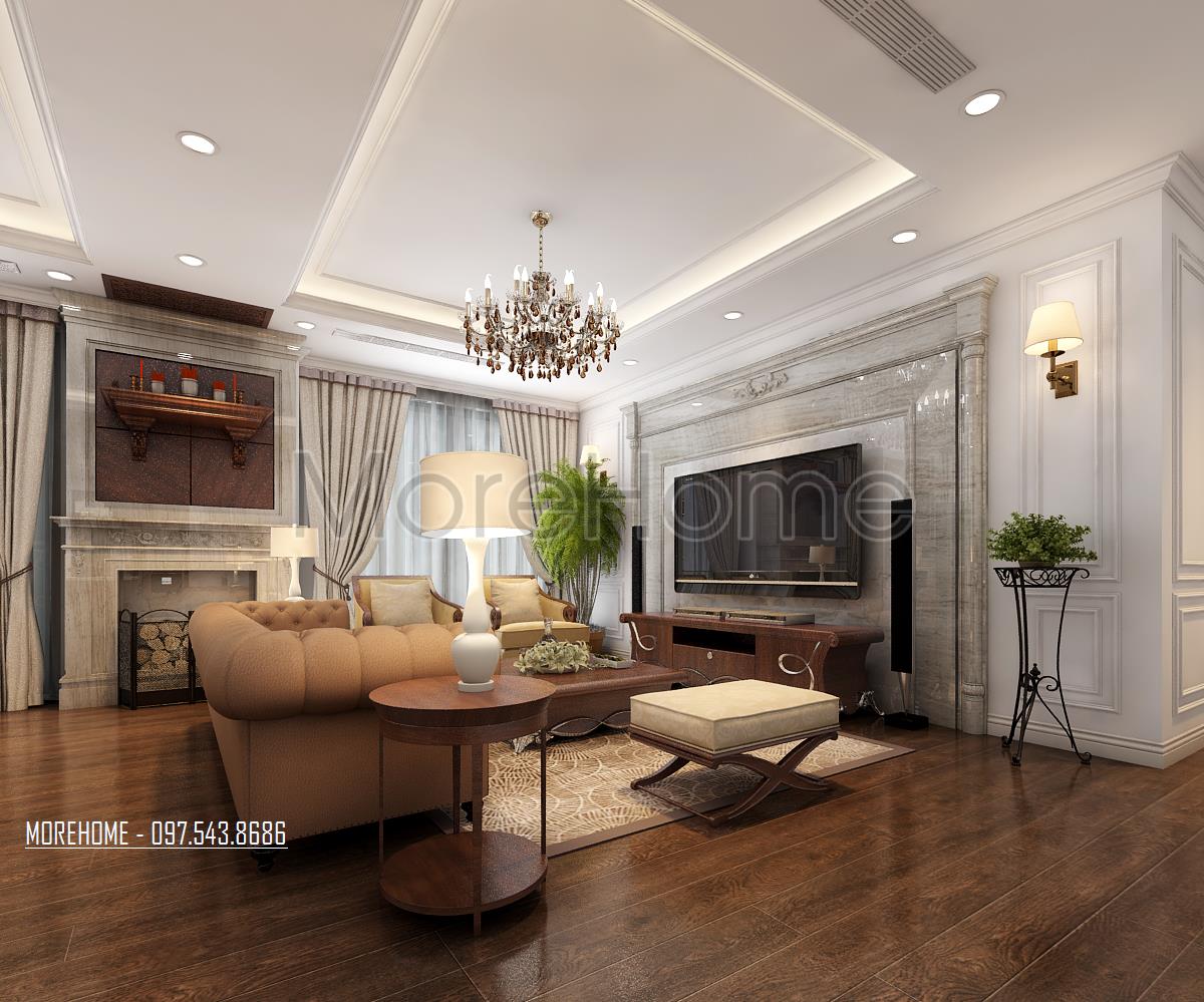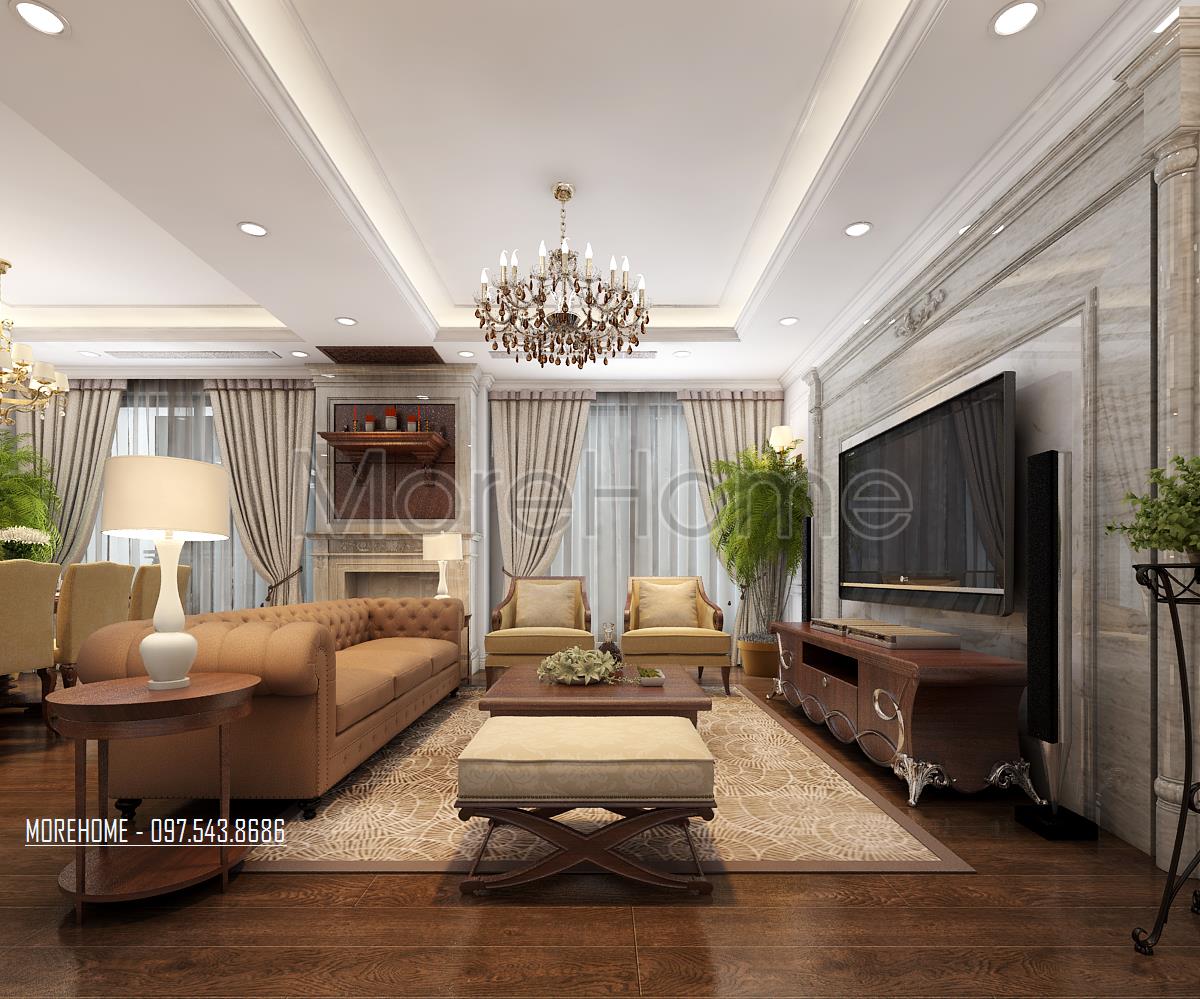 Thiết kế nội thất phòng khách tân cổ điện sử dụng tone màu gỗ veneer nâu sáng làm điểm nhấn về mặt màu sắc. Không quá trầm cũng không quá mờ nhạt chính là đặc điểm của tone màu trung tính này, từ đó thiết kế dễ dàng hòa trộng với không gian, nét trạm khắc được mềm hóa và trở nên cân bằng với không gian phòng khách. Ghế sofa to rộng được gia chủ chọn lựa kỹ lưỡng mang đến cảm giác vững chắc và an toàn cho không gian sinh hoạt chung.