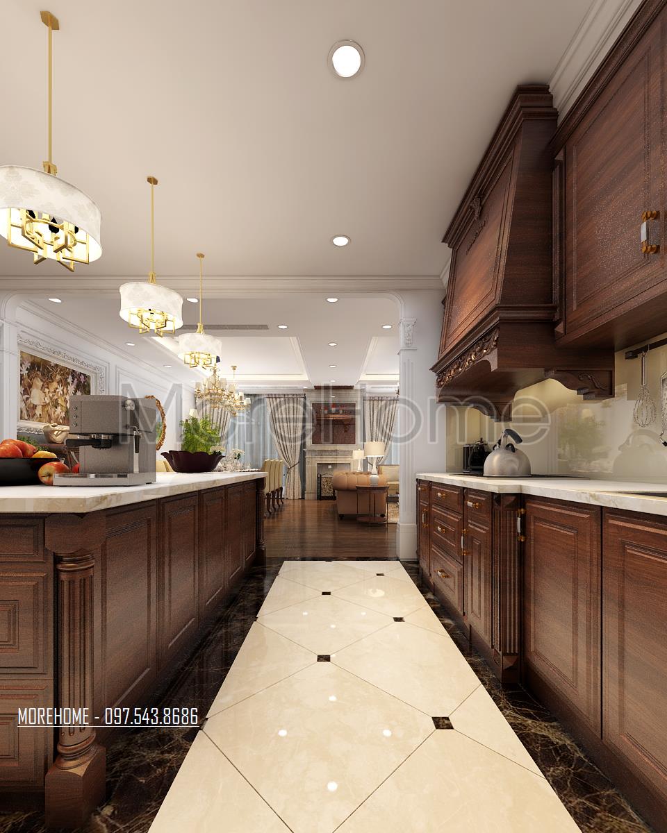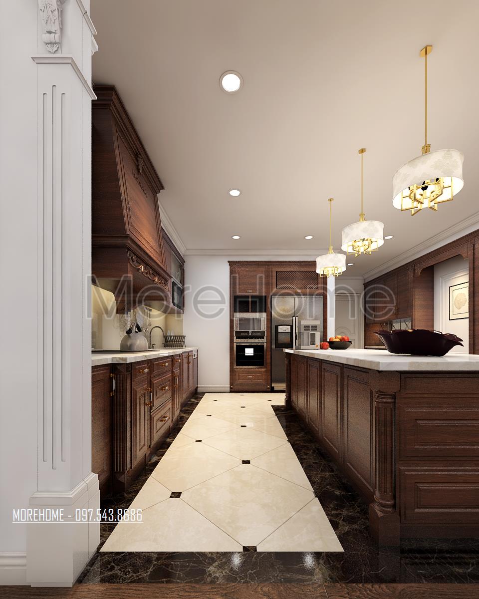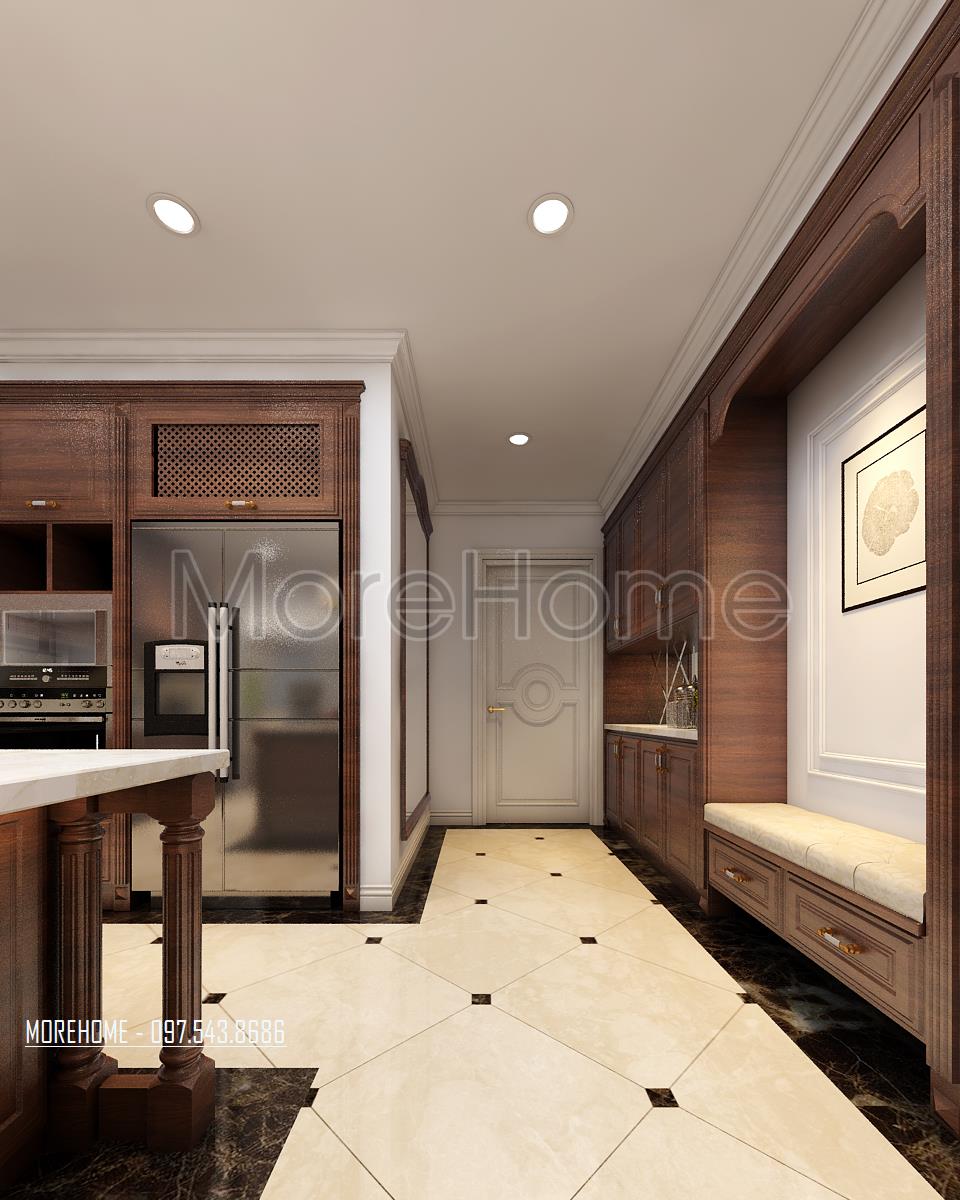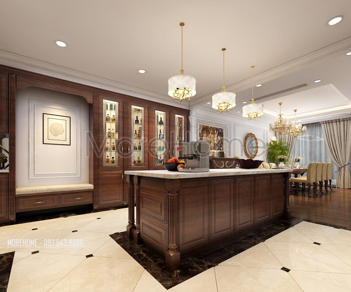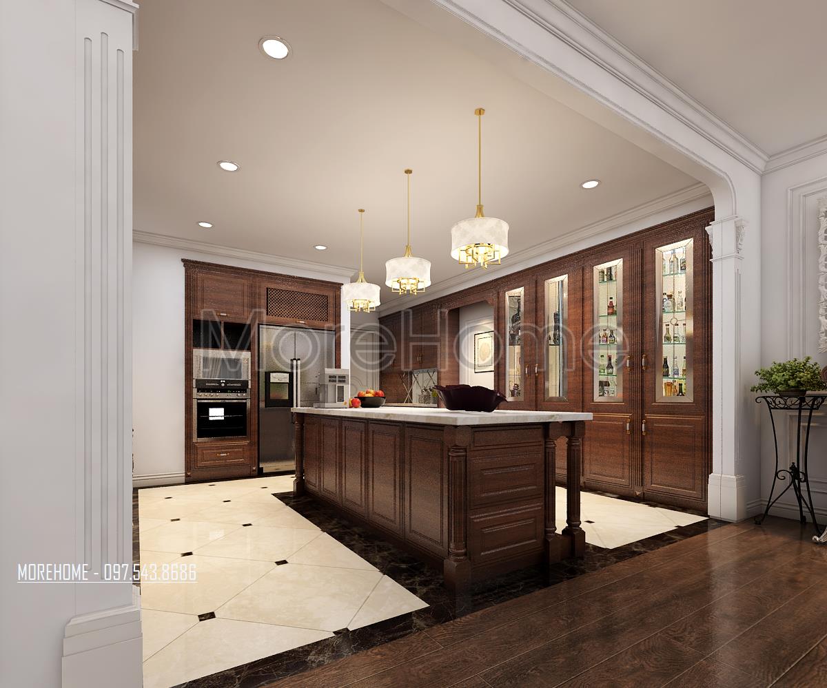 Thiết kế nội thất bếp tân cổ điển với dạng tủ bếp âm tường nhiều ngăn vừa đảm bảo tính tiện lợi vừa tiết kiệm tối đa diện tích sử dụng, tạo không gian đa năng rộng và thoáng. Tủ rượu đặt đối xứng qua một kệ bếp đa năng cũng chính là dụng ý mang lại vẻ đẹp đối xứng cho căn phòng.