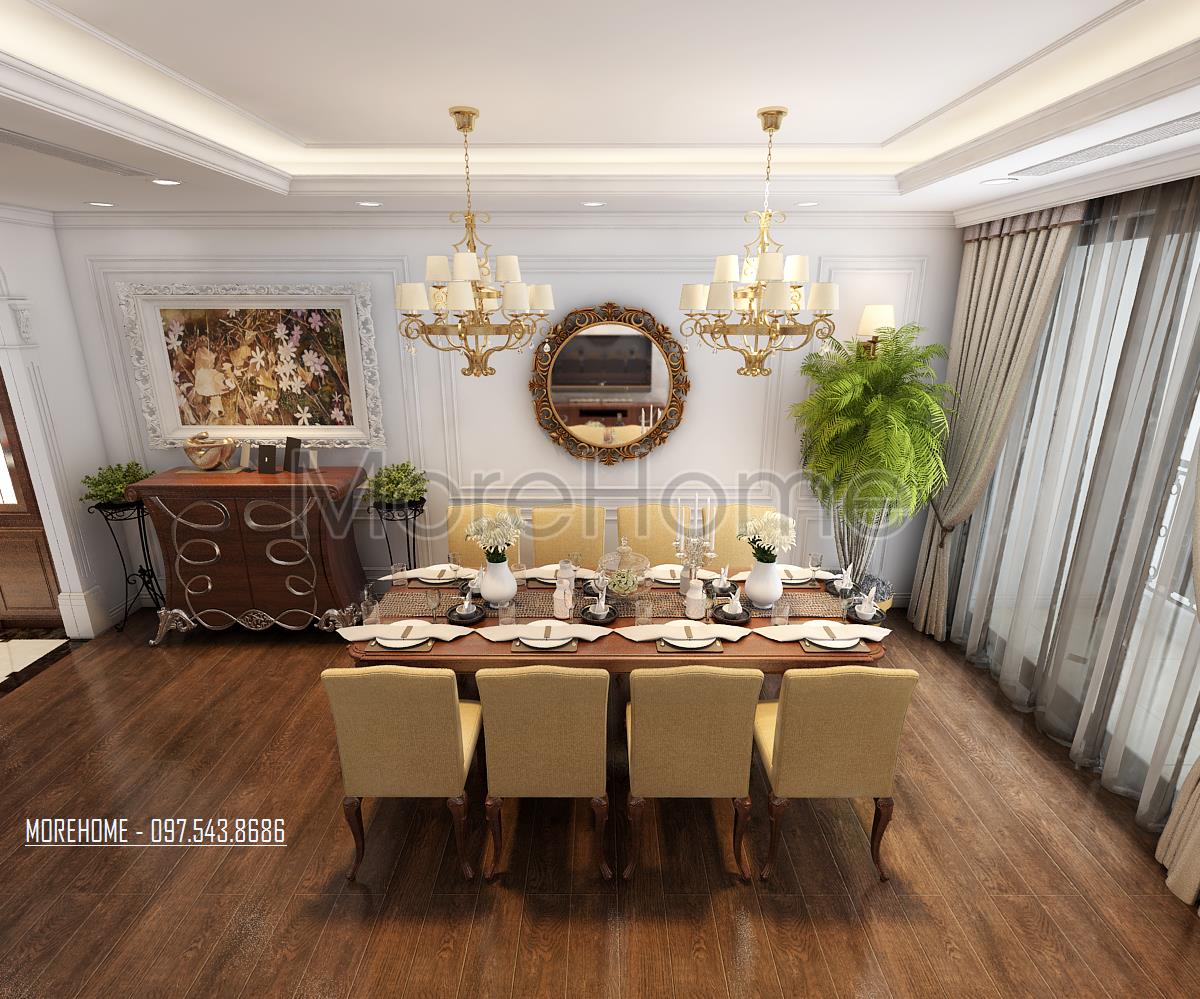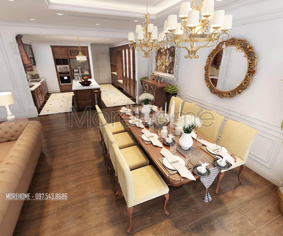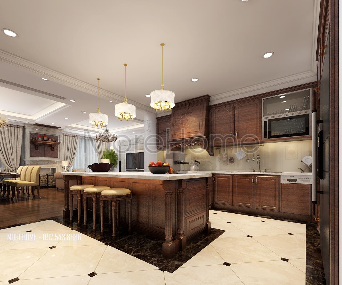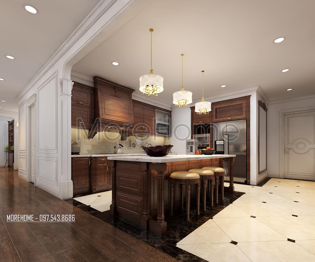 Thiết kế nội thất bếp tân cổ điển với dạng tủ bếp âm tường nhiều ngăn vừa đảm bảo tính tiện lợi vừa tiết kiệm tối đa diện tích sử dụng, tạo không gian đa năng rộng và thoáng. Tủ rượu đặt đối xứng qua một kệ bếp đa năng cũng chính là dụng ý mang lại vẻ đẹp đối xứng cho căn phòng.