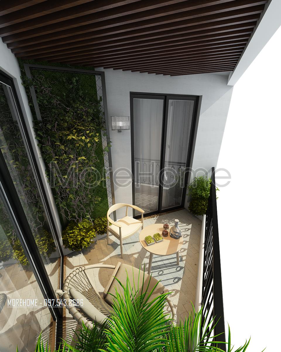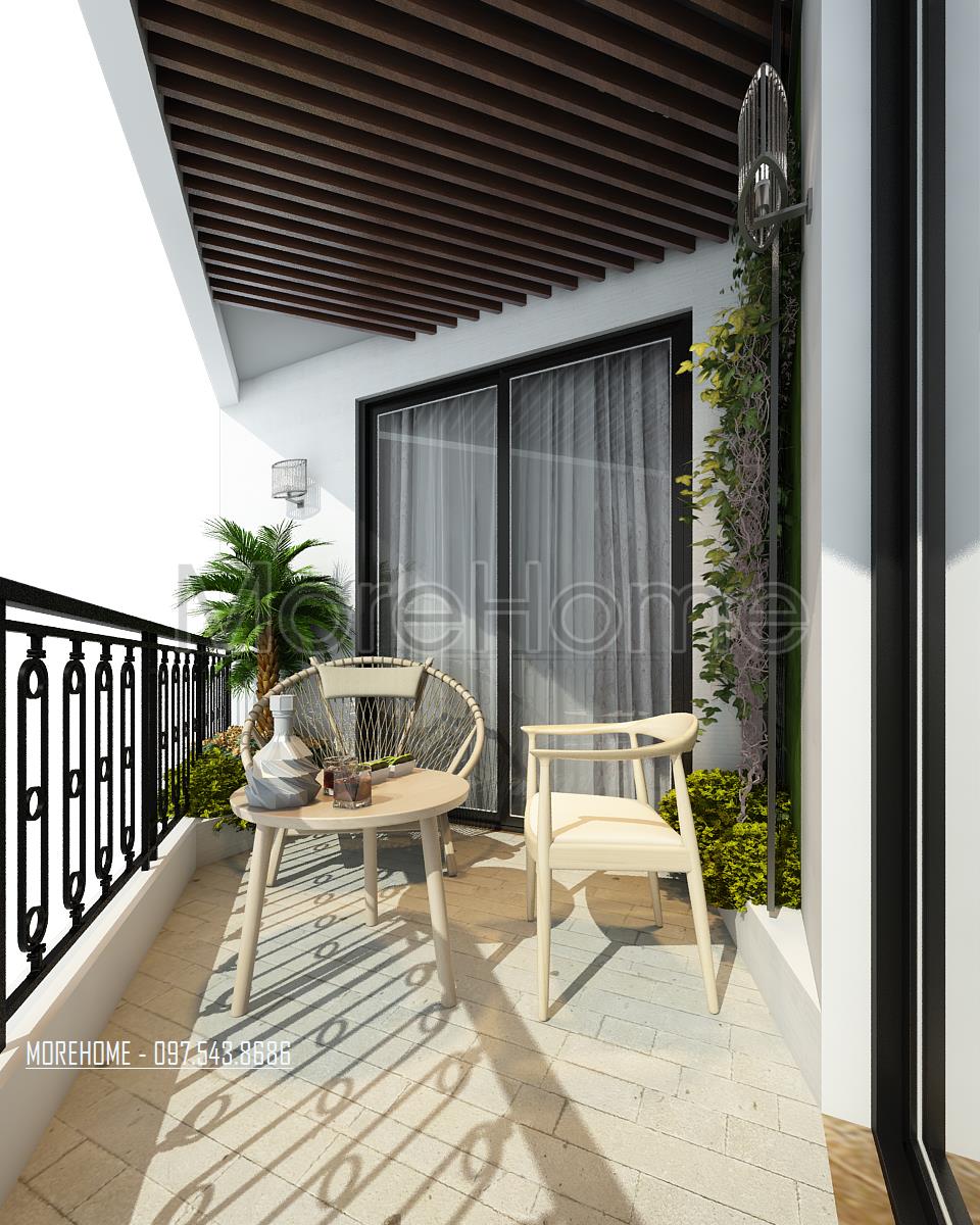 Tiếp đến là thiết kế ban công với vườn treo đầy sáng tạo. Thiết kế sáng tạo này vừa tiết kiệm không gian lại vừa tạo khoảng không xanh rộng rãi đem đến sự yên bình cho gia chủ, cân bằng giữa yếu tố cổ điển, hiện đại và vẻ đẹp thiên nhiên. Bộ bàn trà nhỏ được đặt khéo léo ở đây như một nơi thư giãn bình yên trong căn nhà – một nơi chốn thả mình vào thiên nhiên.