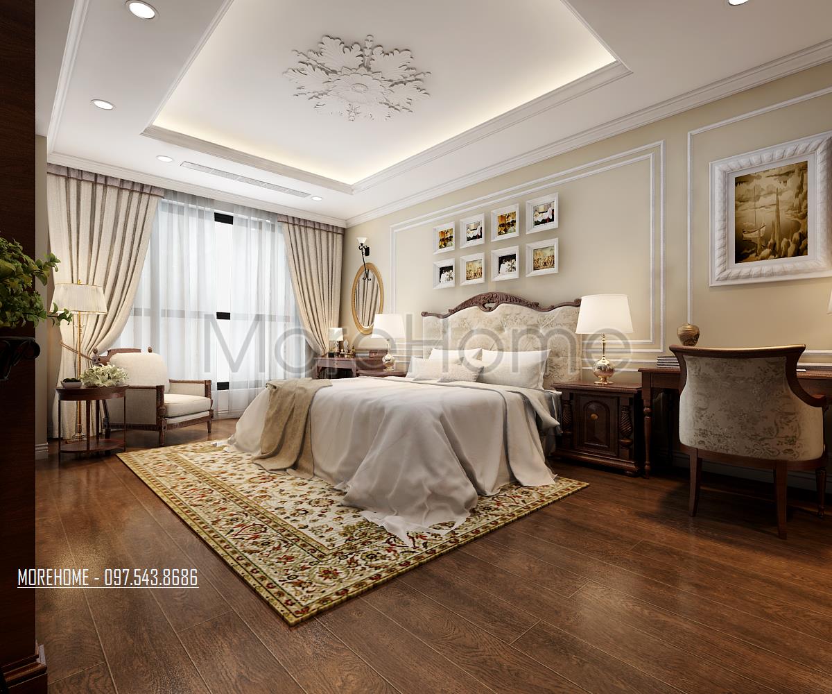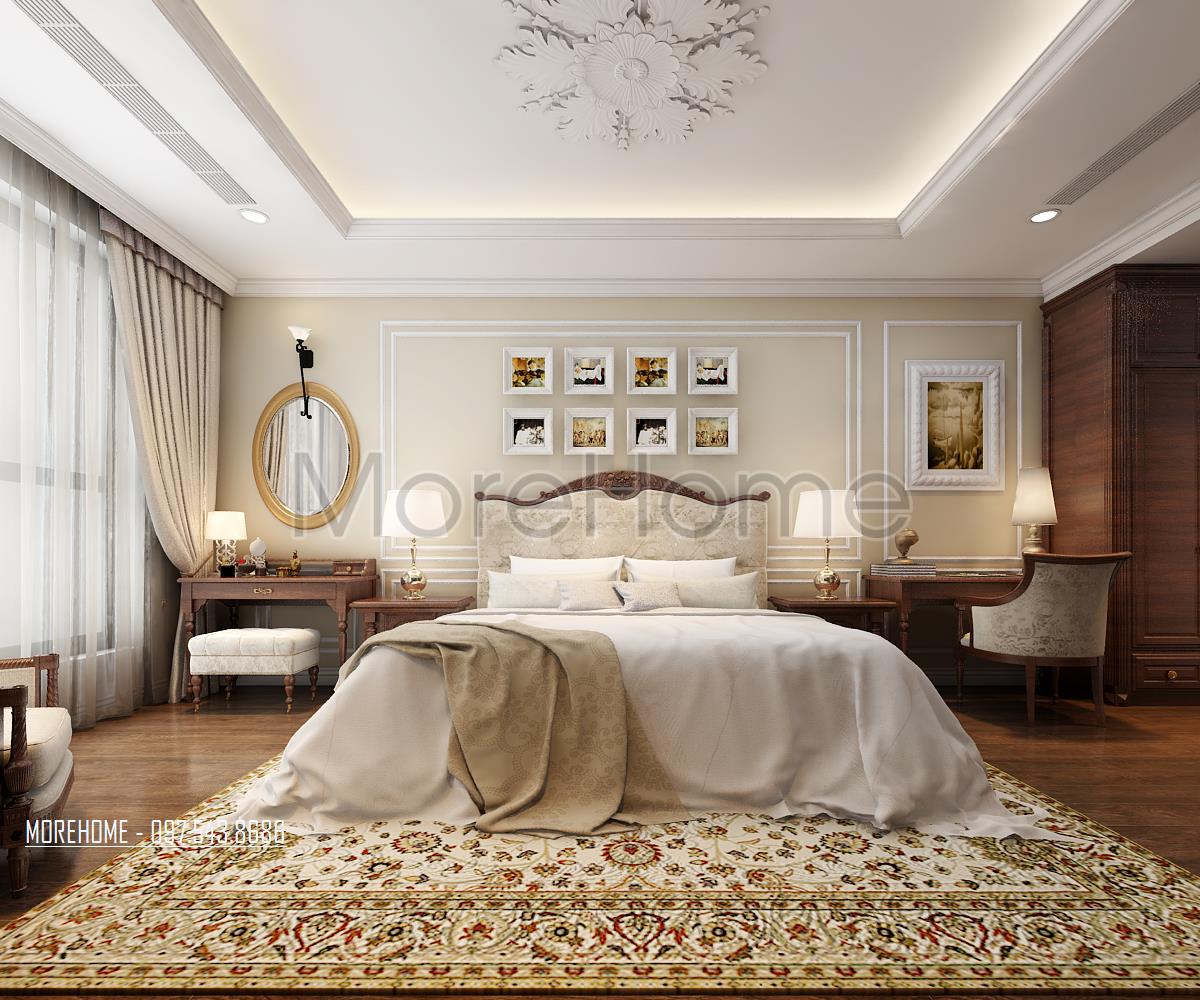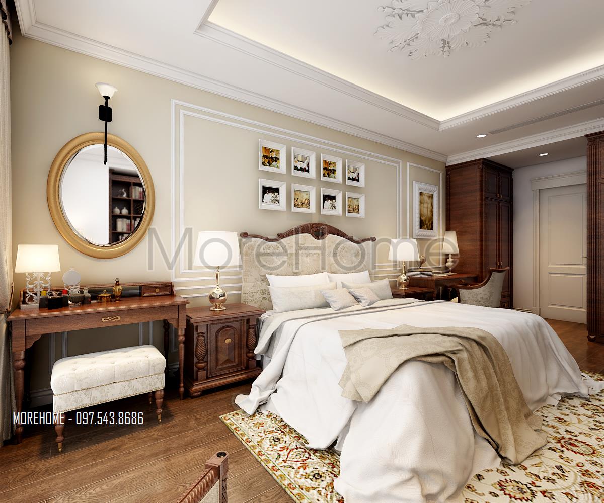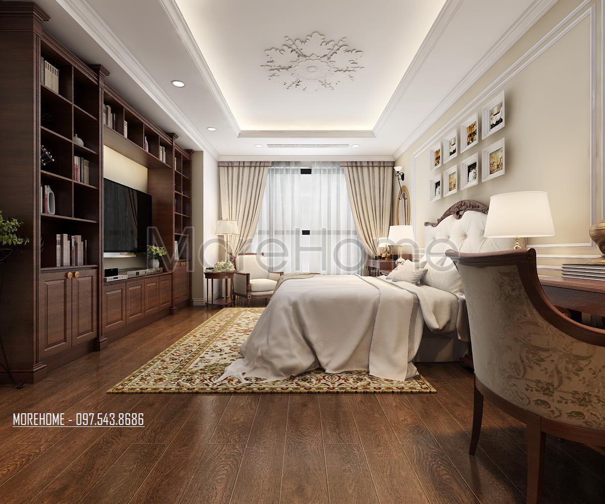 Đến với không gian nội thất phòng ngủ tân cổ điển, ta dễ dàng nhận thấy nét đẹp trong thiết kế mở rộng không gian nhờ vào sự tinh tế trong việc đặt tấm kính cường lực to rộng gần như chiếm một bức tường. Ánh sáng tự nhiên tràn vào căn phòng mang lại sức sống cho không gian và hứng khởi cho gia chủ. Tủ kệ đặt gọn gàng với các ngăn thiết kế mở tiện lợi hơn rất nhiều so với thiết kế tủ khép xưa cũ.