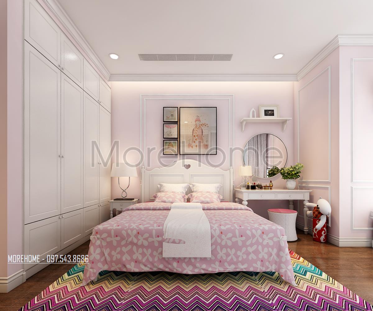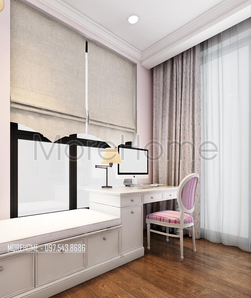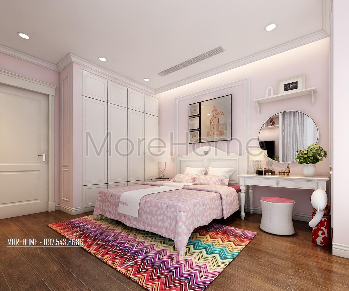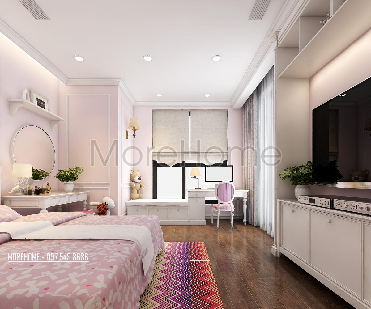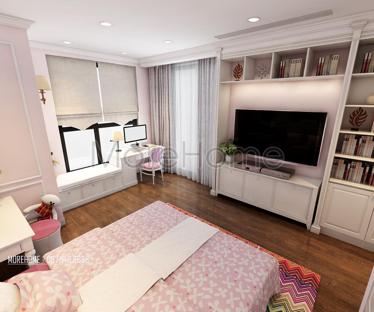 Đến với không gian nội thất phòng ngủ tân cổ điển, ta dễ dàng nhận thấy nét đẹp trong thiết kế mở rộng không gian nhờ vào sự tinh tế trong việc đặt tấm kính cường lực to rộng gần như chiếm một bức tường. Ánh sáng tự nhiên tràn vào căn phòng mang lại sức sống cho không gian và hứng khởi cho gia chủ. Tủ kệ đặt gọn gàng với các ngăn thiết kế mở tiện lợi hơn rất nhiều so với thiết kế tủ khép xưa cũ.