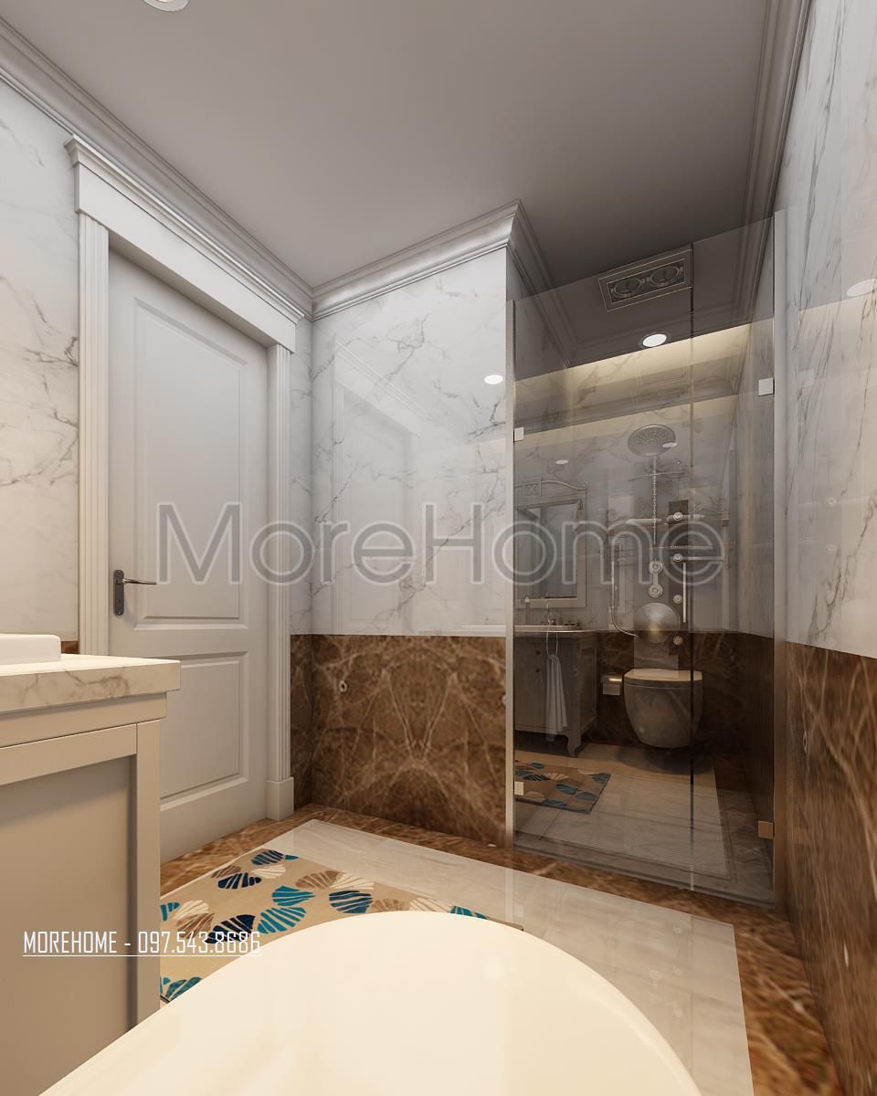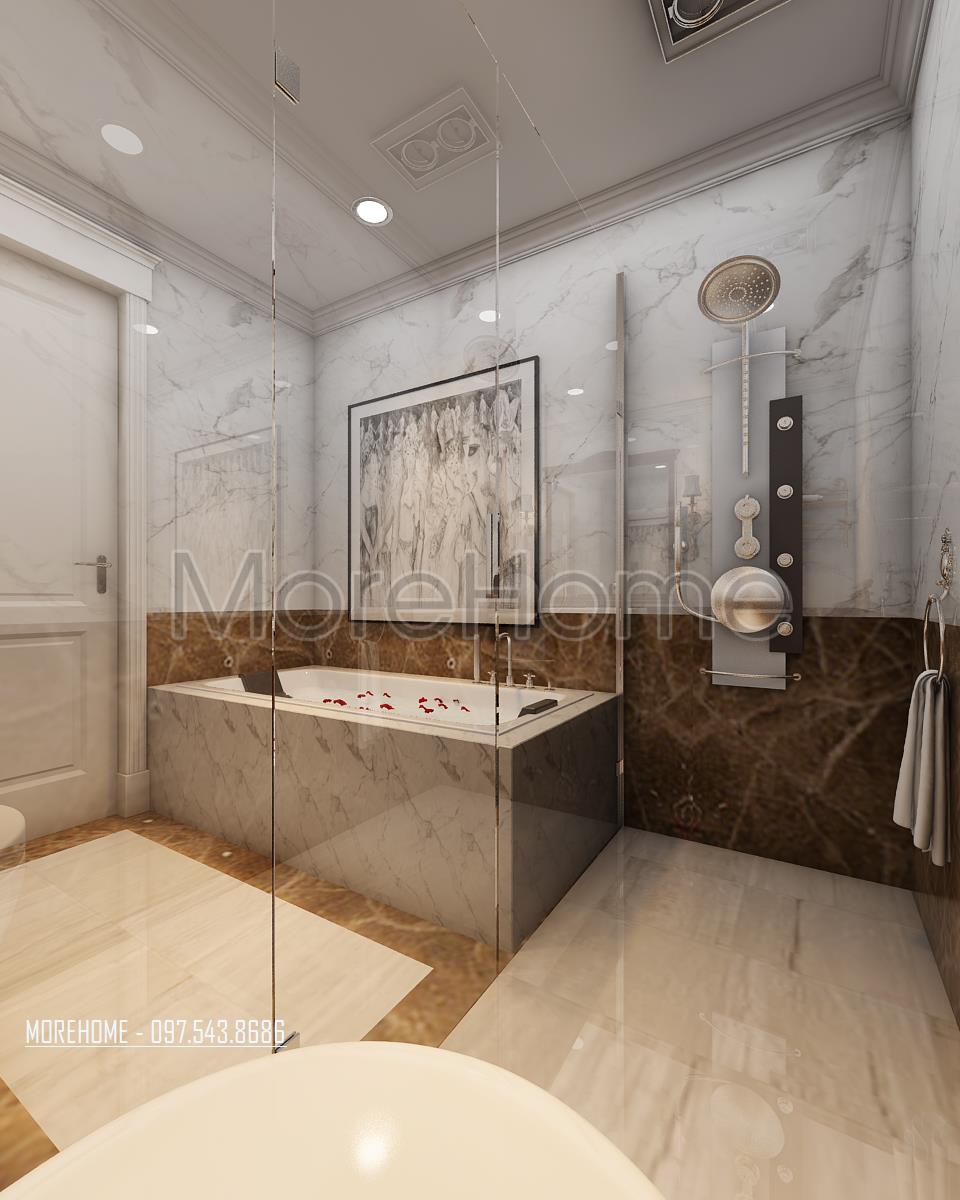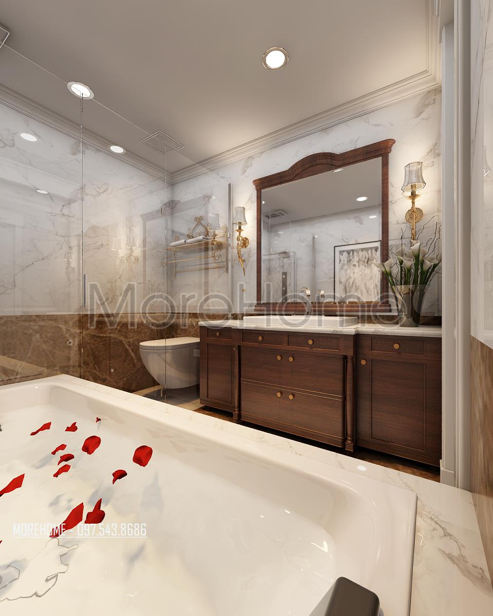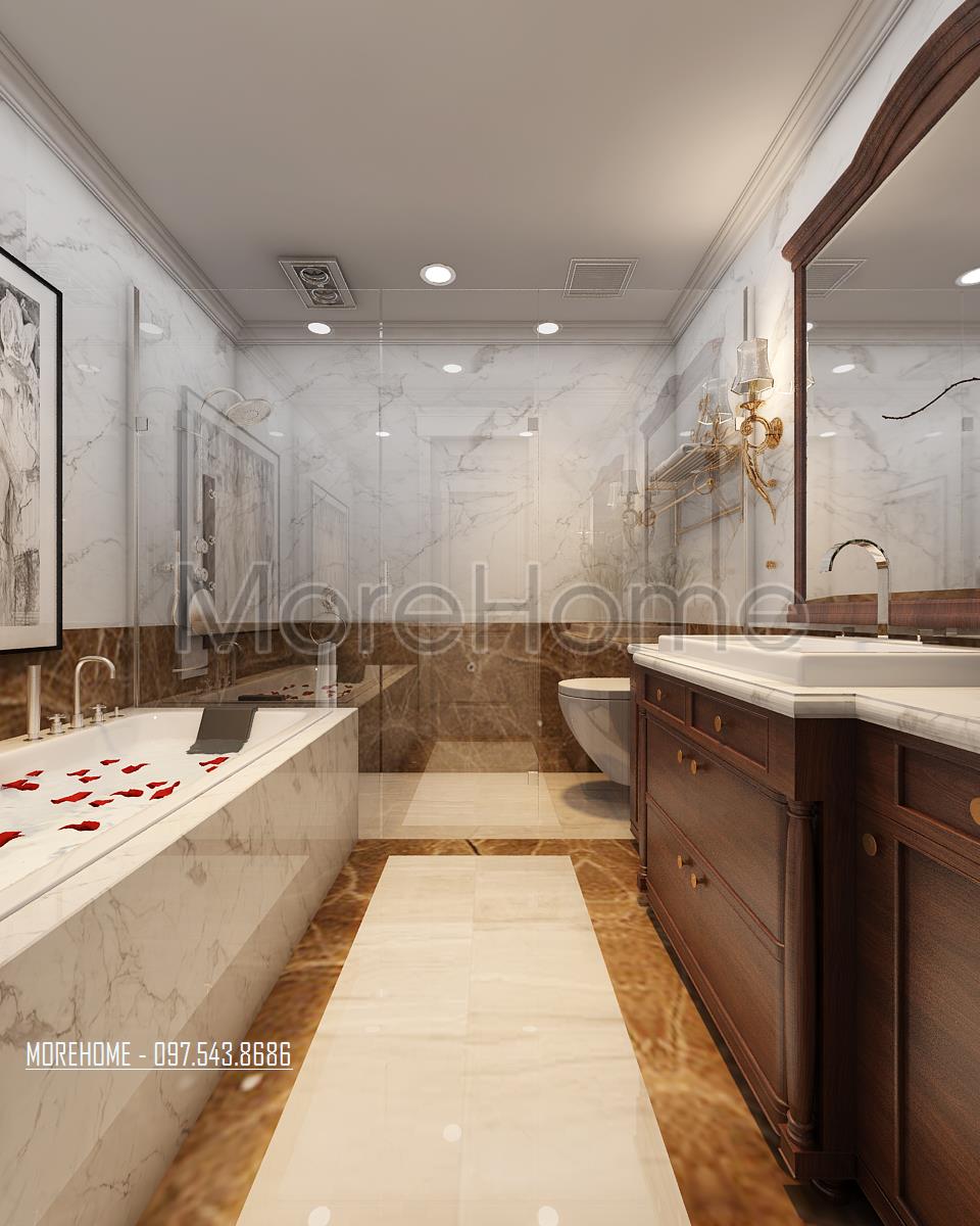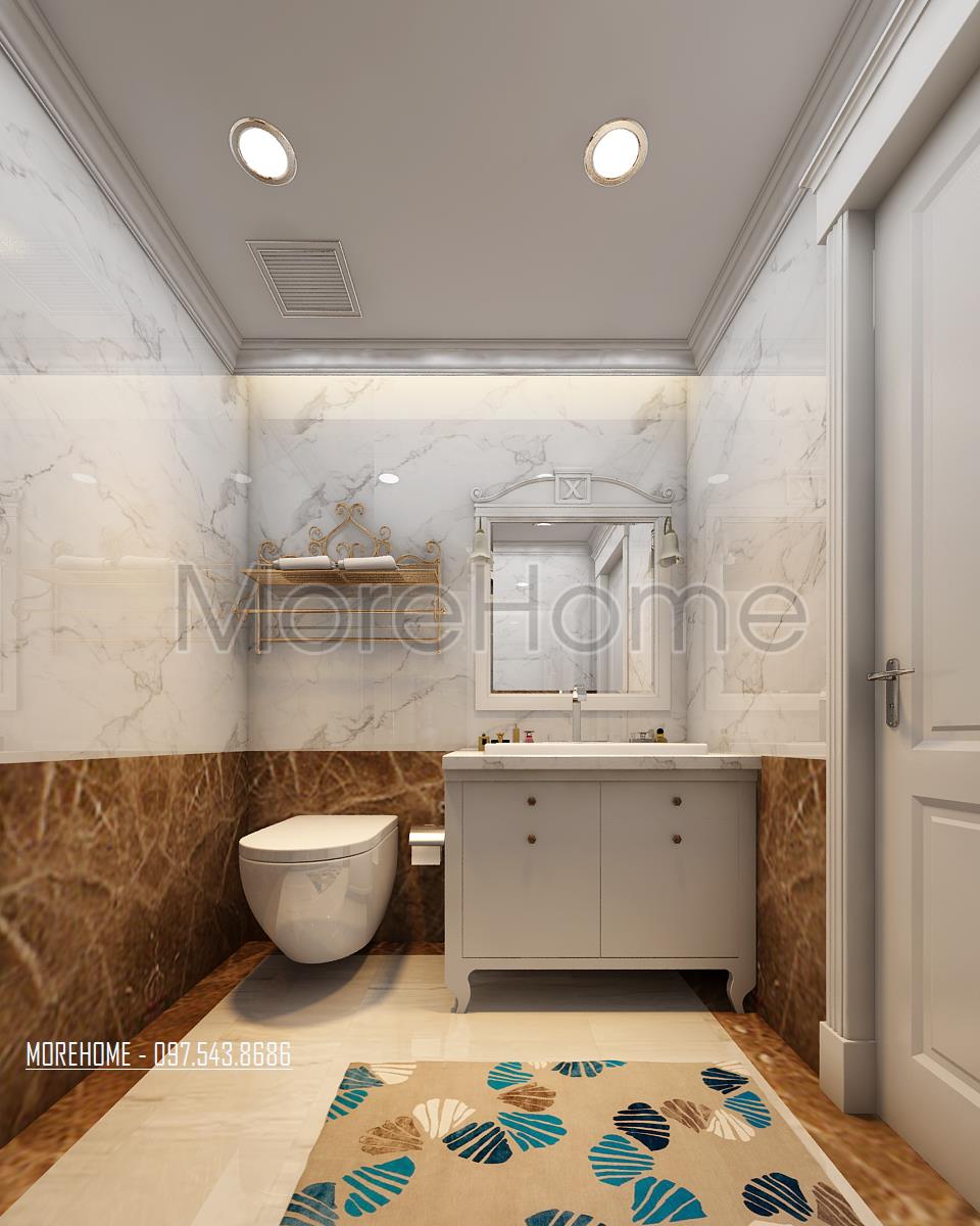 Cuối cùng là thiết kế nội thất nhà vệ sinh tân cổ điển. Không gian được tối giản hóa với các chi tiết trang trí không quá cầu kỳ. Sắc trắng tinh khôi và đường cong nhẹ nhàng trong thiết kế là một trong những yếu tố làm nên nét cổ điển châu Âu mà tác giả luôn theo suốt khắp các không gian.