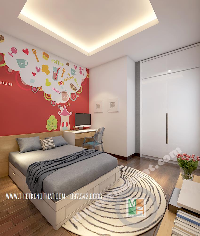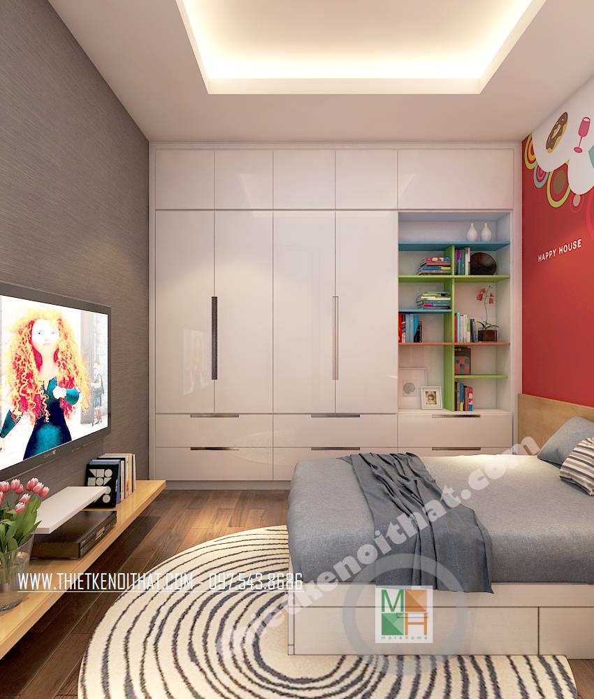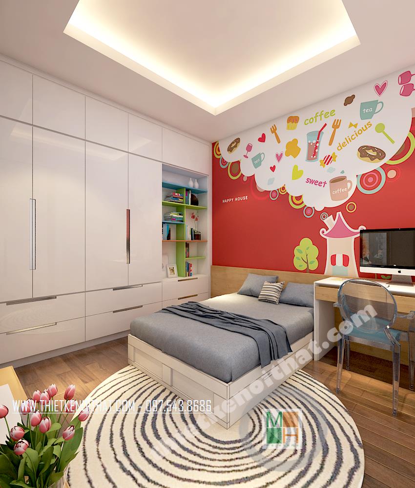 Thiết kế phòng ngủ sử dụng giấy dán tường làm điểm nhấn tạo sự nổi bật cho căn phòng. Hệ thống tủ gỗ được kết hợp với giá sách mang đến sự tiện lợi cho gia chủ.