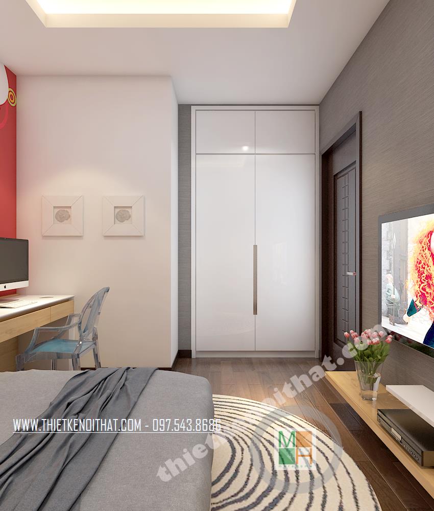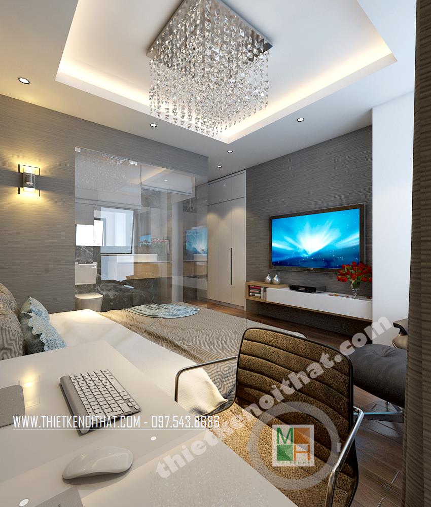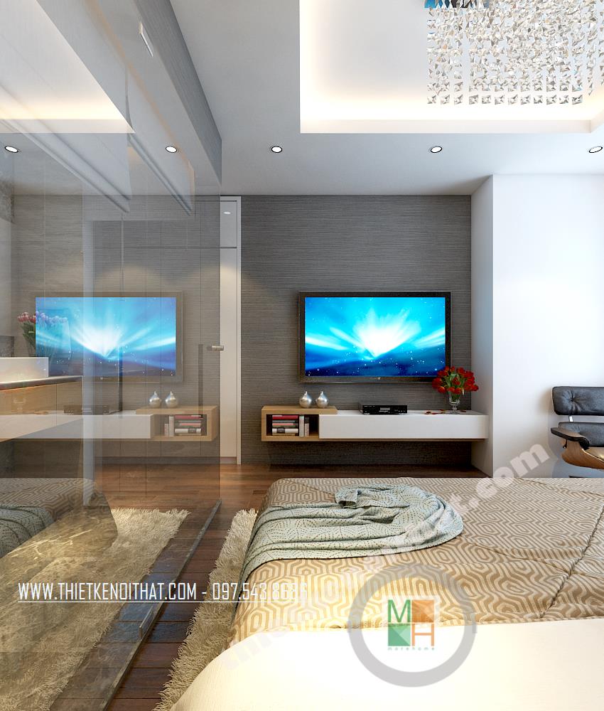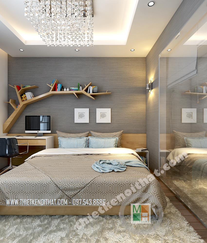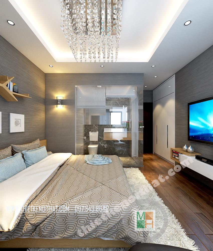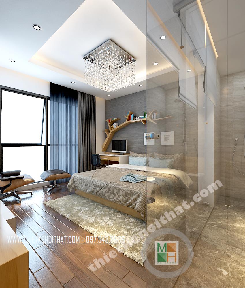 Thiết kế nội thất phòng ngủ thứ hai đơn giản hơn với màu sắc khá trầm. Một vài điểm nhấn sáng tạo trong thiết kế như giá sách , đèn ngủ giúp căn phòng bớt đơn điệu và nhàm chán. Bên cạnh đó, một điểm nổi bật của căn phòng chính là thiết kế nhà vệ sinh với vách ngăn kính sáng tạo, vừa giúp tiết kiệm không gian, lại tạo độ thoáng cho căn phòng