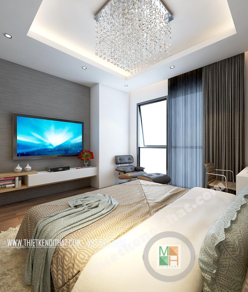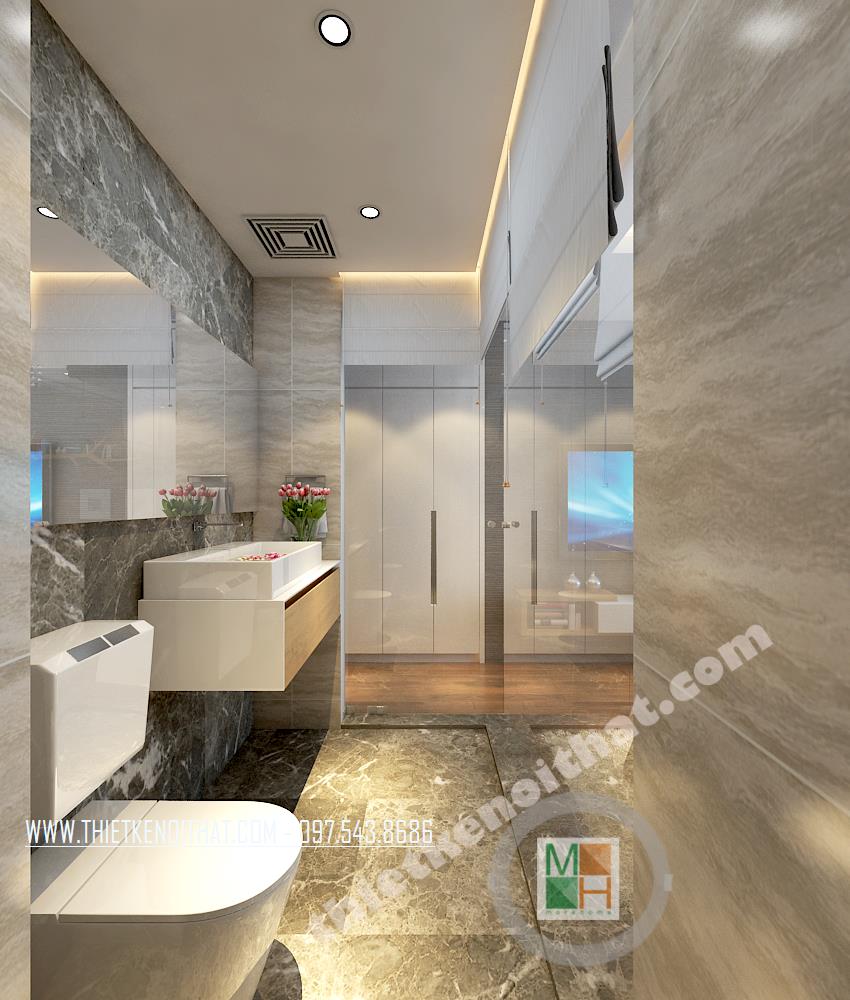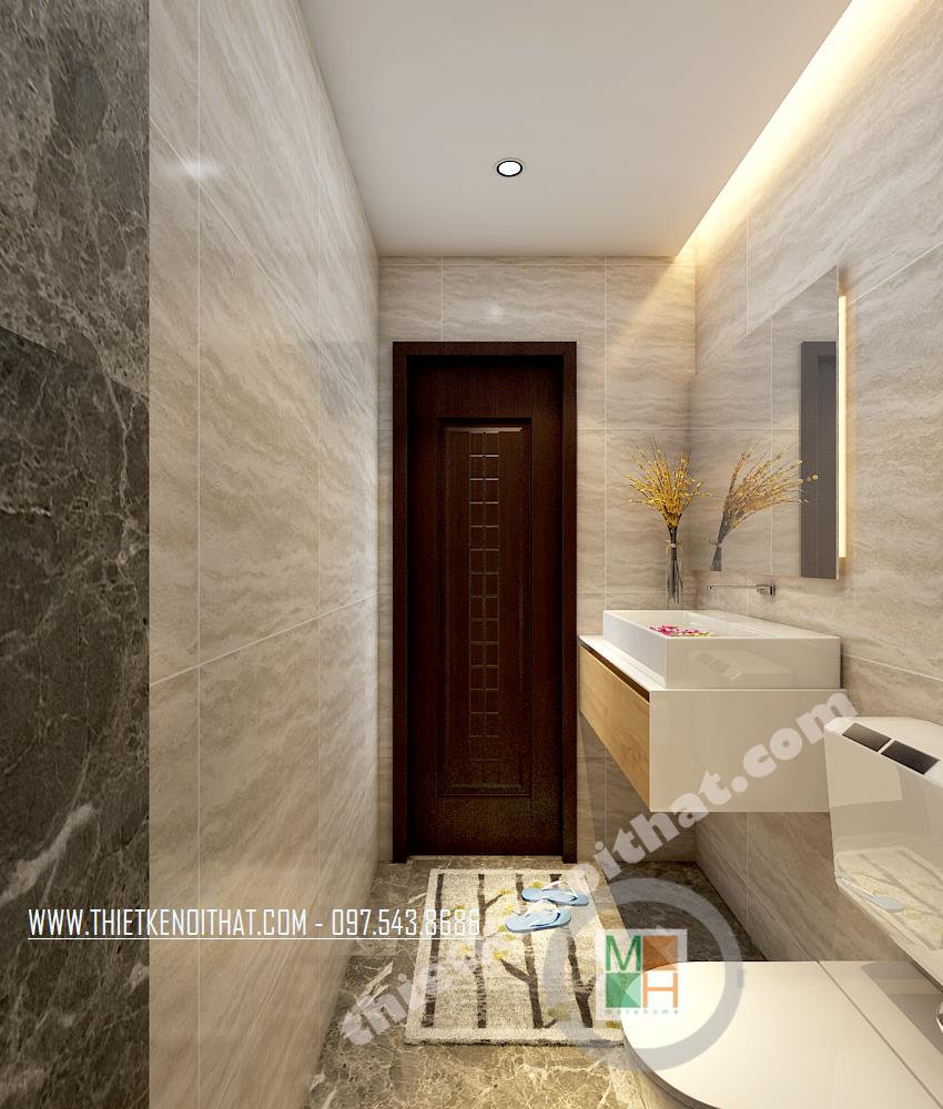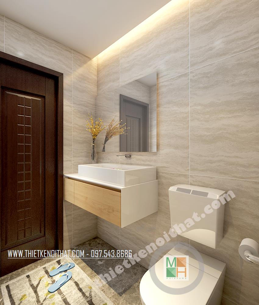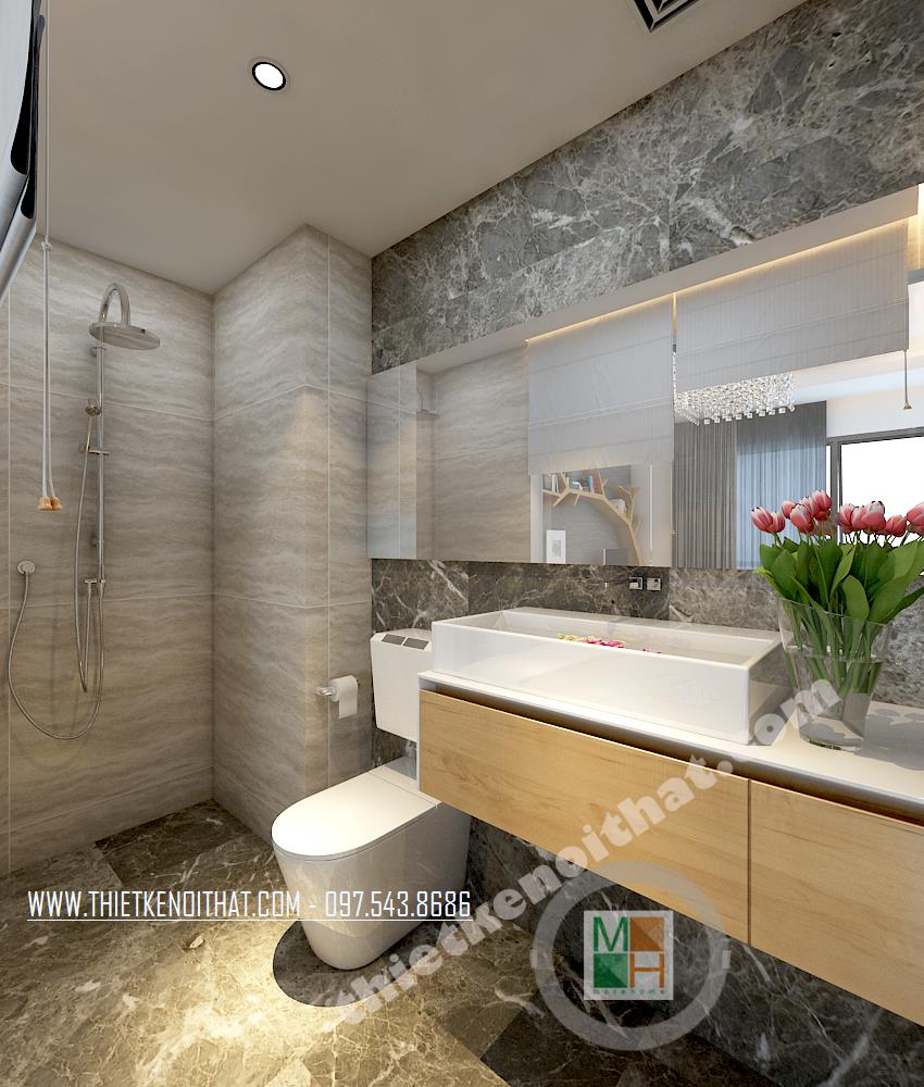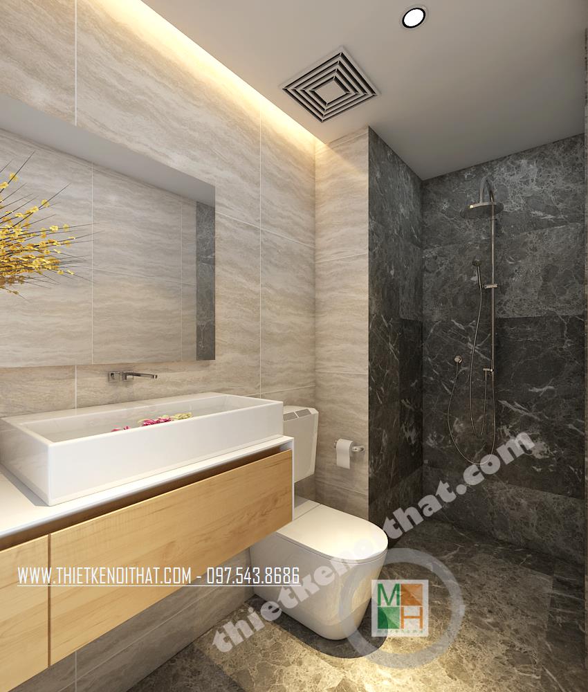 Thiết kế nội thất phòng ngủ thứ hai đơn giản hơn với màu sắc khá trầm. Một vài điểm nhấn sáng tạo trong thiết kế như giá sách , đèn ngủ giúp căn phòng bớt đơn điệu và nhàm chán. Bên cạnh đó, một điểm nổi bật của căn phòng chính là thiết kế nhà vệ sinh với vách ngăn kính sáng tạo, vừa giúp tiết kiệm không gian, lại tạo độ thoáng cho căn phòng