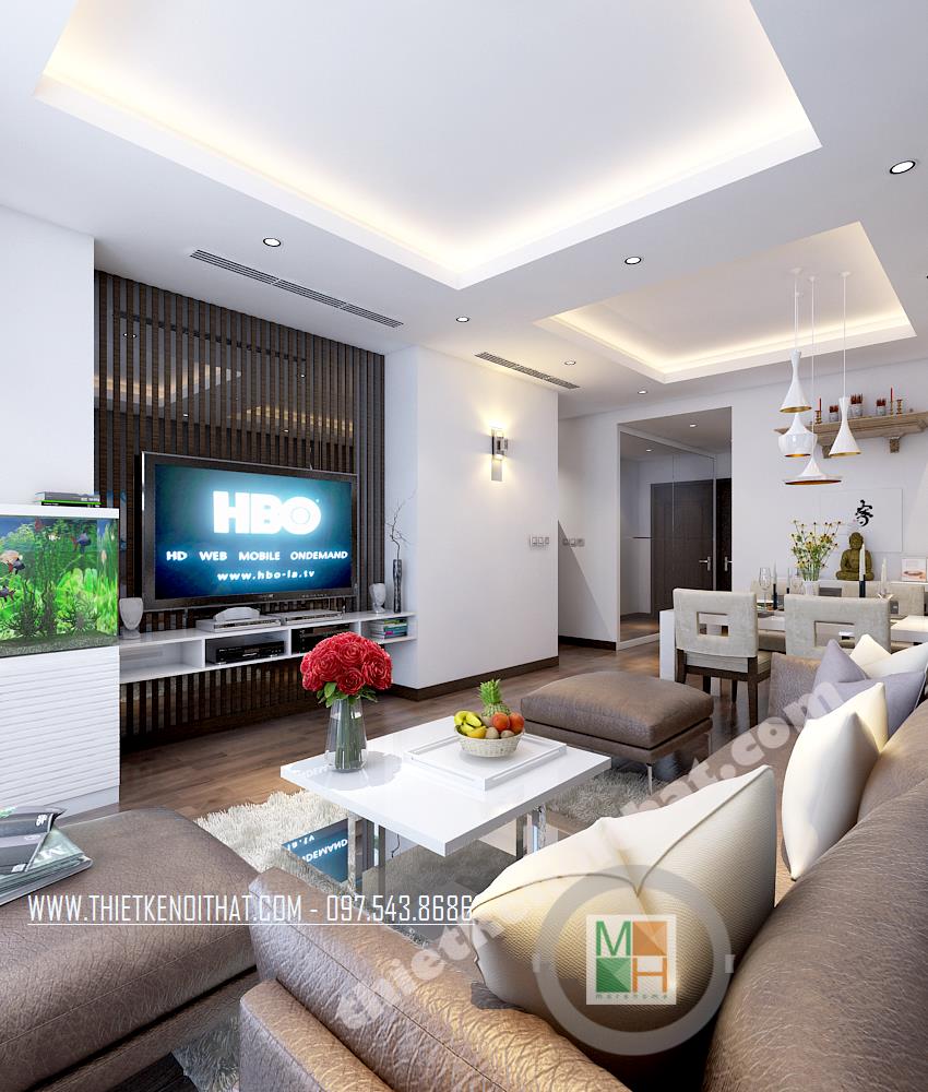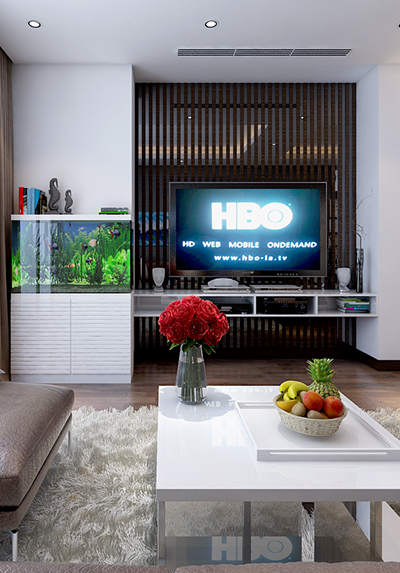 Thiết kế nội thất phòng khách sử dụng những tông màu đơn sắc cơ bản như trắng và nâu. Khung cửa sổ rộng được tận dụng tối đa để đem ánh sáng vào căn phòng từ đó giúp tạo độ thoáng và mang đến cảm giác cơi nới cho không gian sinh hoạt chung. Một trong những điểm nhấn sáng tạo và mới lạ trong căn phòng chính là bức tường kết hợp vách ngăn sau kệ tivi. Thay vì các thiết kế built-in cứng nhắc làm không gian trở nên bí bách, kiến trúc sư đã sử dụng những thanh dọc liền kề, tạo độ thoáng cho căn phòng, thu hút sự chú ý và đánh lừa cảm nhận của người nhìn, tạo không gian kéo dài hơn.