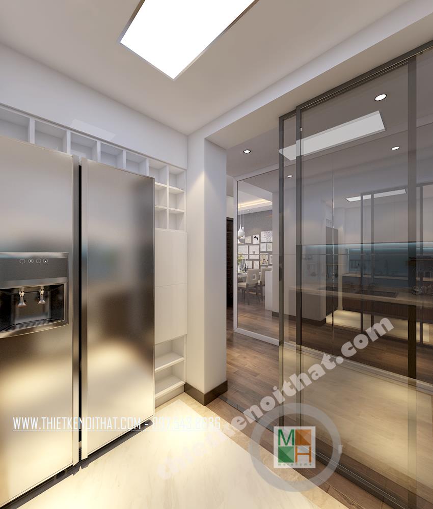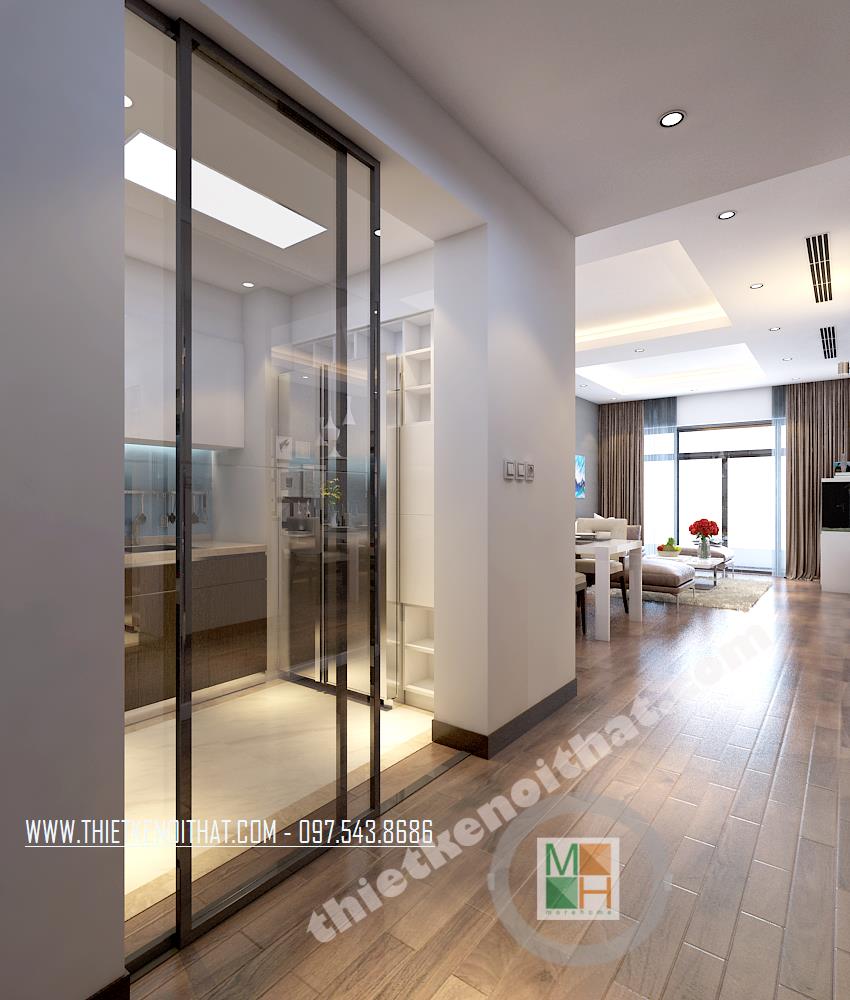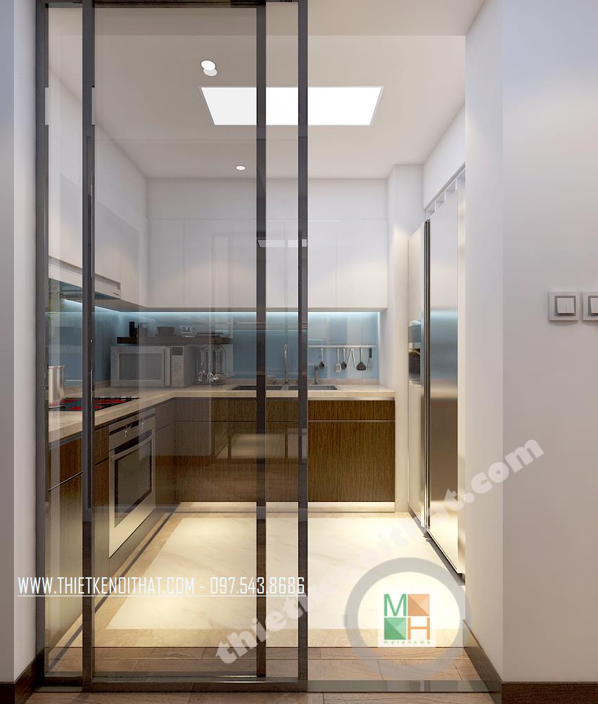 Thiết kế phòng bếp hiện đại được đặt ở một căn phòng nhỏ riêng biệt. Thay vì thiết kế cửa gỗ kín, đặc, kiến trúc sư đã sử dụng của kính giúp tạo độ thoáng cho không gian phòng bếp nhỏ, hẹp. Tuy diện tích không quá lớn nhưng với các thiết kế phòng bếp đơn giản, màu đơn sắc là chủ yếu đã giúp không gian bếp trở nên gọn gàng và trang nhã hơn rất nhiều.