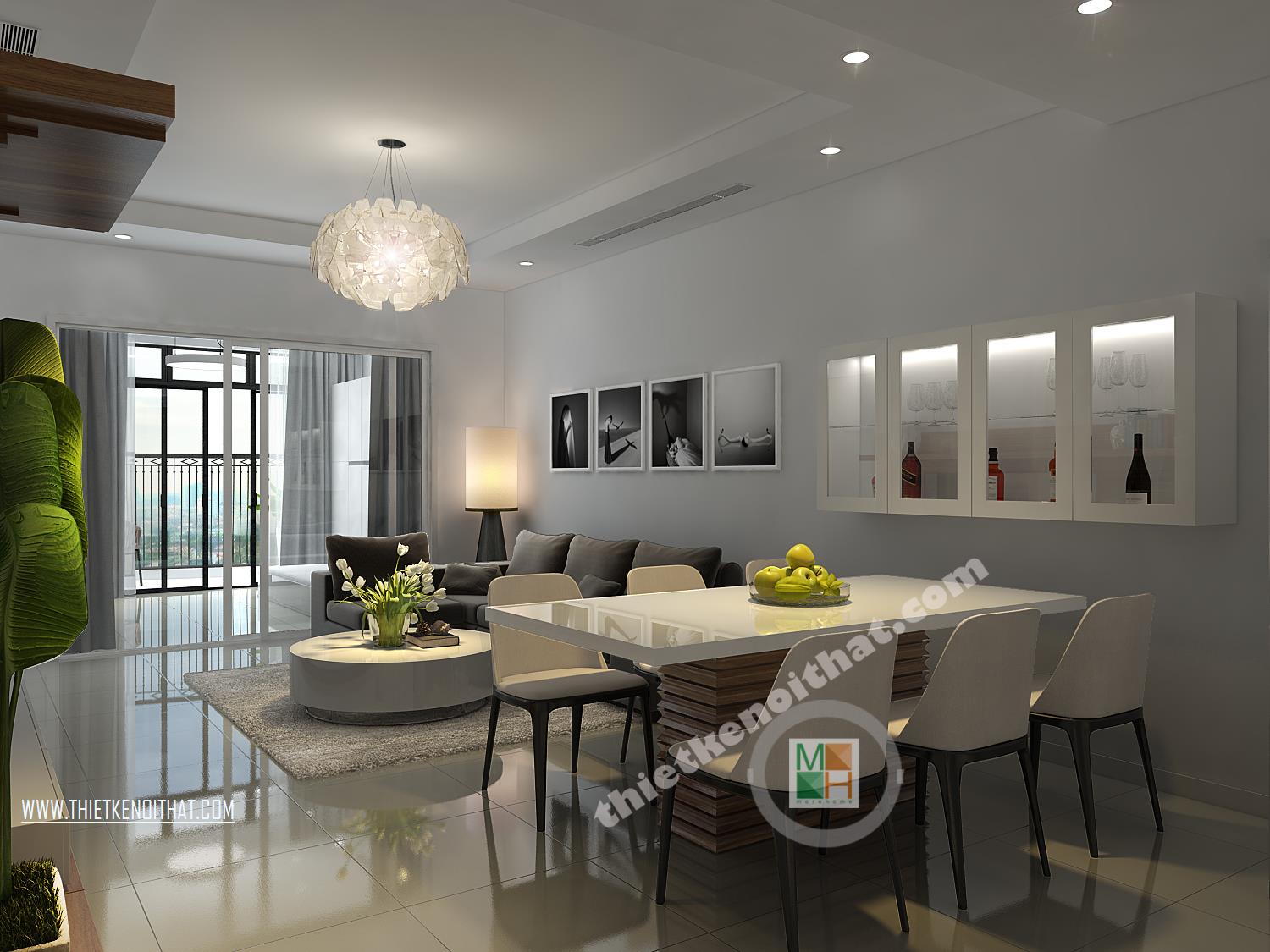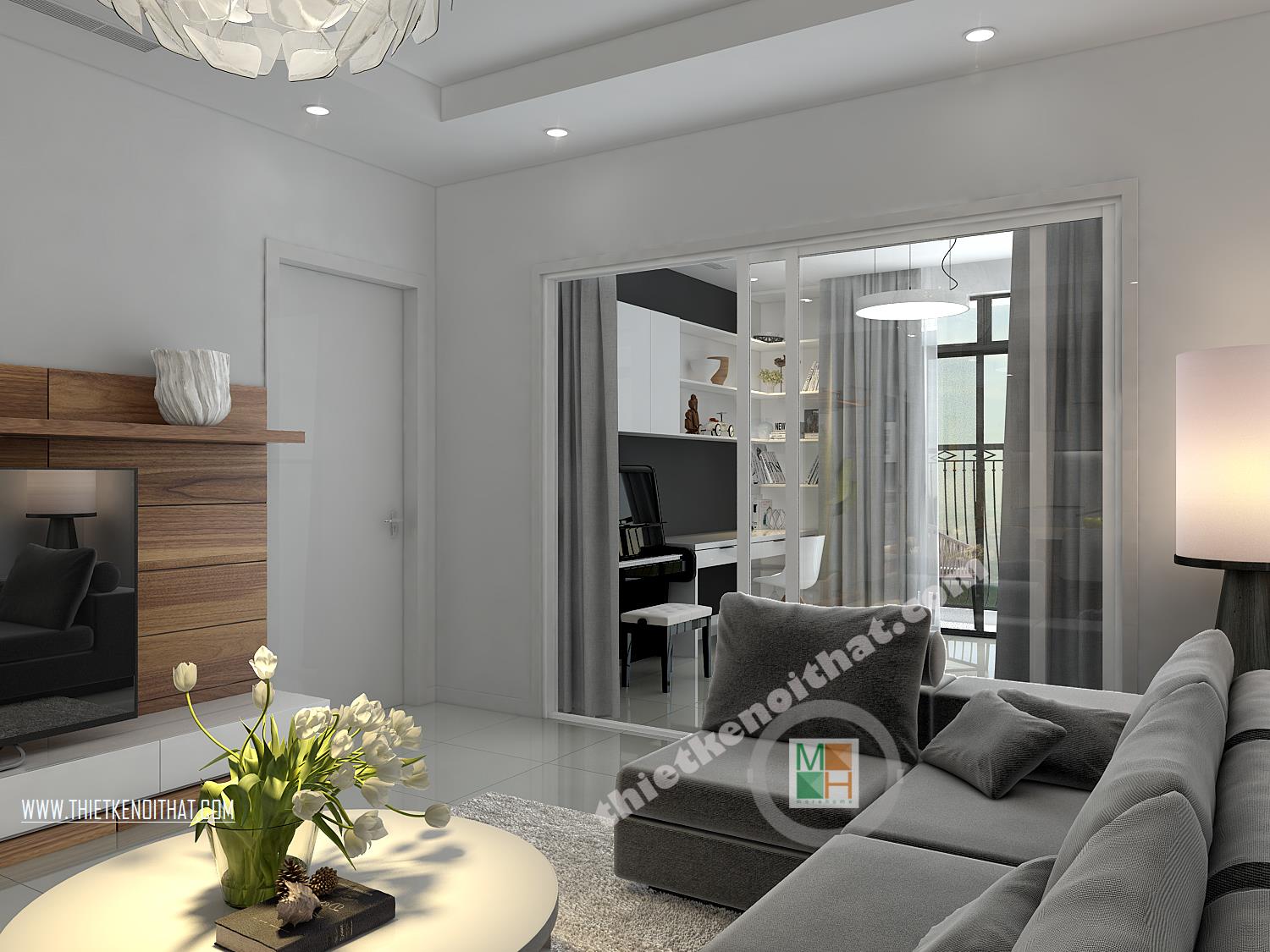 Thiết kế phòng khách đơn giản thông suốt với không gian phòng làm việc bằng lớp cửa kính trong suốt. Không gian làm việc và học tập được ưu ái thông suốt với ban công hướng ra sân trời mang đến một không gian sống đầy hứng khởi và thư giãn. Thiết kế không gian tối giản với kệ tủ thiết kế đồng nhất với tường giúp tiết kiệm không gian. Bàn học và khu luyện đàn piano thiết kế tối giản hóa mang phong cách trẻ trung và hiện đại, phù hợp với phong cách thiết kế chung của cả căn hộ.