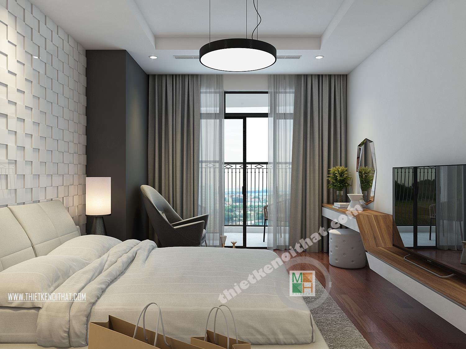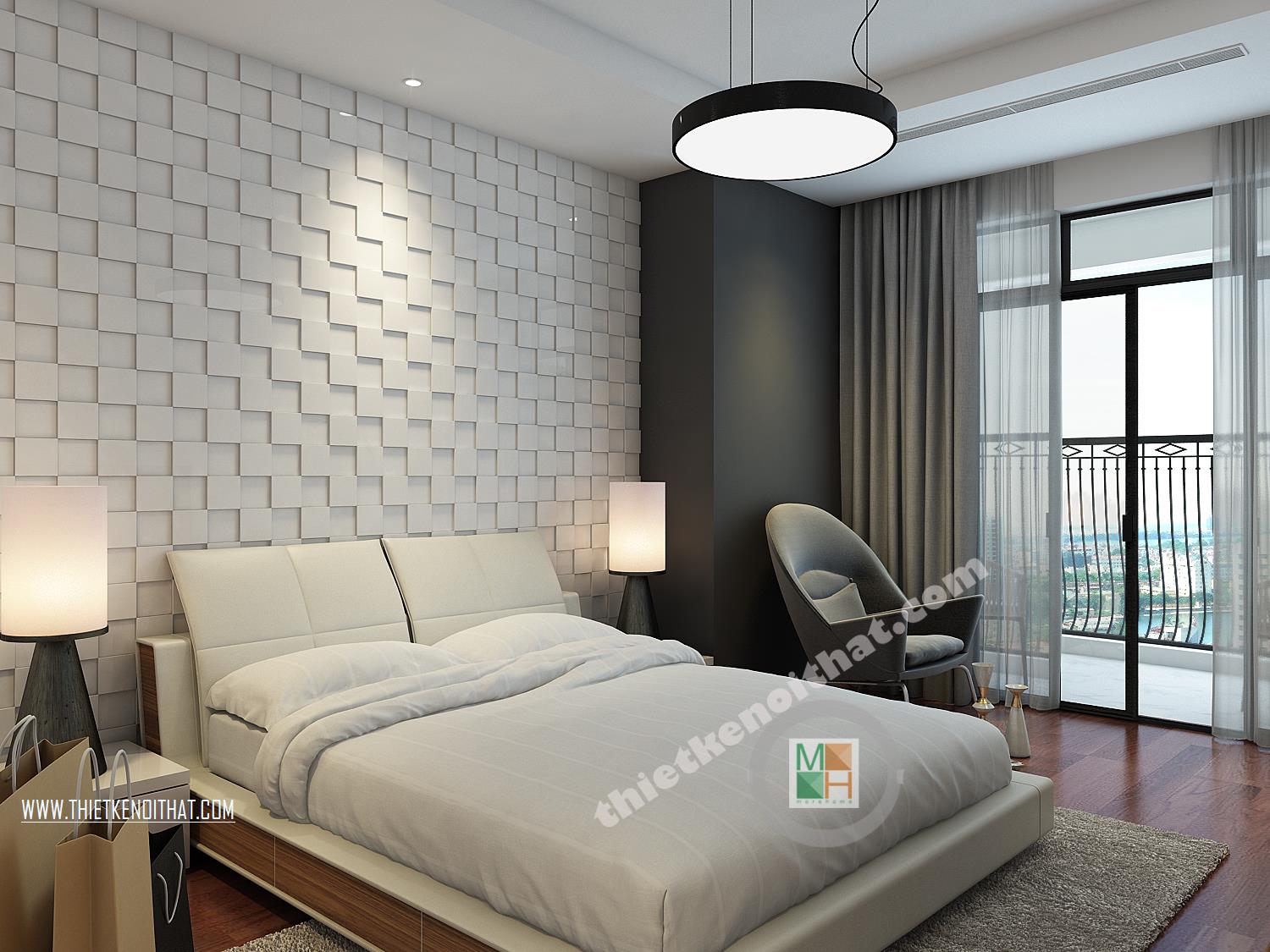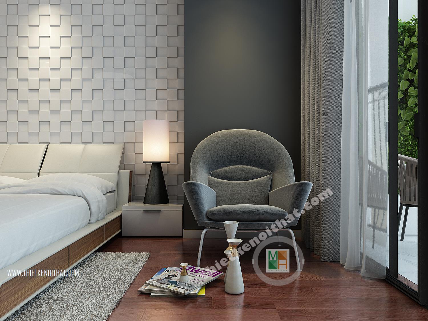 Thiết kế nội thất phòng ngủ hiện đại gây ấn tượng mạnh với thiết kế cách tân sáng tạo sử dụng những hình khối và màu sắc đơn giản. Với bức tường thô cứng, đơn điệu, kiến trúc sư đã xử lý khéo léo tạo thành một khối hình nổi 3D đặc sắc, tông màu trắng vẫn được giữ nguyên vẹn đảm bảo không làm mất đi tính thống nhất trong thiết kế nội thất. Trong nguyên tắc thiết kế nói chung và sử dụng màu sắc nói riêng, một không gian không nên sử dụng quá 3 màu khác biệt, không gian phòng ngủ lại là nơi thư giản và cần sự thoải mái, sự lựa chọn tông màu xám khói và trắng là hai tông màu trung tính hài hòa được nghiên cứu là rất phù hợp để mai lại cảm giác gần gũi và an tâm cho gia chủ. Khung cửa ra sân trời mở rộng đón ánh sáng tự nhiên mang lại sức sống cho căn phòng. Thiết kế kệ tủ theo phong cách tối giản giúp tiết kiệm không gian mà vẫn đảm bảo tính công năng sử dụng. Thiết kế vườn treo nhỏ ngay phía ban công là điểm nhấn xanh đầy đặc trưng cho các thiết kế hiện đại gần đây mang đến một không gian sống thân thiện và tích cực.