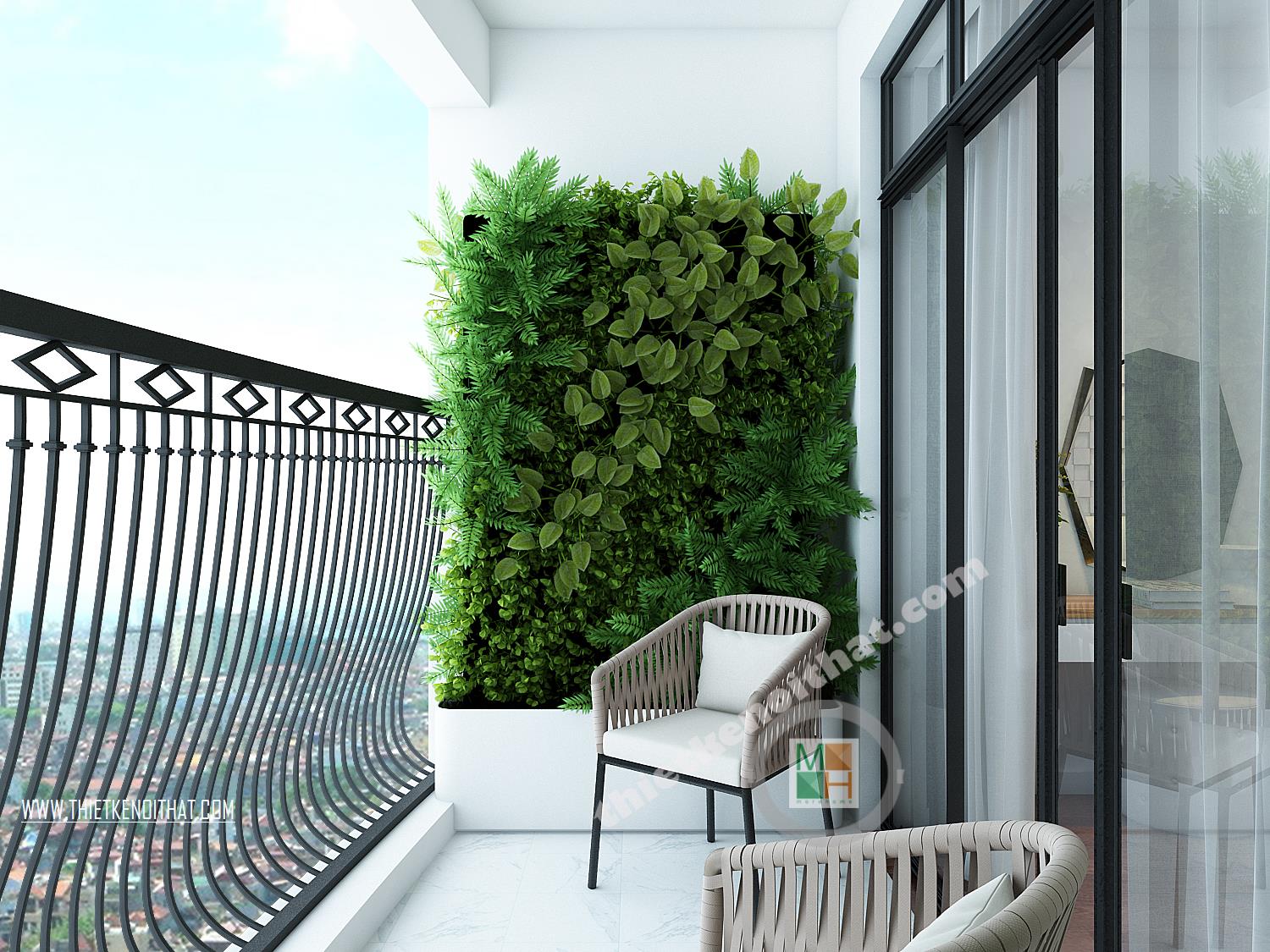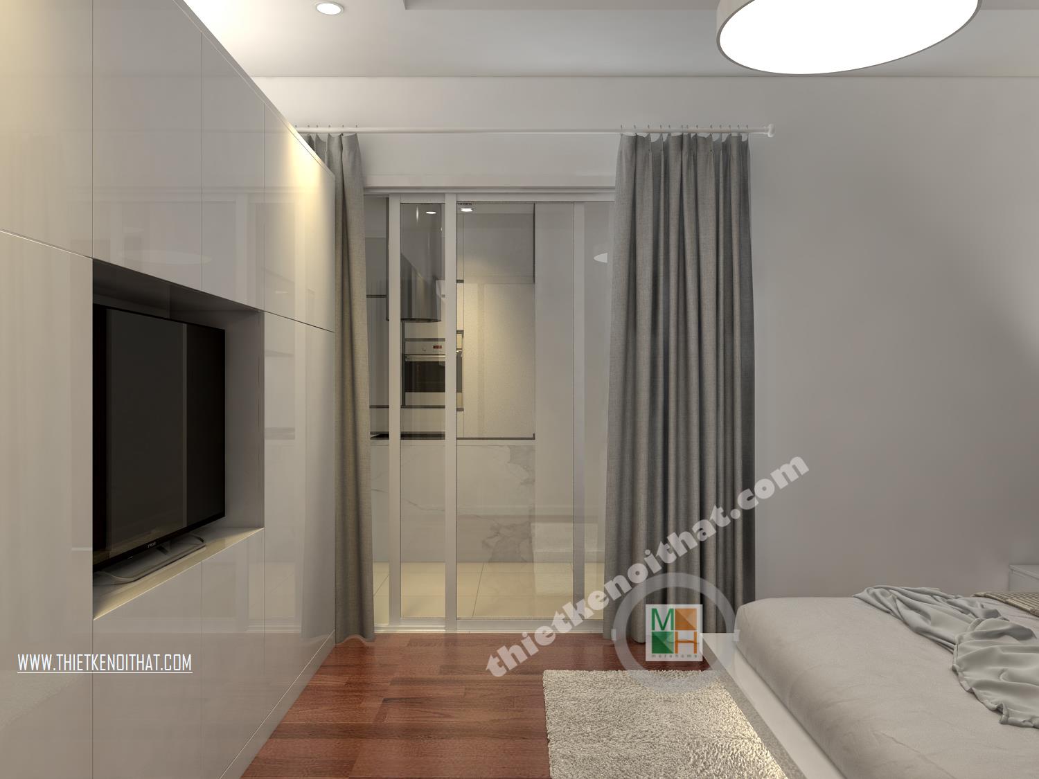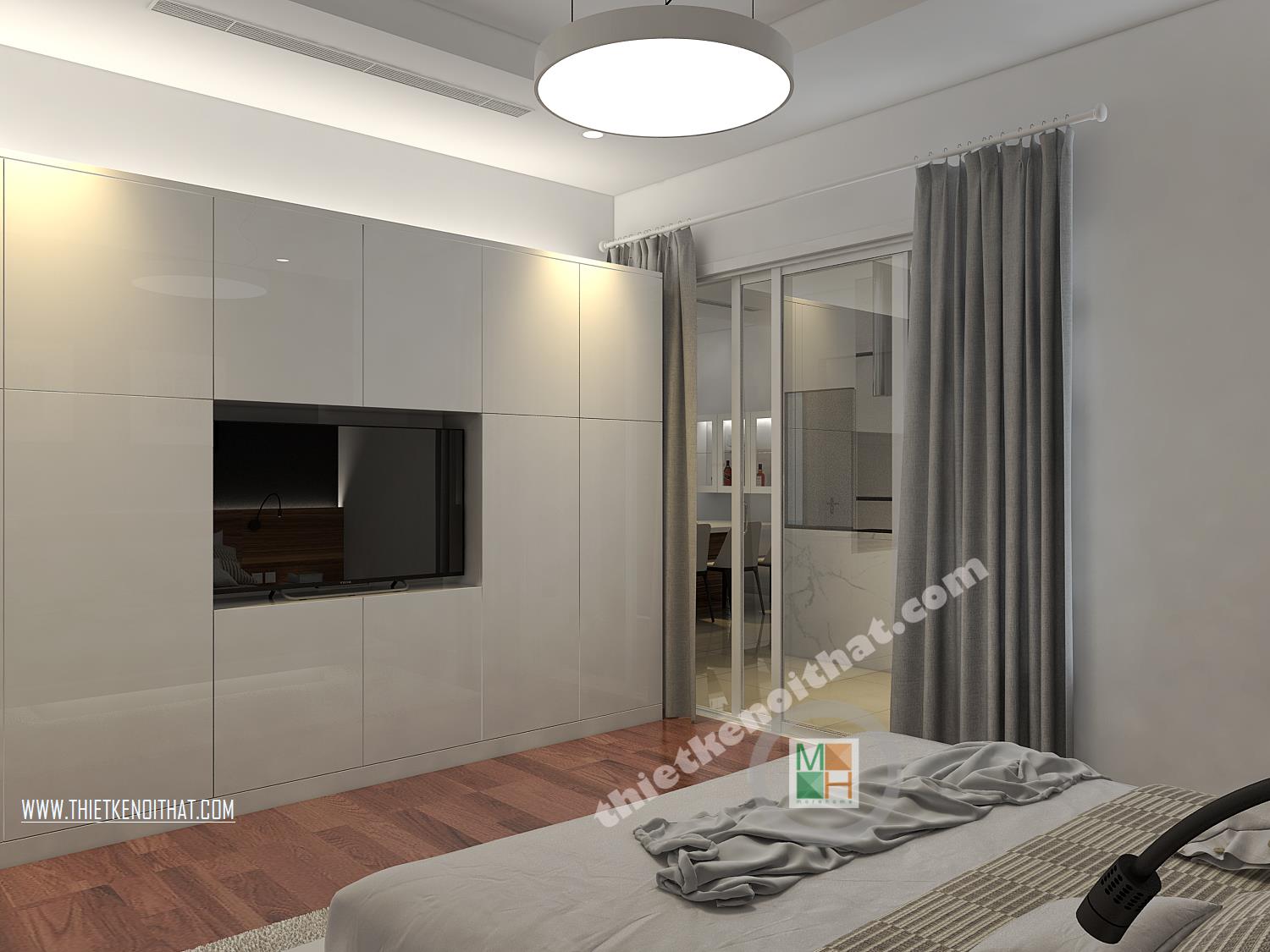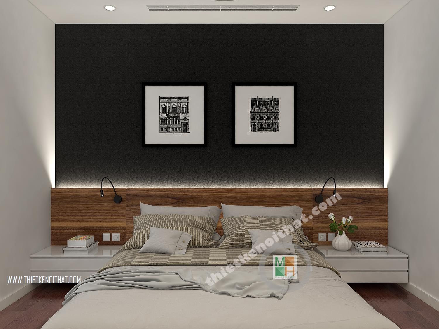 Thiết kế nội thất phòng ngủ hiện đại gây ấn tượng mạnh với thiết kế cách tân sáng tạo sử dụng những hình khối và màu sắc đơn giản. Với bức tường thô cứng, đơn điệu, kiến trúc sư đã xử lý khéo léo tạo thành một khối hình nổi 3D đặc sắc, tông màu trắng vẫn được giữ nguyên vẹn đảm bảo không làm mất đi tính thống nhất trong thiết kế nội thất. Trong nguyên tắc thiết kế nói chung và sử dụng màu sắc nói riêng, một không gian không nên sử dụng quá 3 màu khác biệt, không gian phòng ngủ lại là nơi thư giản và cần sự thoải mái, sự lựa chọn tông màu xám khói và trắng là hai tông màu trung tính hài hòa được nghiên cứu là rất phù hợp để mai lại cảm giác gần gũi và an tâm cho gia chủ. Khung cửa ra sân trời mở rộng đón ánh sáng tự nhiên mang lại sức sống cho căn phòng. Thiết kế kệ tủ theo phong cách tối giản giúp tiết kiệm không gian mà vẫn đảm bảo tính công năng sử dụng. Thiết kế vườn treo nhỏ ngay phía ban công là điểm nhấn xanh đầy đặc trưng cho các thiết kế hiện đại gần đây mang đến một không gian sống thân thiện và tích cực.