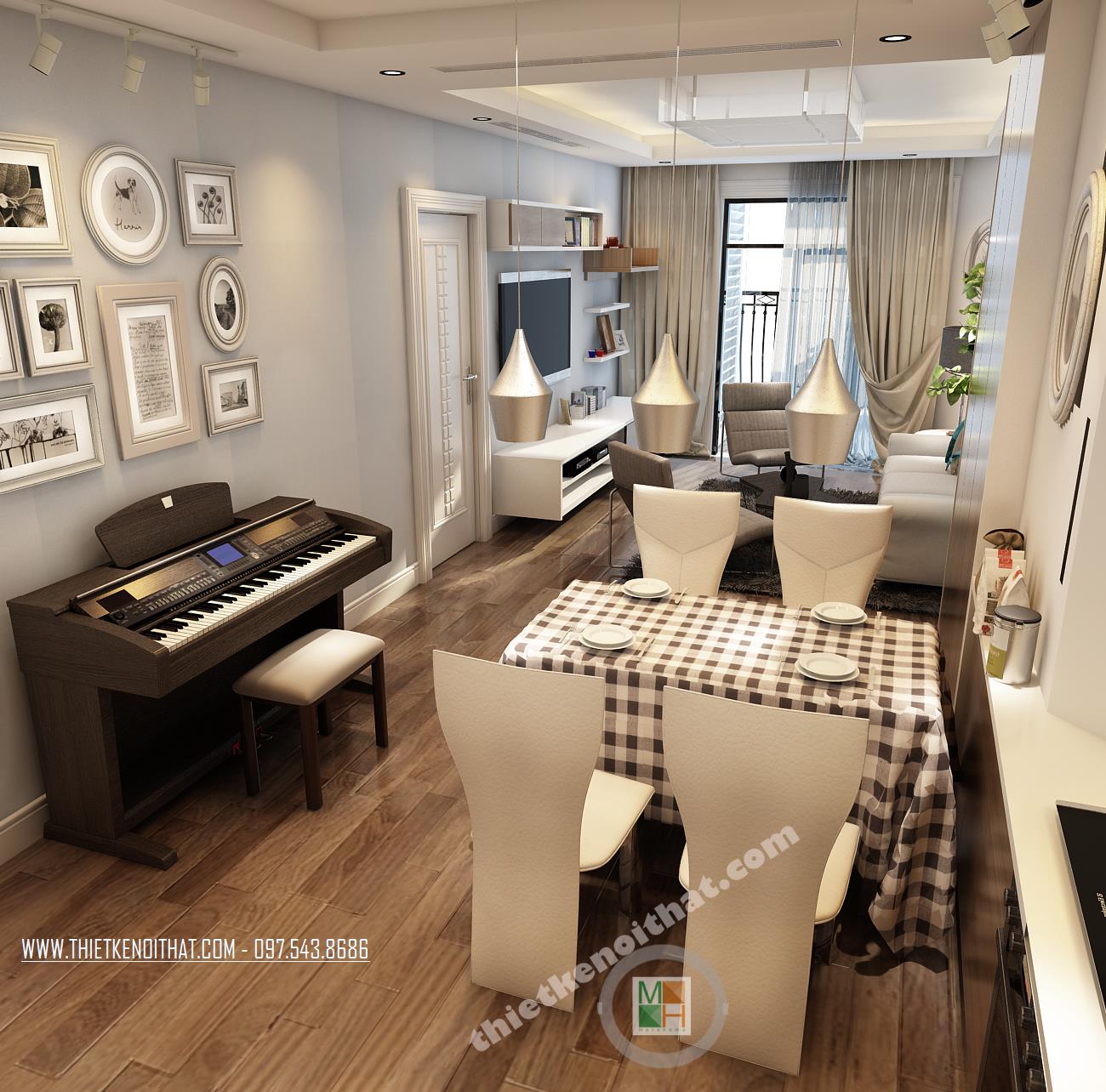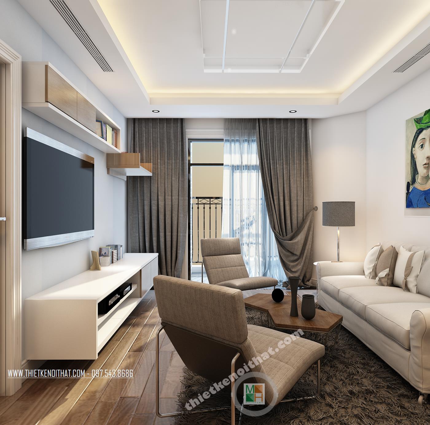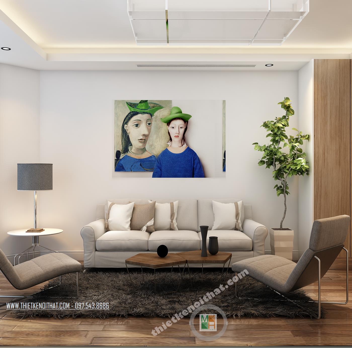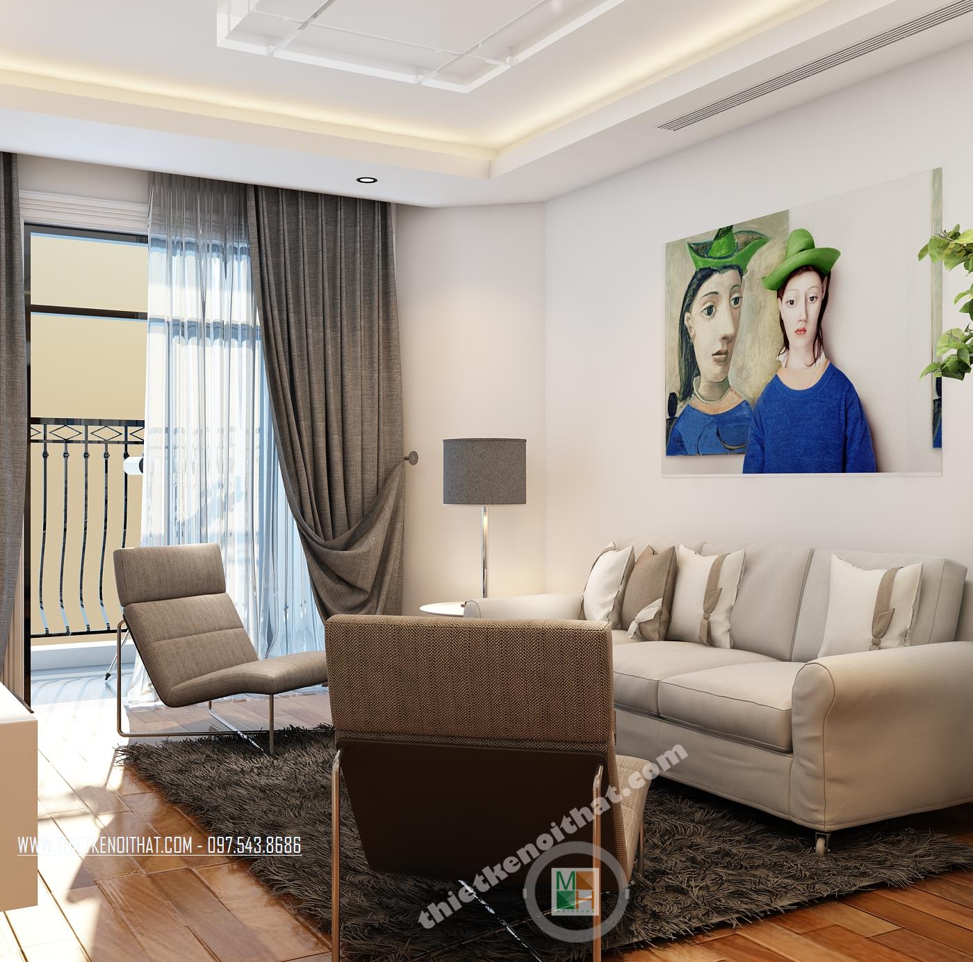 Thiết kế phòng khách nhấn mạnh đến sự đơn giản và hiện đại. Khung cửa sổ mở rộng hướng ra ban công tạo độ thoáng và mang view rộng cho căn phòng. Thiết kế sofa và các vật dụng đơn sắc trang nhã và nhẹ nhàng. Tuy vậy nhưng không thể thiếu được sự điểm xuyết tinh tế không gian xanh của chậy cây hay bức tranh treo tường cách tân sáng tạo giúp xóa tan sự đơn điệu và nhàm chán.