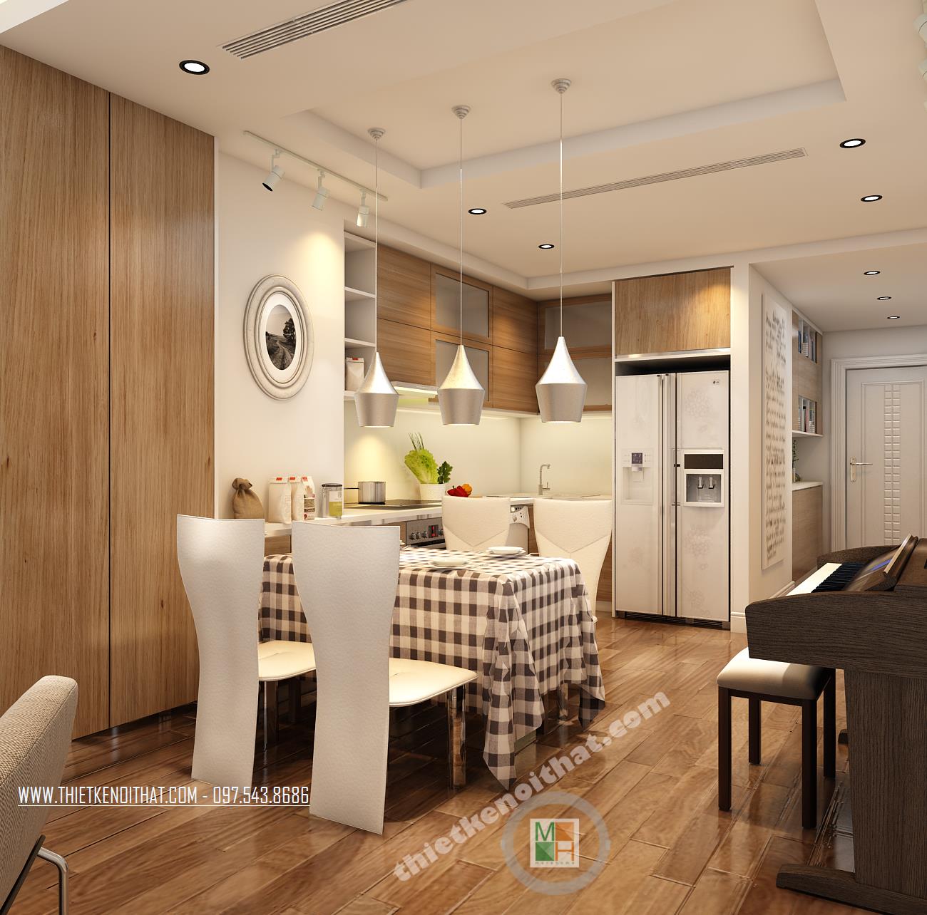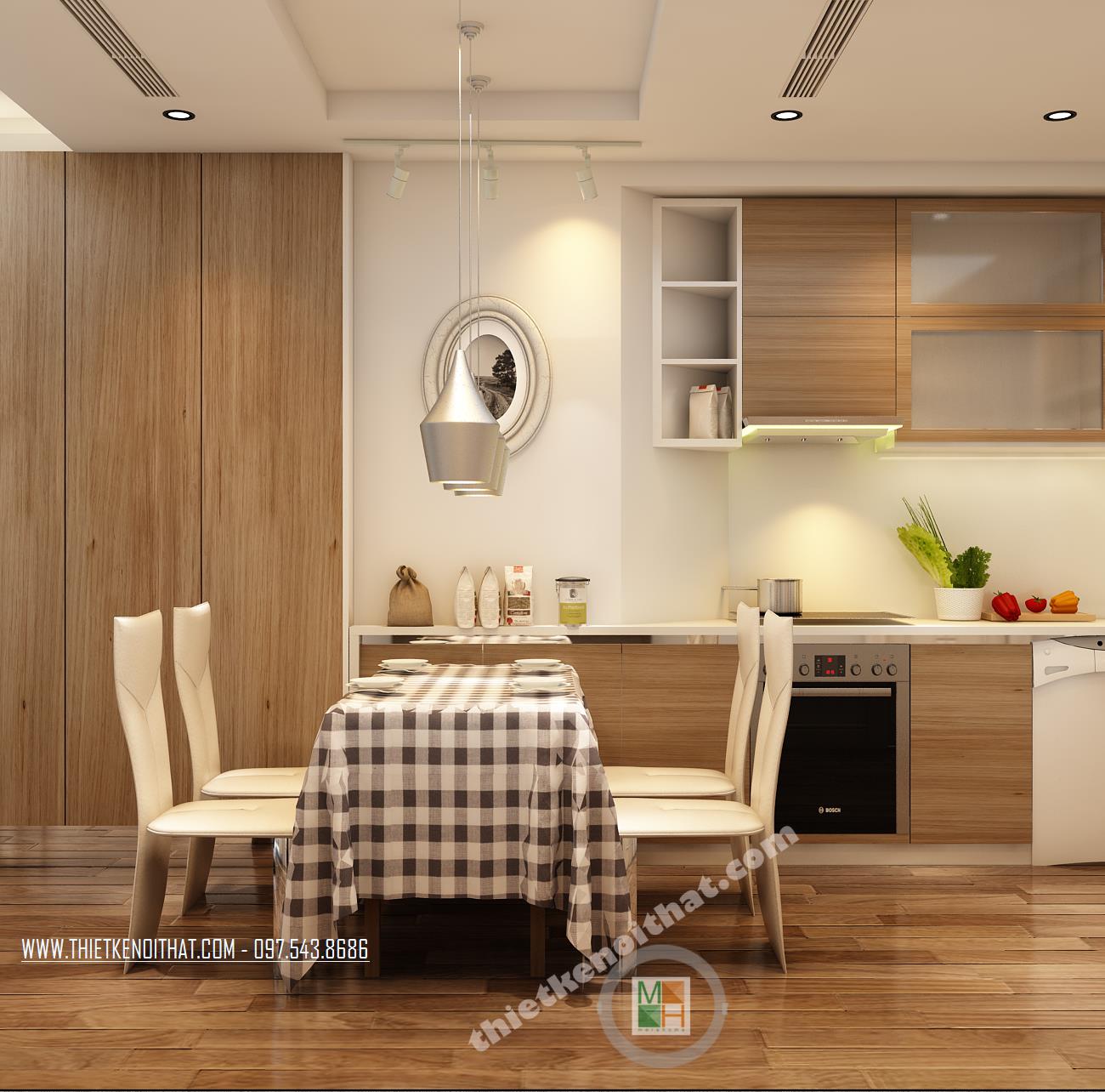 Thiết kế bàn ăn và phòng bếp được đặt gọn gàng ngay phía lối vào nhà. Không gian bếp vừa phải phù hợp với căn nhà và mong muốn của gia chủ. Hệ thống tủ bếp thiết kế đơn giản và sang trọng với tông màu veneer nâu gỗ được khéo léo kết hợp kính cường lực tạo độ thoáng cho không gian tủ.