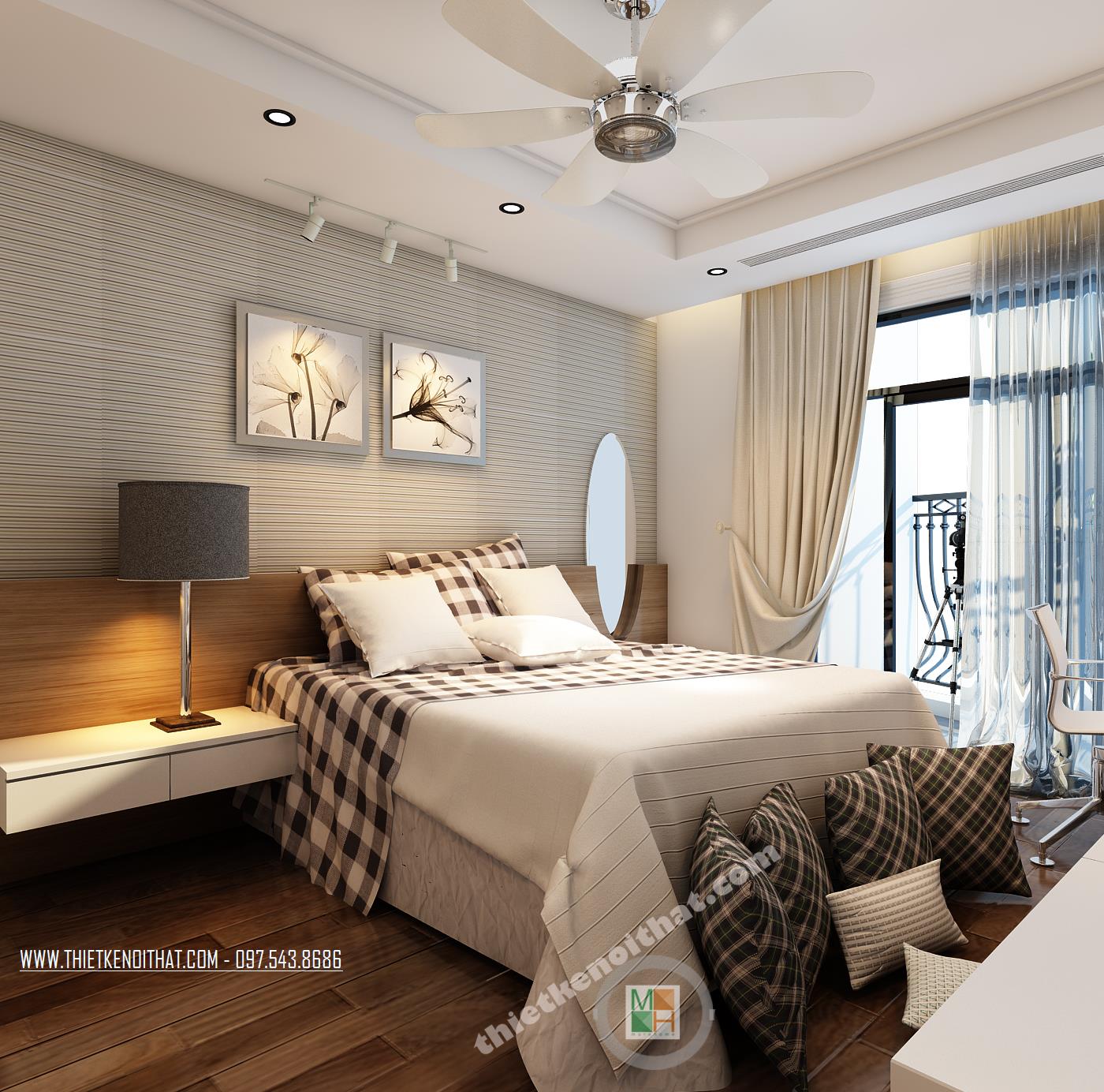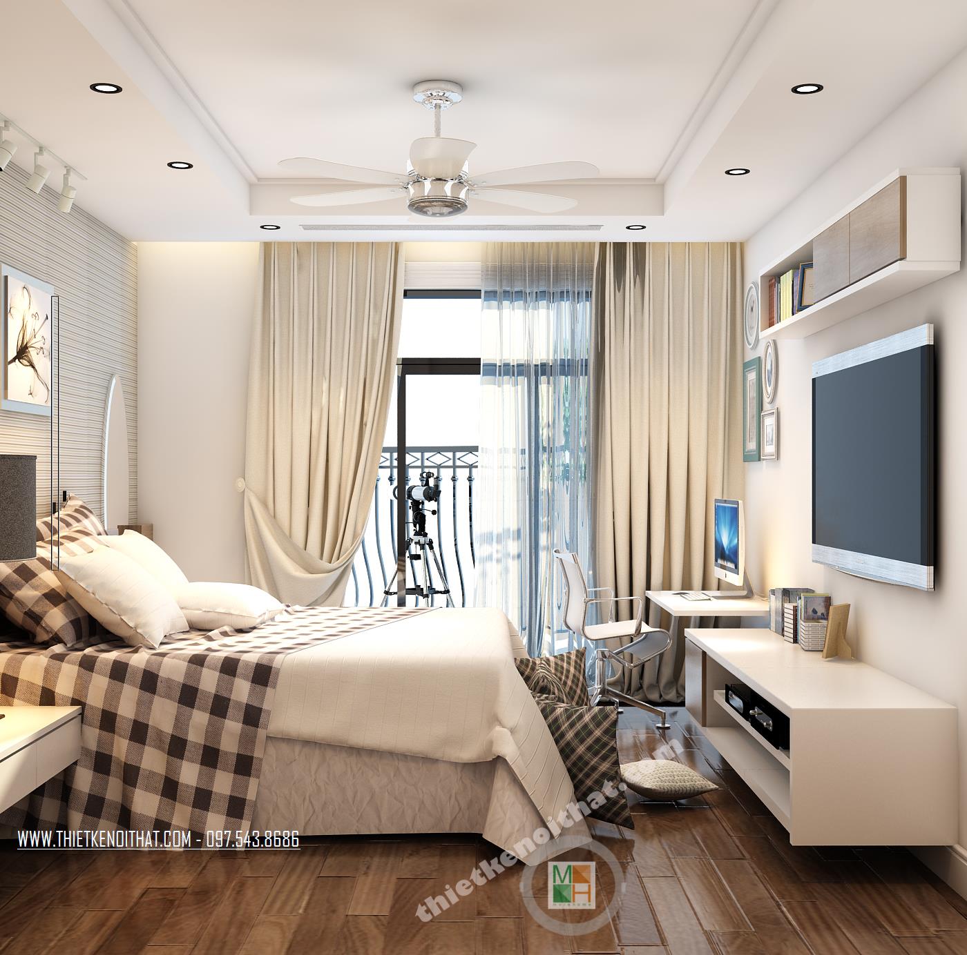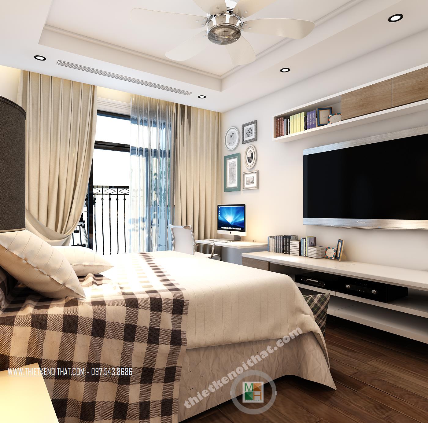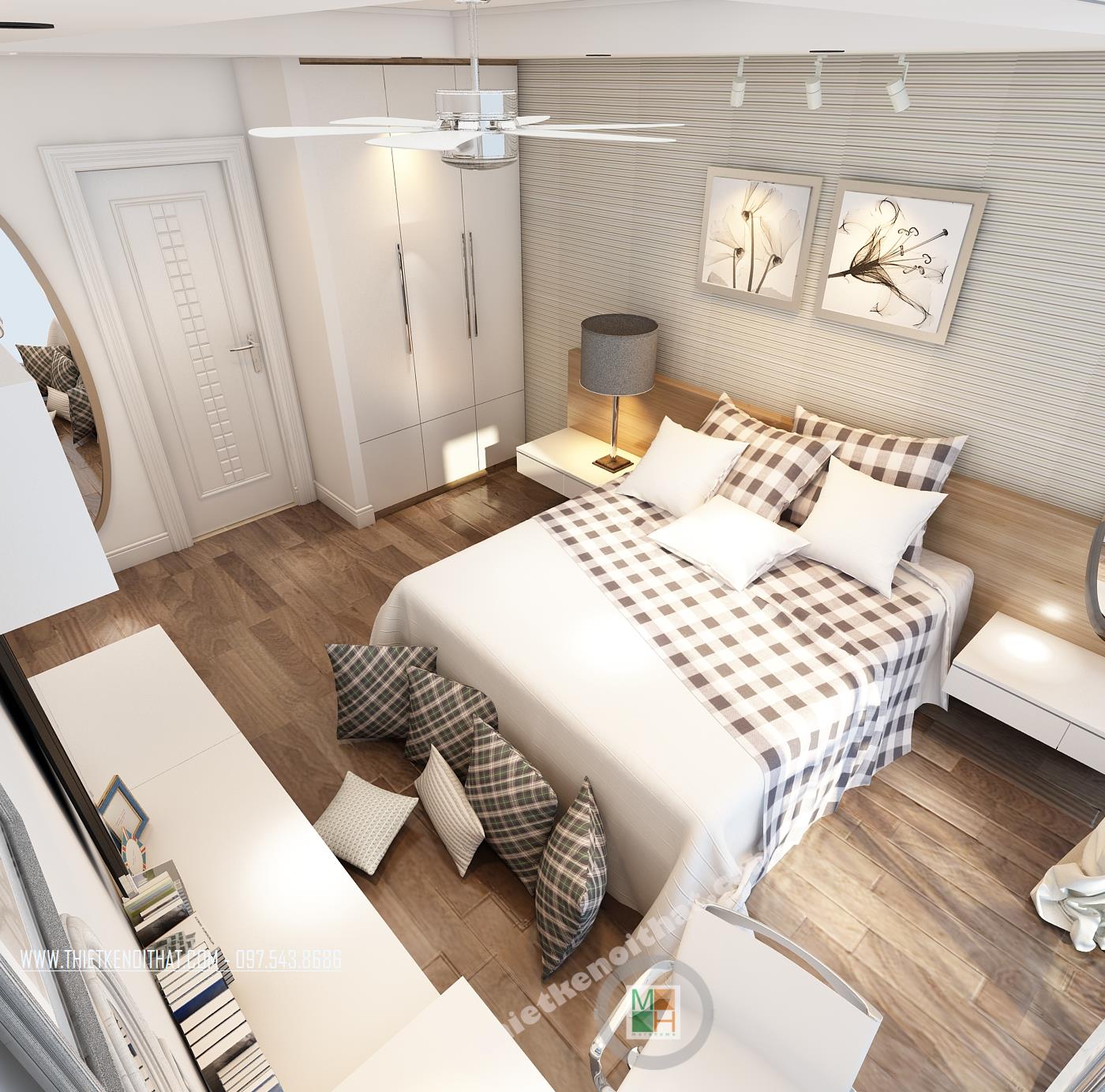 Thiết kế nội thất phòng ngủ sử dụng tông màu trắng làm chủ đạo. Các tủ kệ với thiết kế đơn giản sắp xếp hợp lý tạo độ thoáng cho căn phòng và mang lai tiện nghi cho gia chủ. Đặc biệt là một bức tường được trang trí các đường gân ngang liền mạch giúp tạo hiệu ứng kéo dài không gian. Ngoài ra, gương lớn được sắp xếp hướng ánh sáng tạo độ phản chiếu nhất định làm bừng sáng căn phòng và giúp mang đến cảm giác mở rộng không gian phòng.