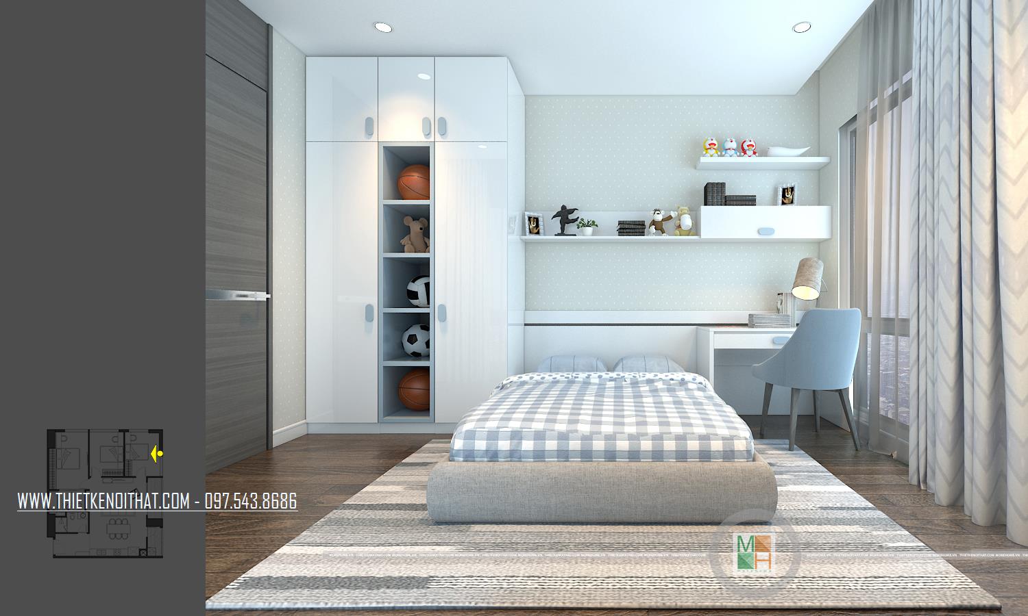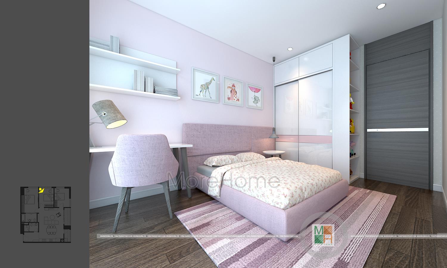 Thiết kế nội thất phòng ngủ trẻ em với 2 phòng, một phòng ngủ bé trai với tông màu xanh nhẹ nhàng và một phòng ngủ bé gái với tông màu hồng đáng yêu. Phòng ngủ bé trai có diện tích rộng hơn nên được bố trí thêm một chiếc kệ tủ trang trí, bàn học của 2 bé đều được đặt cạnh cửa sổ tạo môi trường tốt nhất cho các bé học tập.