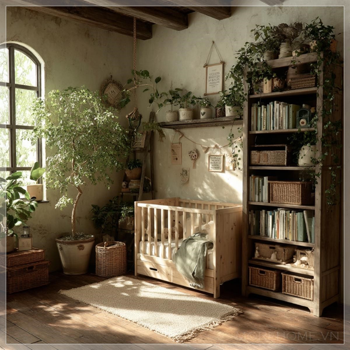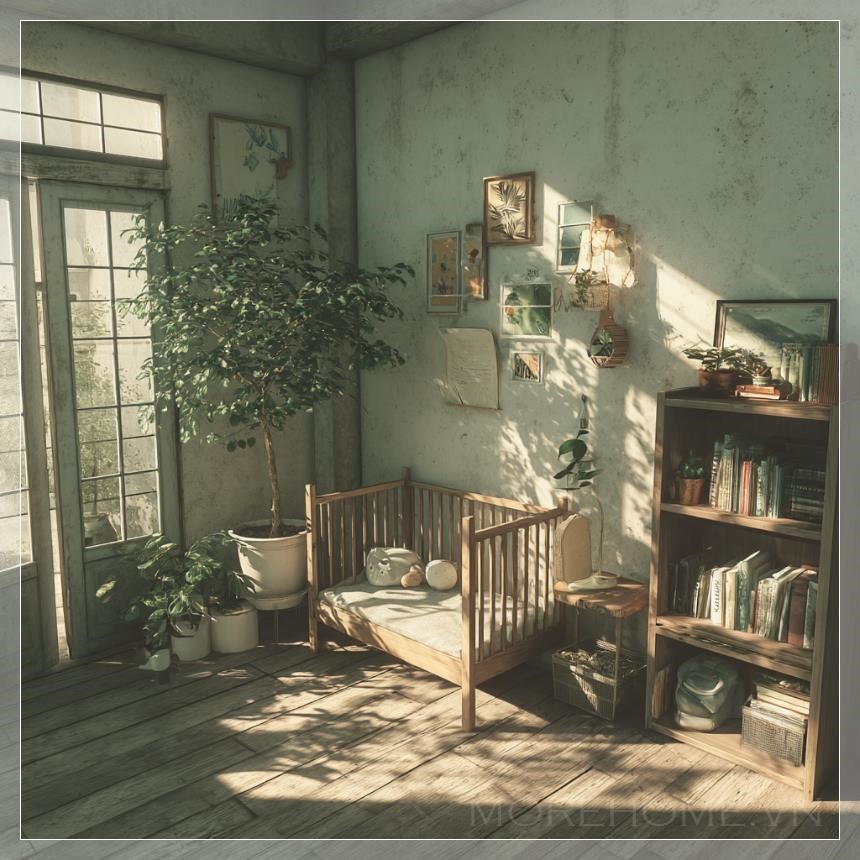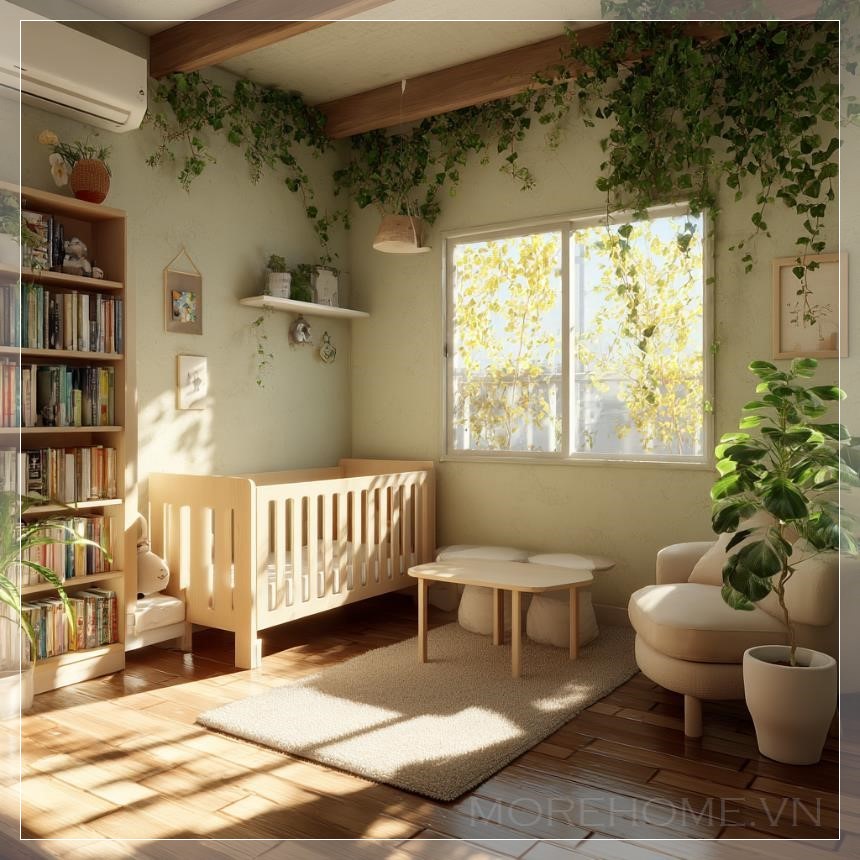 Ngay cạnh chiếc nôi em bé, một chiếc bàn trống đơn giản mang đến cảm giác nhẹ nhàng và yên bình. Những món đồ trang trí được treo trên tường tạo nên một không gian sinh động và đầy màu sắc, như một bức tranh nhỏ giúp làm dịu tâm hồn. Trên tường, một chiếc kệ sách được bố trí tinh tế, chứa đựng những cuốn sách yêu thích, mời gọi những giờ phút thư giãn và học hỏi. Bên cạnh kệ sách, một chậu cây xanh tươi mát được đặt, làm nổi bật không gian và mang lại sự tươi mới, tạo nên một môi trường sống ấm áp và gần gũi. Ánh sáng nhẹ nhàng xuyên qua cửa sổ, làm tôn lên sự hài hòa giữa thiên nhiên và không gian nội thất, đem đến cảm giác thư thái và an lành cho mỗi thành viên trong gia đình.