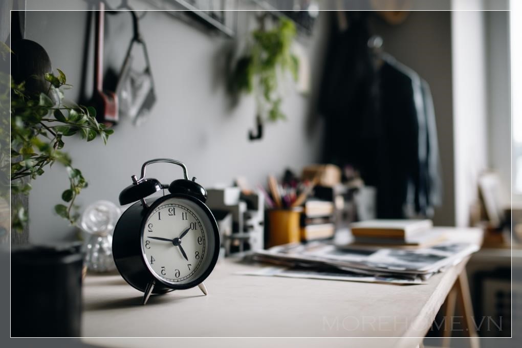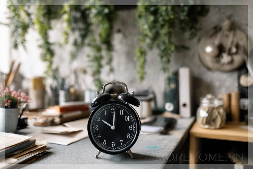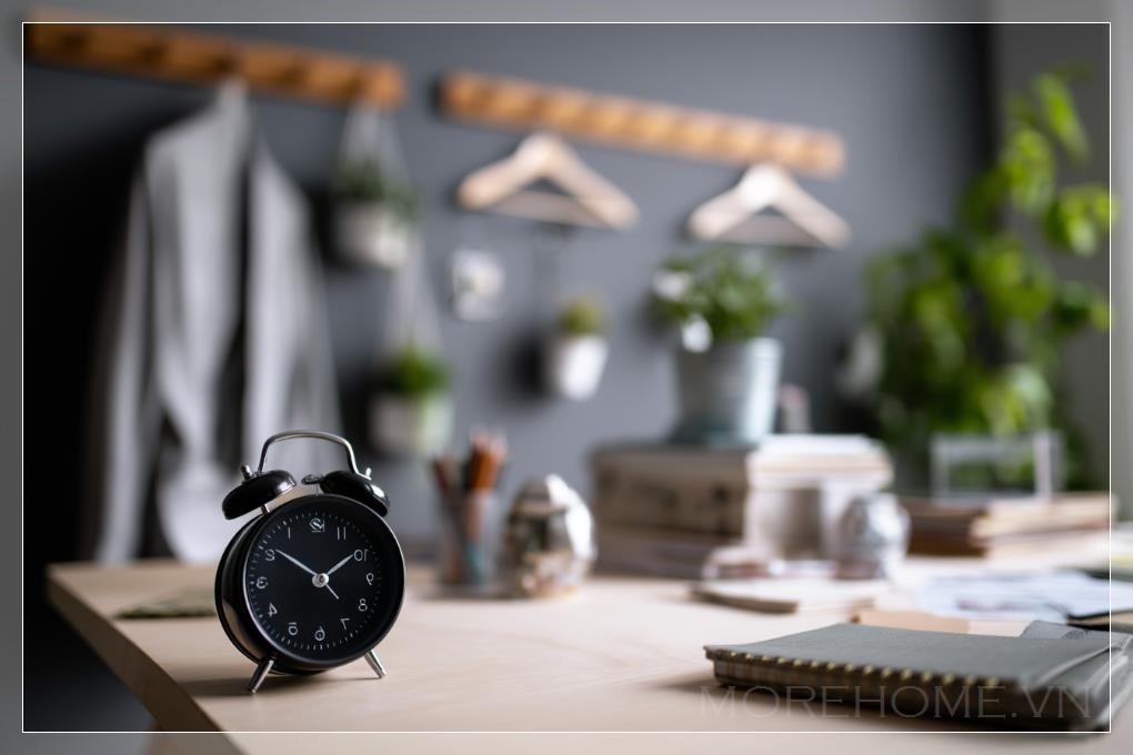 Trước mặt bàn làm việc, chiếc đồng hồ báo thức màu đen nằm yên tĩnh, nhịp tích tắc của nó vang lên từng giây trong không gian. Bên cạnh nó là những cuốn sách, tờ giấy và các vật dụng khác, tạo nên một cảnh tượng vừa quen thuộc lại vừa có sức hút. Màu xám nhẹ của những bức tường trong phòng như làm nổi bật lên những chi tiết tinh tế của không gian, tạo cảm giác trầm lắng, nhưng cũng đầy sức mạnh của sự tổ chức và kỷ luật.