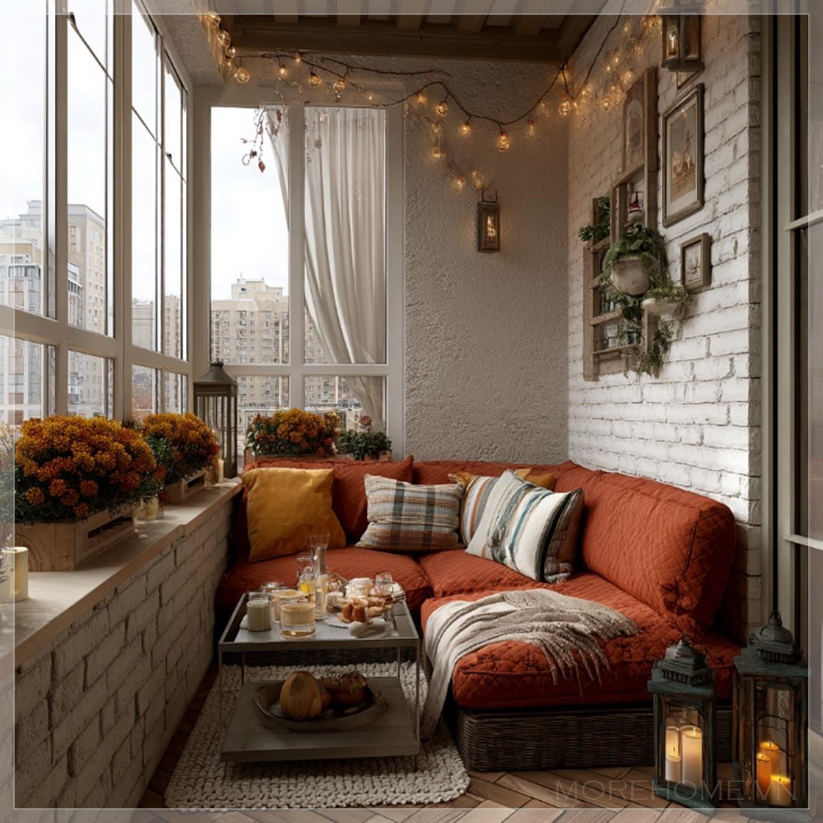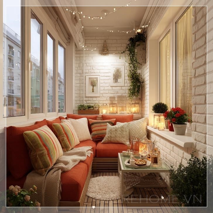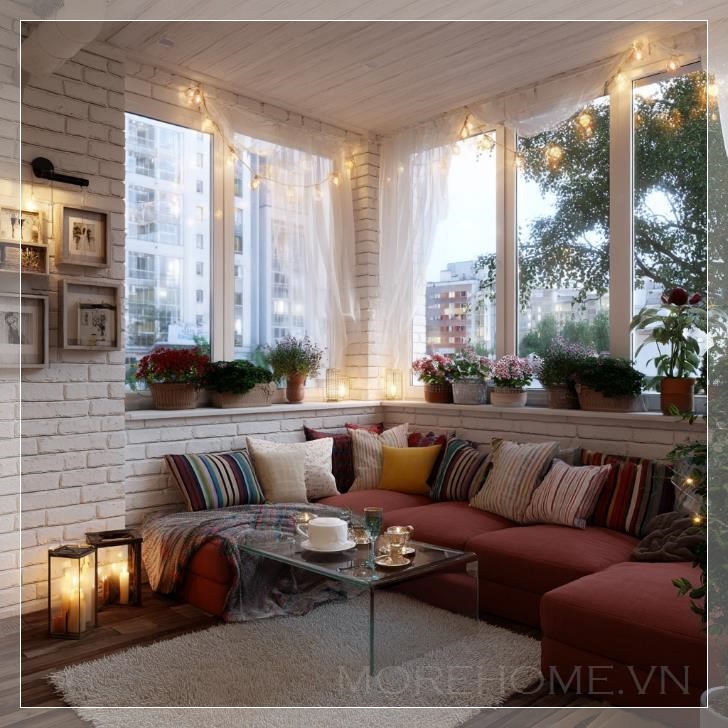 Loggia rộng lớn này được tách biệt với căn bếp bằng một cửa sổ lớn với bệ cửa sổ rộng, tạo không gian thoáng đãng và đầy sức sống. Trên bệ cửa sổ, những chậu hoa nở rực rỡ tỏa hương thơm nhẹ nhàng, làm sáng bừng không gian. Các bức tường của loggia được hoàn thiện bằng gạch trắng, mang lại cảm giác thanh thoát và hiện đại. Một dải đèn nháy lấp lánh trên một trong các bức tường, tạo ra bầu không khí lãng mạn vào mỗi buổi tối.