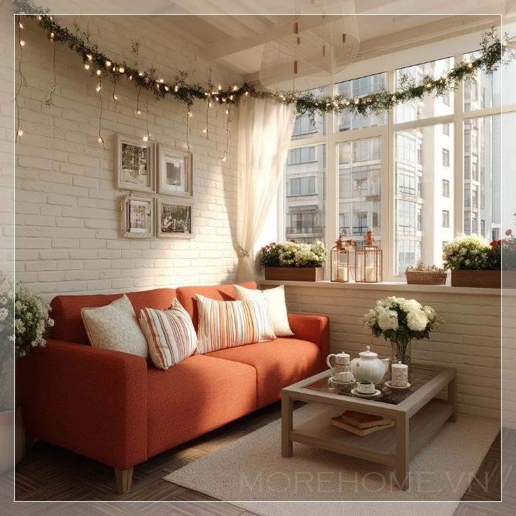 Bên cạnh chiếc sofa là một bàn kính nhỏ với một bộ trà, bánh ngọt và những ngọn nến lung linh. Buổi tối buông xuống, ánh sáng từ những chiếc đèn lồng ngoài cửa sổ phản chiếu qua không gian, cùng với ánh sáng của dải đèn nháy trên tường, mang lại một bầu không khí ấm áp và lãng mạn. Các bức ảnh gia đình được treo trên tường, ghi dấu những khoảnh khắc ấm áp trong cuộc sống, càng làm tăng thêm vẻ đẹp và sự gần gũi của không gian này.