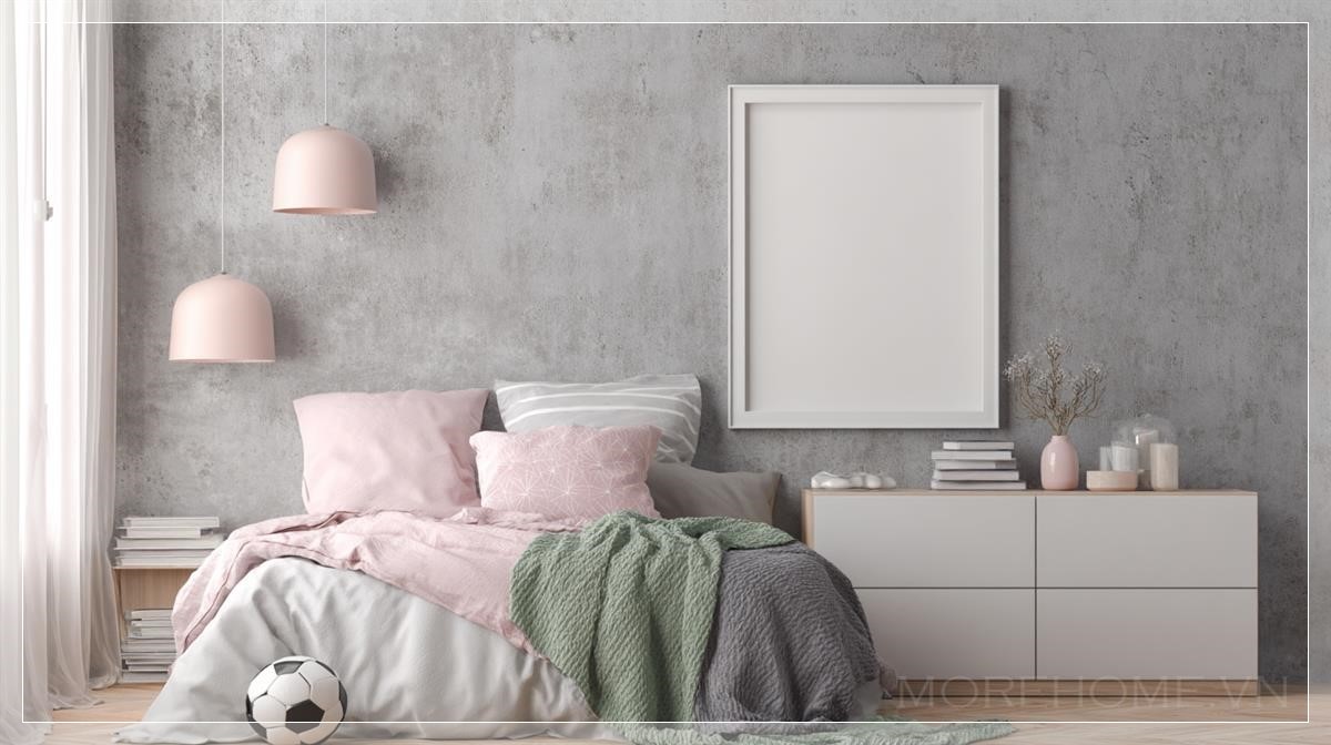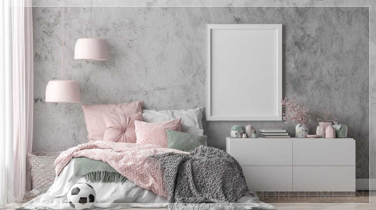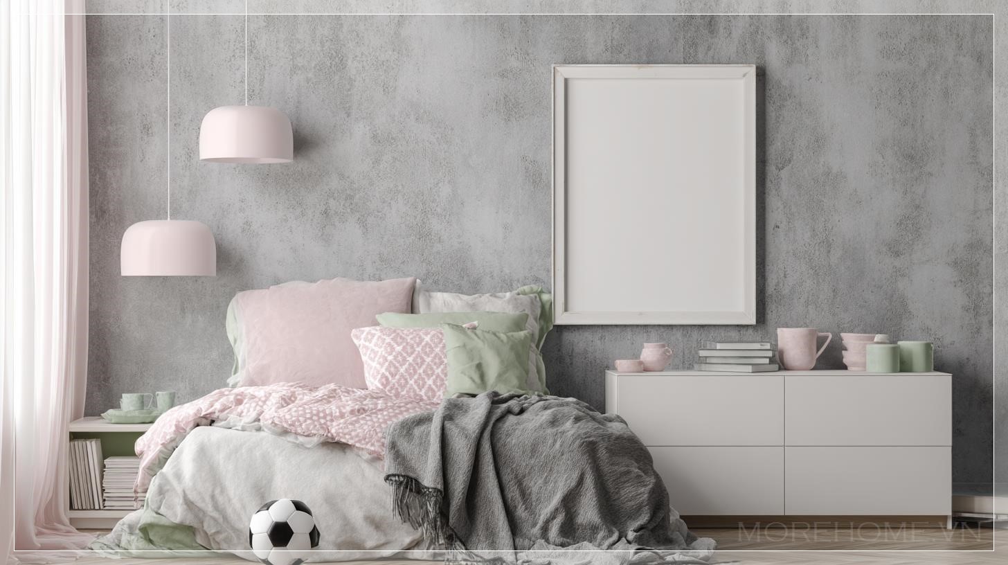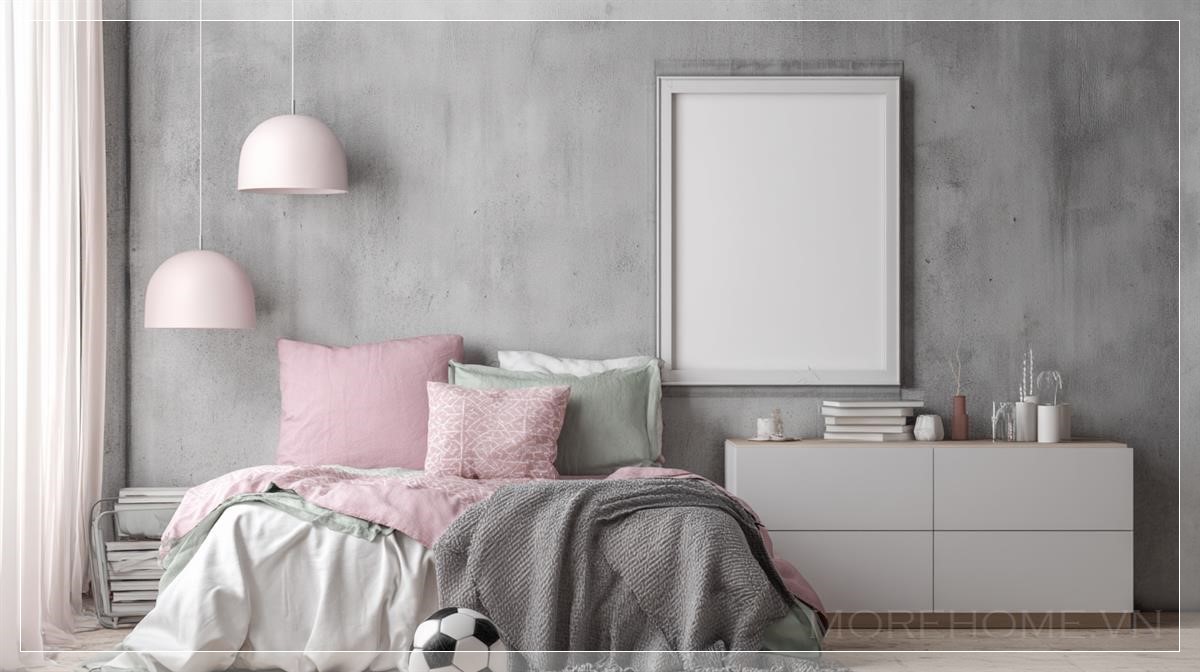 Không gian phòng ngủ cô gái hiện đại này mang đậm ảnh hưởng từ phong cách Scandinavian, kết hợp với tông màu hồng nhạt, xám mềm mại, xanh lá nhạt và trắng, tạo nên một không gian nhẹ nhàng, ấm cúng. Chiếc giường êm ái, phủ đầy chăn bông và gối trang trí, tạo cảm giác dễ chịu và thư giãn. Bức tường bê tông xám với kết cấu đặc biệt, nổi bật sự đơn giản nhưng không kém phần tinh tế, là nền tảng lý tưởng cho không gian này.