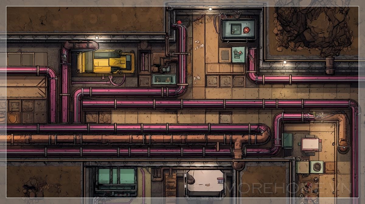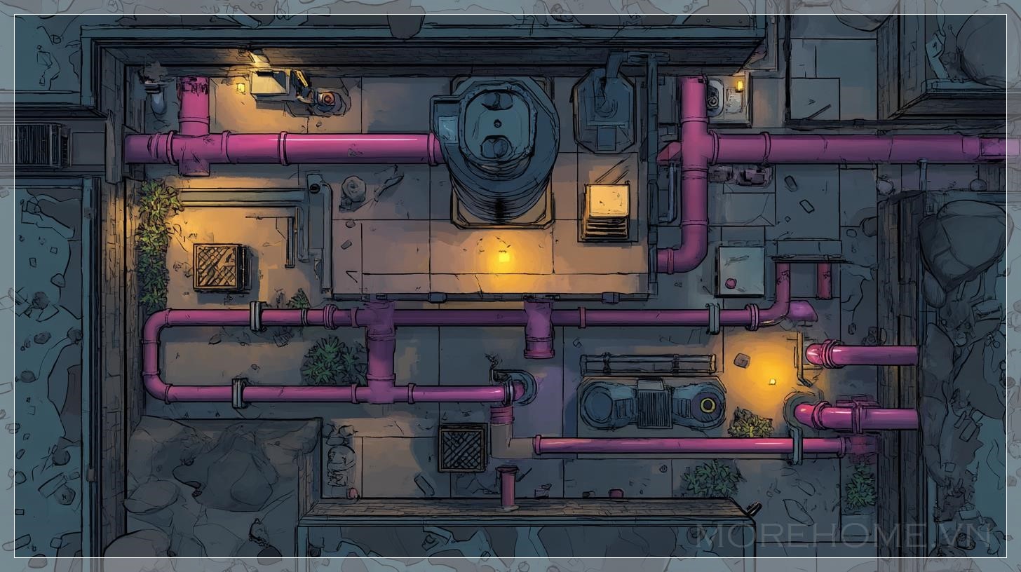 Khi bước vào không gian dưới lòng đất của một thành phố cyberpunk, nơi ánh sáng mờ ảo và những đường ống dịch vụ chạy dọc như những mạch máu của một cơ thể, bạn sẽ cảm nhận ngay được sự sống động và kỳ bí của không gian này. Những ống cống nhỏ hẹp, những mảng gạch rêu phong, và những mảnh vụn của các công trình đang được cải tạo tạo nên một bức tranh không hoàn hảo nhưng đầy quyến rũ. Dưới mỗi lớp bụi và mảnh vụn, một câu chuyện chưa kể đang chờ đợi.